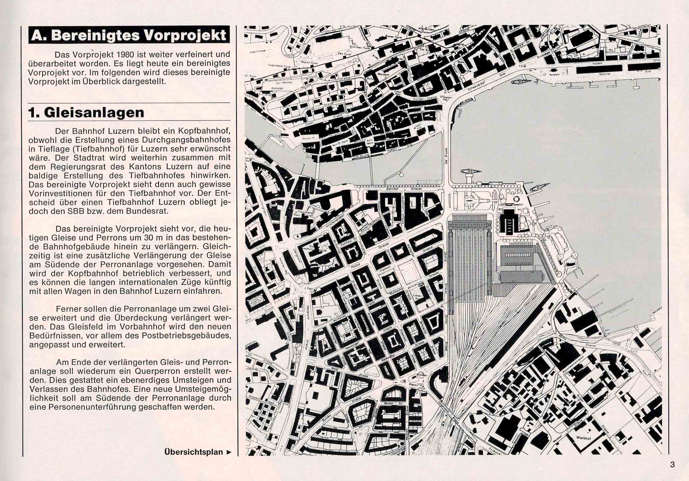 «Der Bahnhof Luzern bleibt ein Kopfbahnhof, obwohl die Erstellung eines Durchgangsbahnhofes in Tieflage (Tiefbahnhof) für Luzern sehr erwünscht wäre. Der Stadtrat wird weiterhin zusammen mit dem Regierungsrat des Kantons Luzern auf eine baldige Erstellung des Tiefbahnhofes hinwirken. Das bereinigte Vorprojekt sieht denn auch gewisse Vorinvestitionen für den Tiefbahnhof vor. Der Entscheid über einen Tiefbahnhof Luzern obliegt je doch den SBB bzw. dem Bundesrat.»