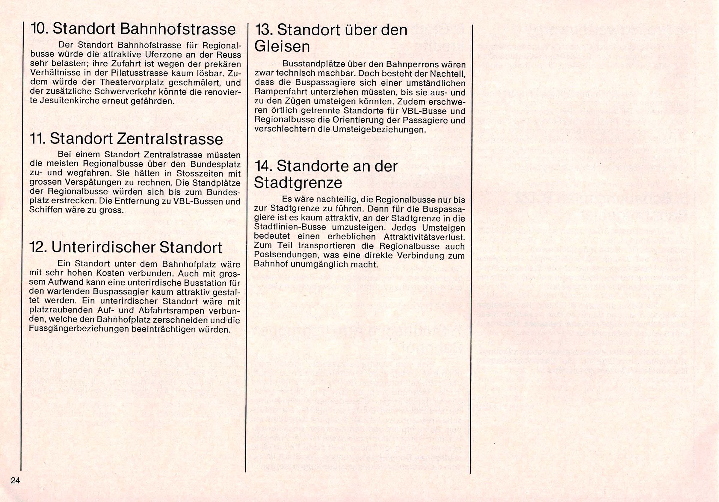 Der Standort Bahnhofstrasse für Regionalbusse würde die attraktive Uferzone an der Reuss sehr belasten; ihre Zufahrt ist wegen der prekären Verhältnisse in der Pilatusstrasse kaum lösbar. Zudem würde der Theatervorplatz geschmälert, und der zusätzliche Schwerverkehr könnte die renovierte Jesuitenkirche erneut gefährden.»
