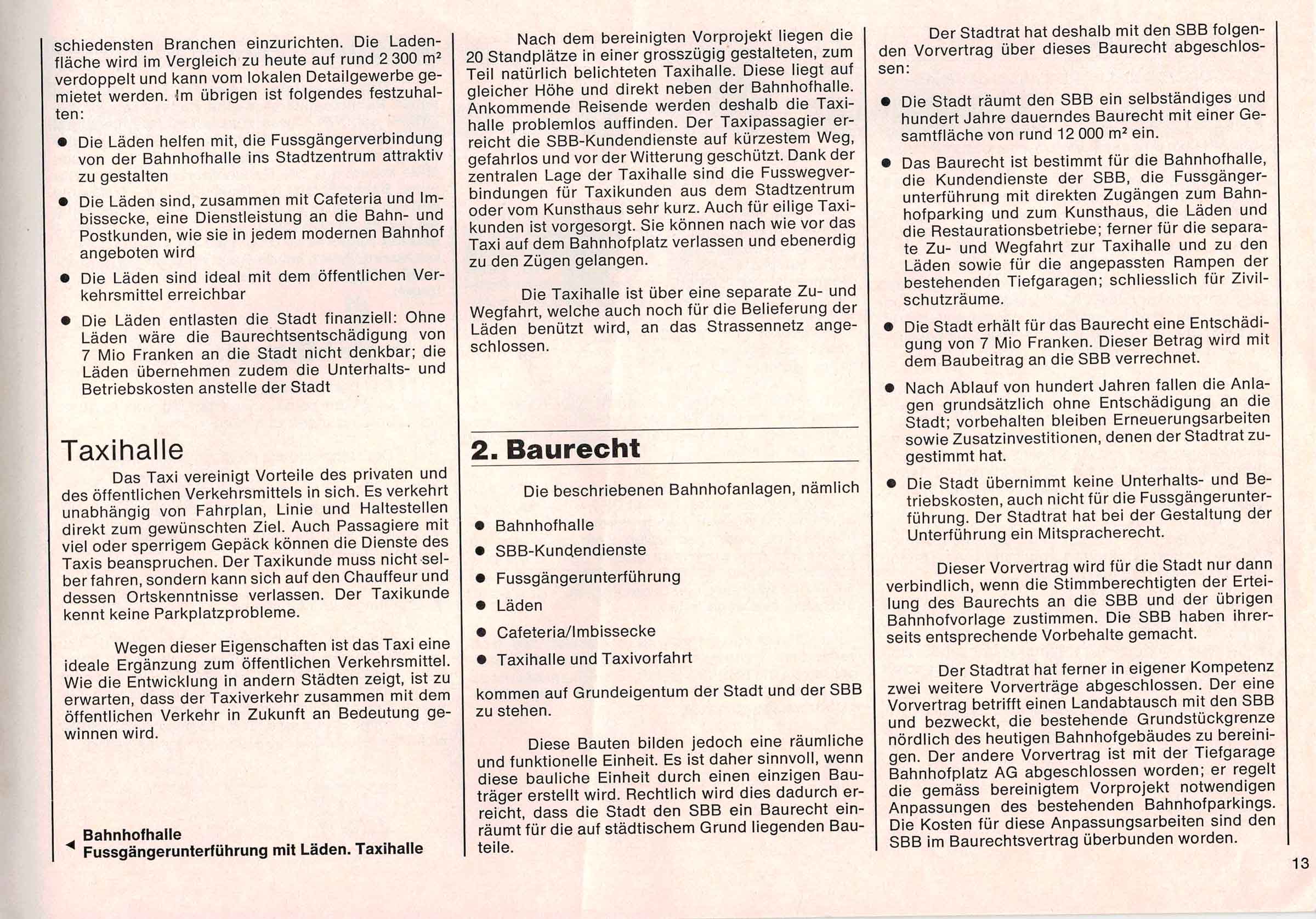 Nach dem bereinigten Vorprojekt liegen die 20 Standplätze in einer grosszügig gestalteten, zum Teil natürlich belichteten Taxihalle. Diese liegt auf gleicher Höhe und direkt neben der Bahnhofhalle. Ankommende Reisende werden deshalb die Taxihalle problemlos auffinden. Der Taxipassagier erreicht die SBB-Kundendienste auf kürzestem Weg, gefahrlos und vor der Witterung geschützt. Dank der zentralen Lage der Taxihalle Sind die Fusswegverbindungen für Taxikunden aus dem Stadtzentrum oder vom Kunsthaus sehr kurz. Auch für eilige Taxikunden ist vorgesorgt. Sie können nach wie vor das Taxi auf dem Bahnhofplatz verlassen und ebenerdig zu den Zügen gelangen.