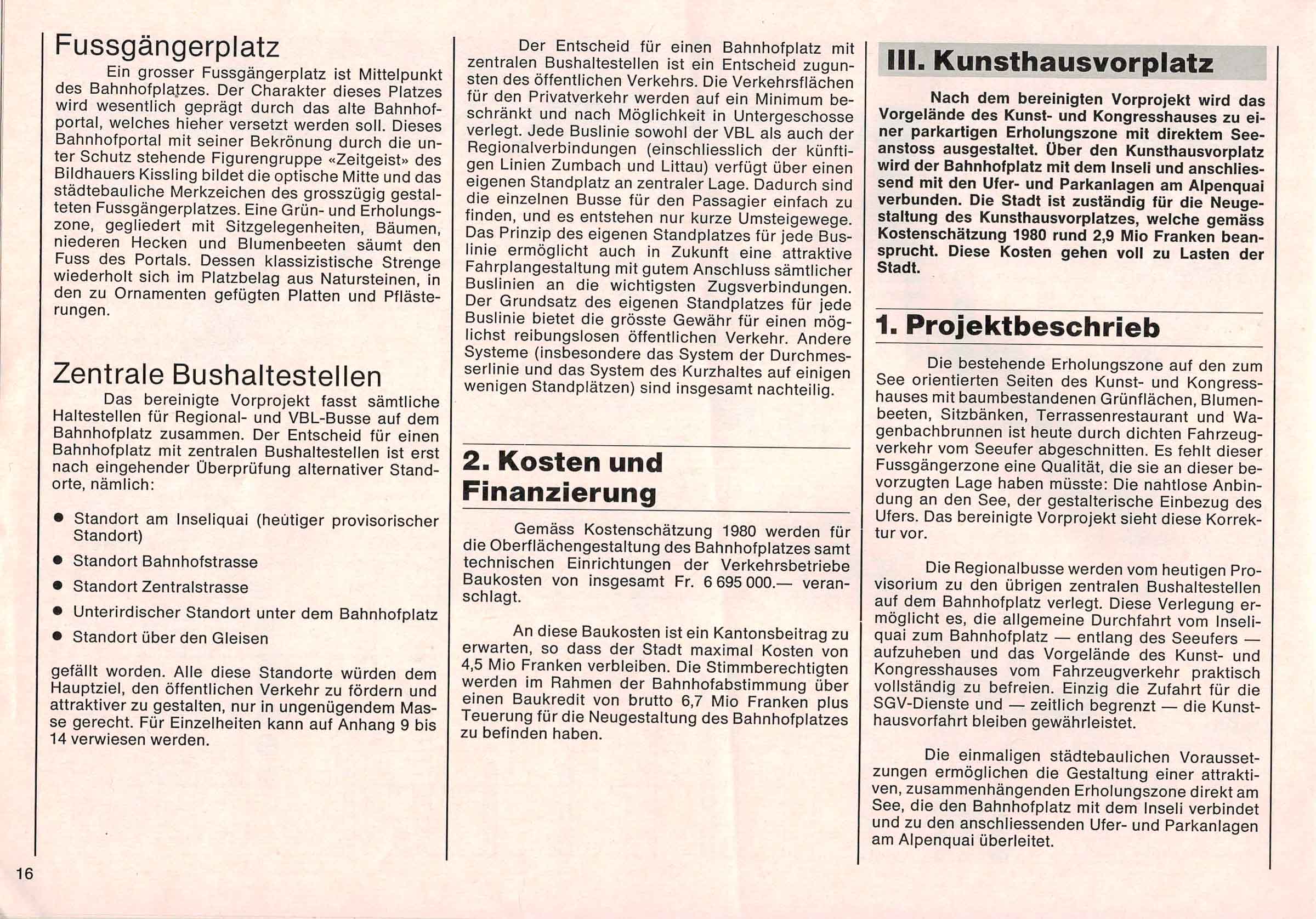 «Der Entscheid für zentrale Bushaltestellen auf dem Bahnhofplatz ist erst nach Uberprüfung verschiedener alternativer Standorte gefallen. Alle diese Standorte werden dem Hauptziel, den öffentlichen Verkehr zu fördern und ihn attraktiver zu machen, nicht gerecht.