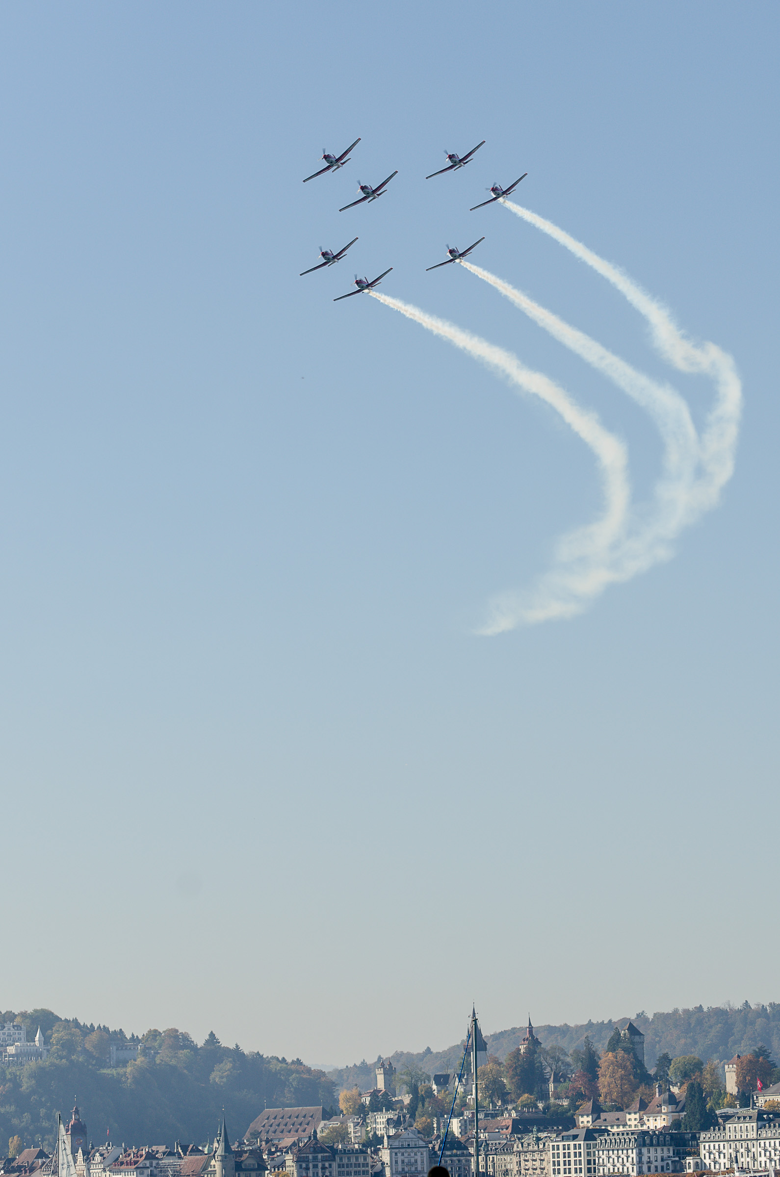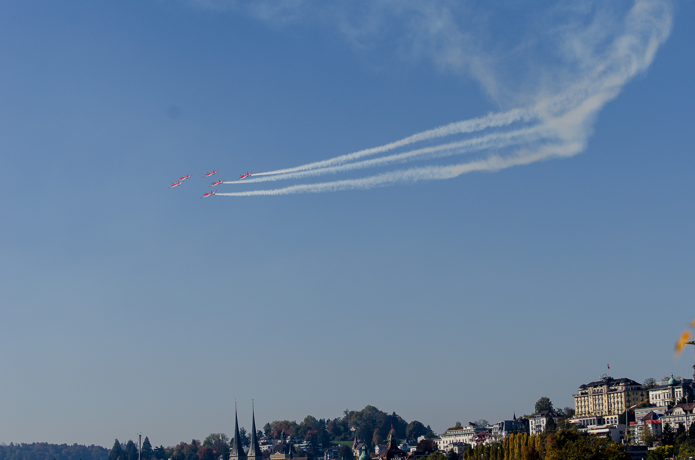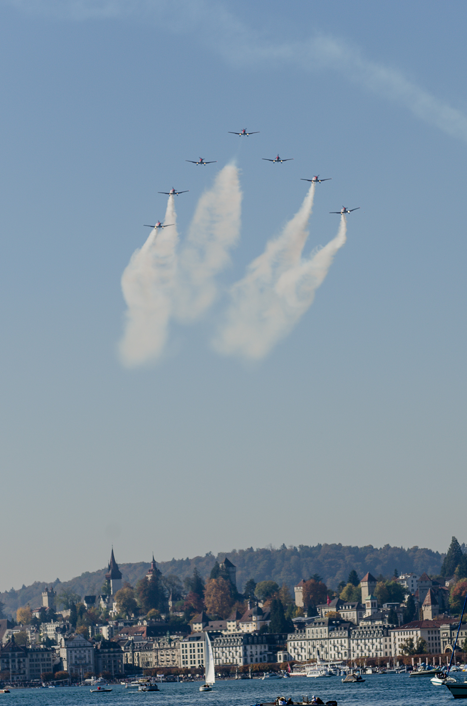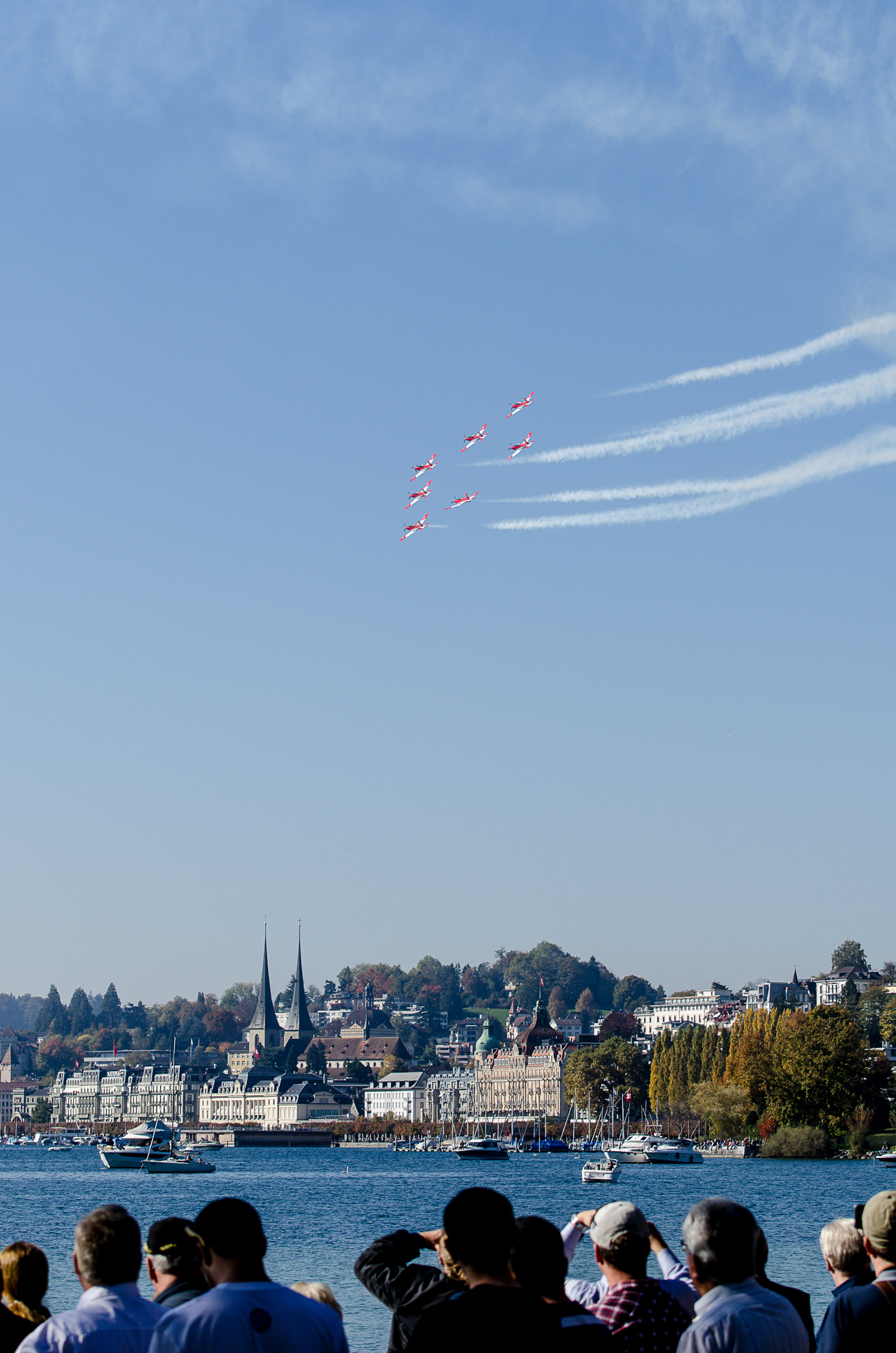 Ab 14:15 fliegt das PC-7 Team über die Köpfe der wartenden Zuschauer. Der Photograph neben mir schaut, wo es das beste Luzerner PC7 Photo gibt. Die Ansage, dass die Show pünktlich beginnt, lässt die angereisten Zuschauer, ob 3 Stunden mit der Bahn angereist aus Schaffhausen oder Besucher aus dem Würzenbachquartier, hinter dem Verkehrshaus, die Augen in den Himmel schweifen.