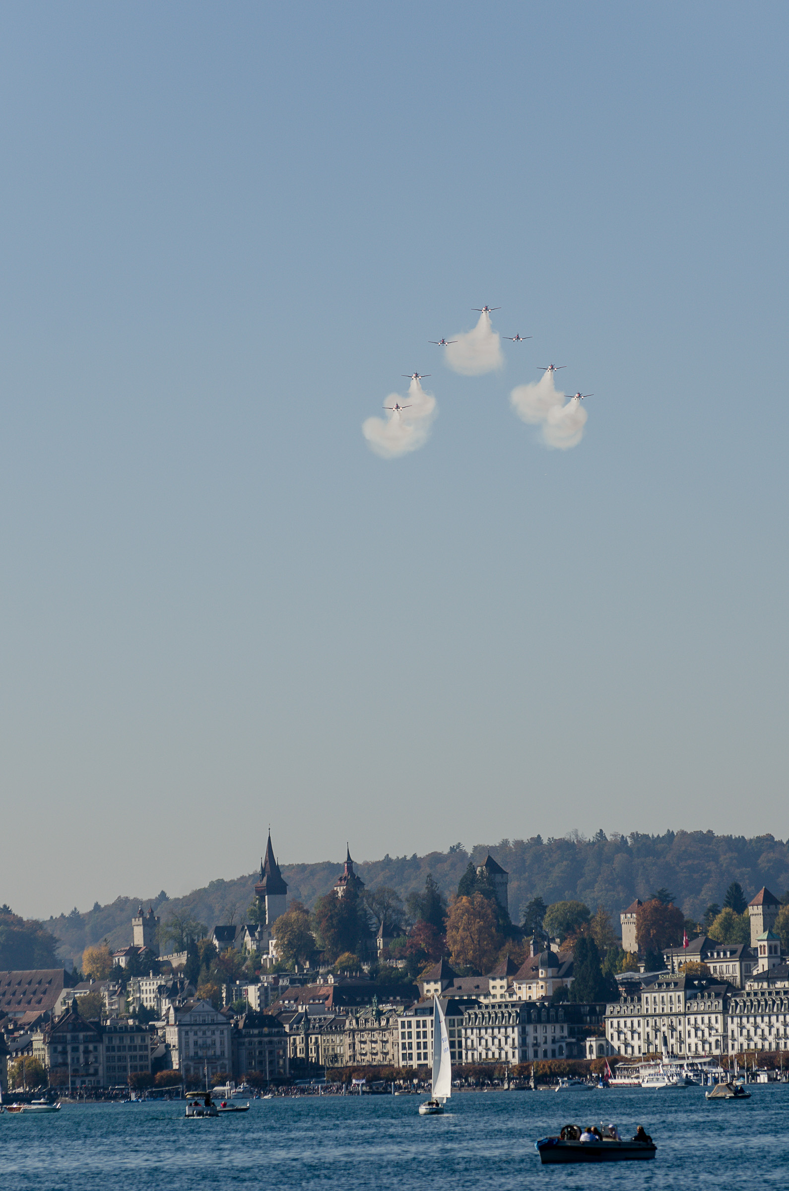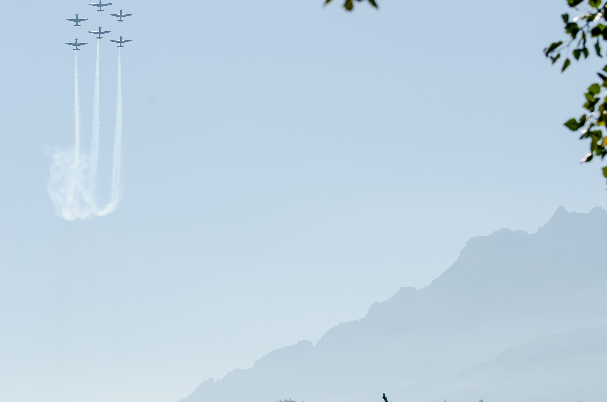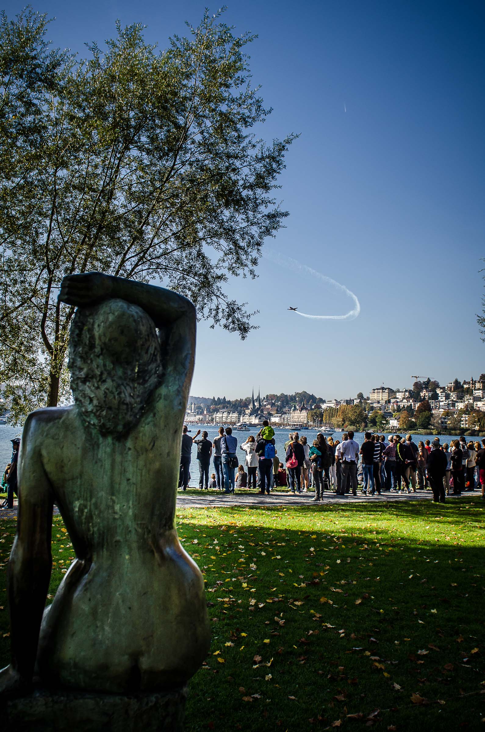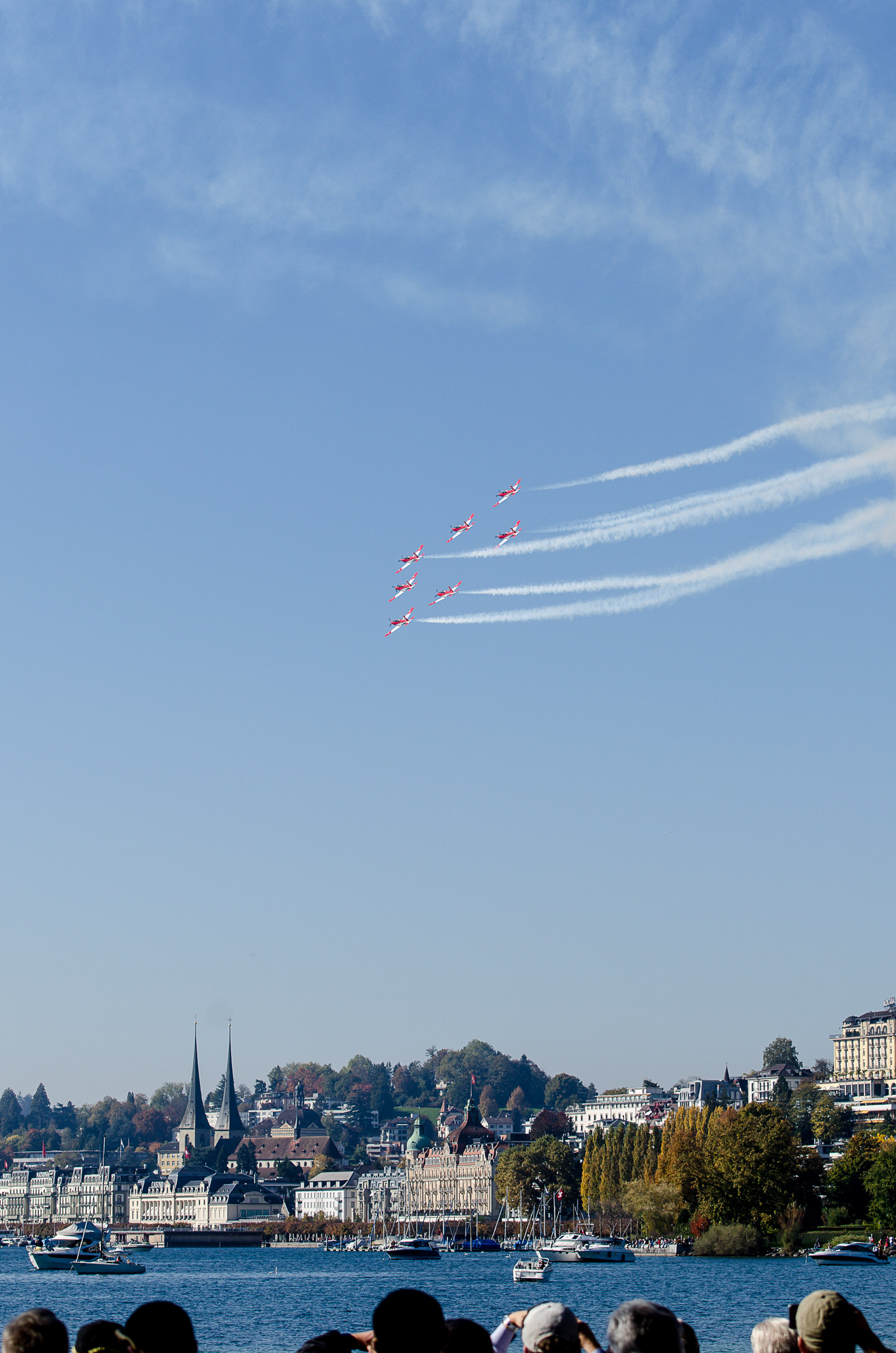 Ab 14:15 fliegt das PC-7 Team über die Köpfe der wartenden Zuschauer. Der Photograph neben mir schaut, wo es das beste Luzerner PC7 Photo gibt. Die Ansage, dass die Show pünktlich beginnt, lässt die angereisten Zuschauer, ob 3 Stunden mit der Bahn angereist aus Schaffhausen oder Besucher aus dem Würzenbachquartier, hinter dem Verkehrshaus, die Augen in den Himmel schweifen.