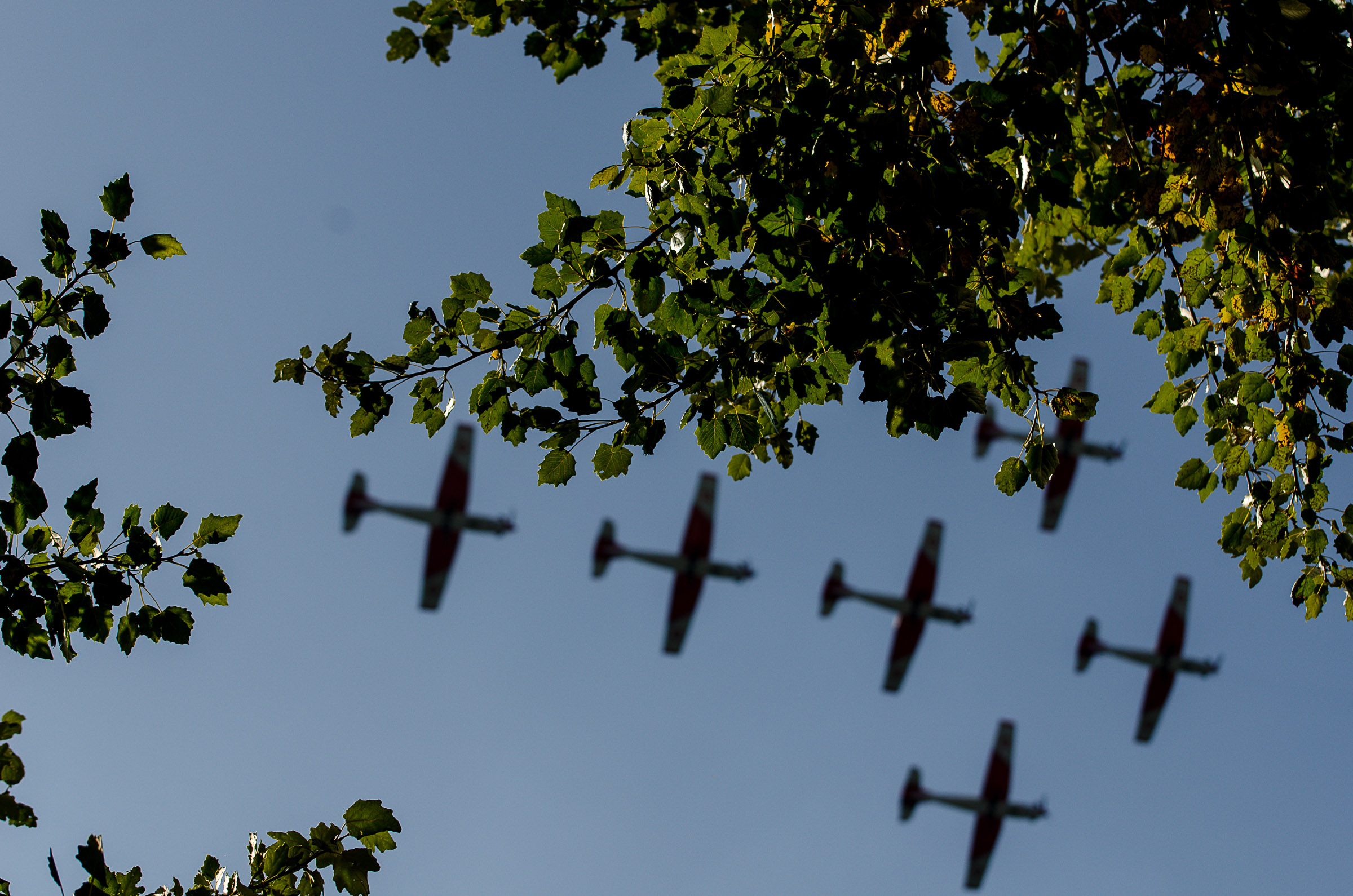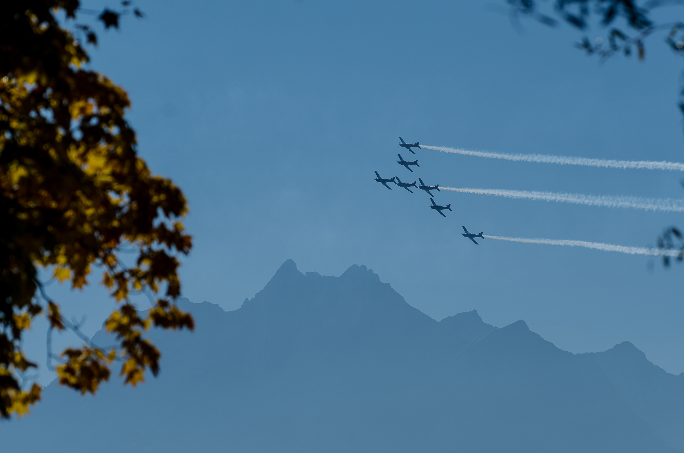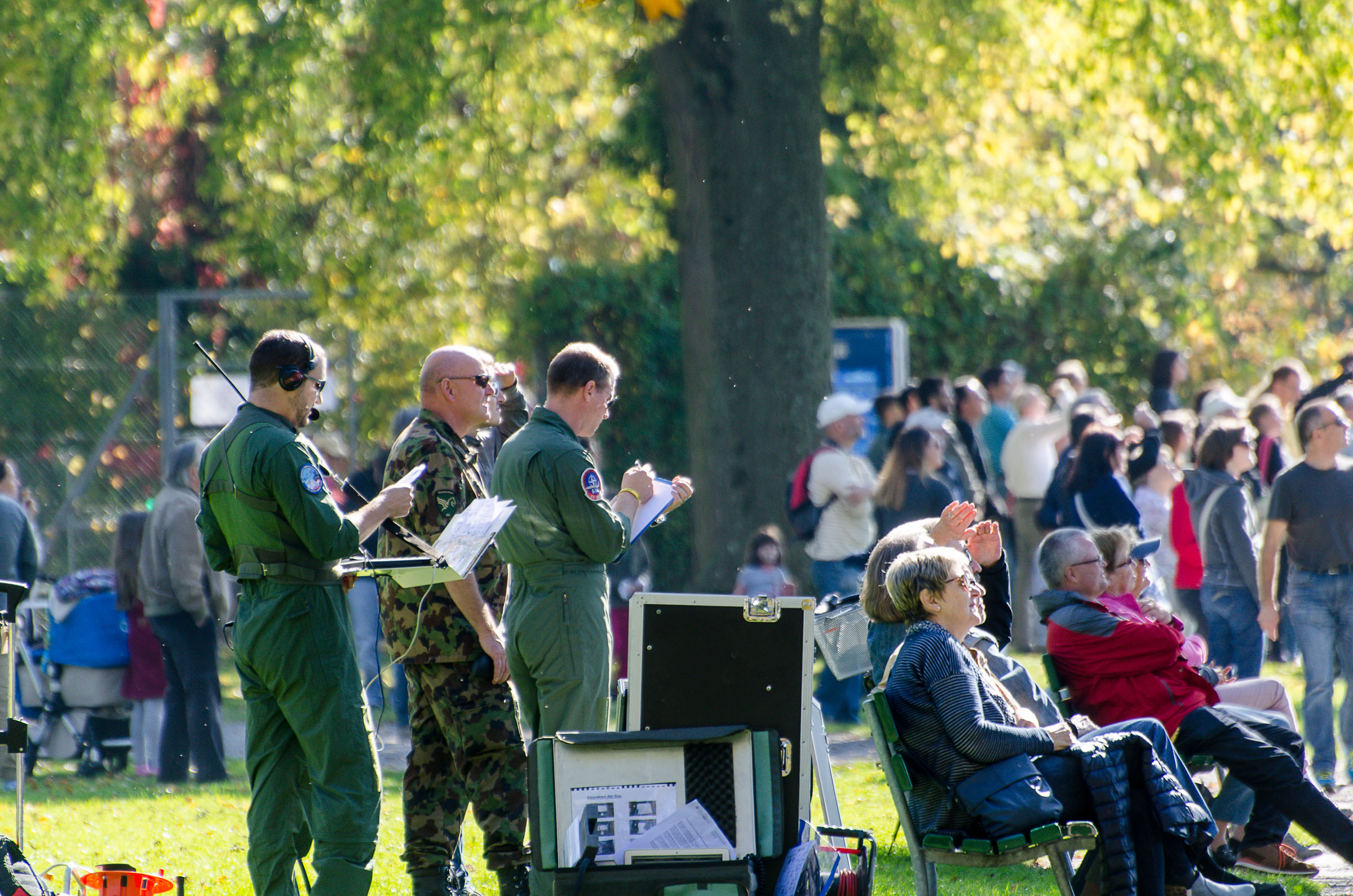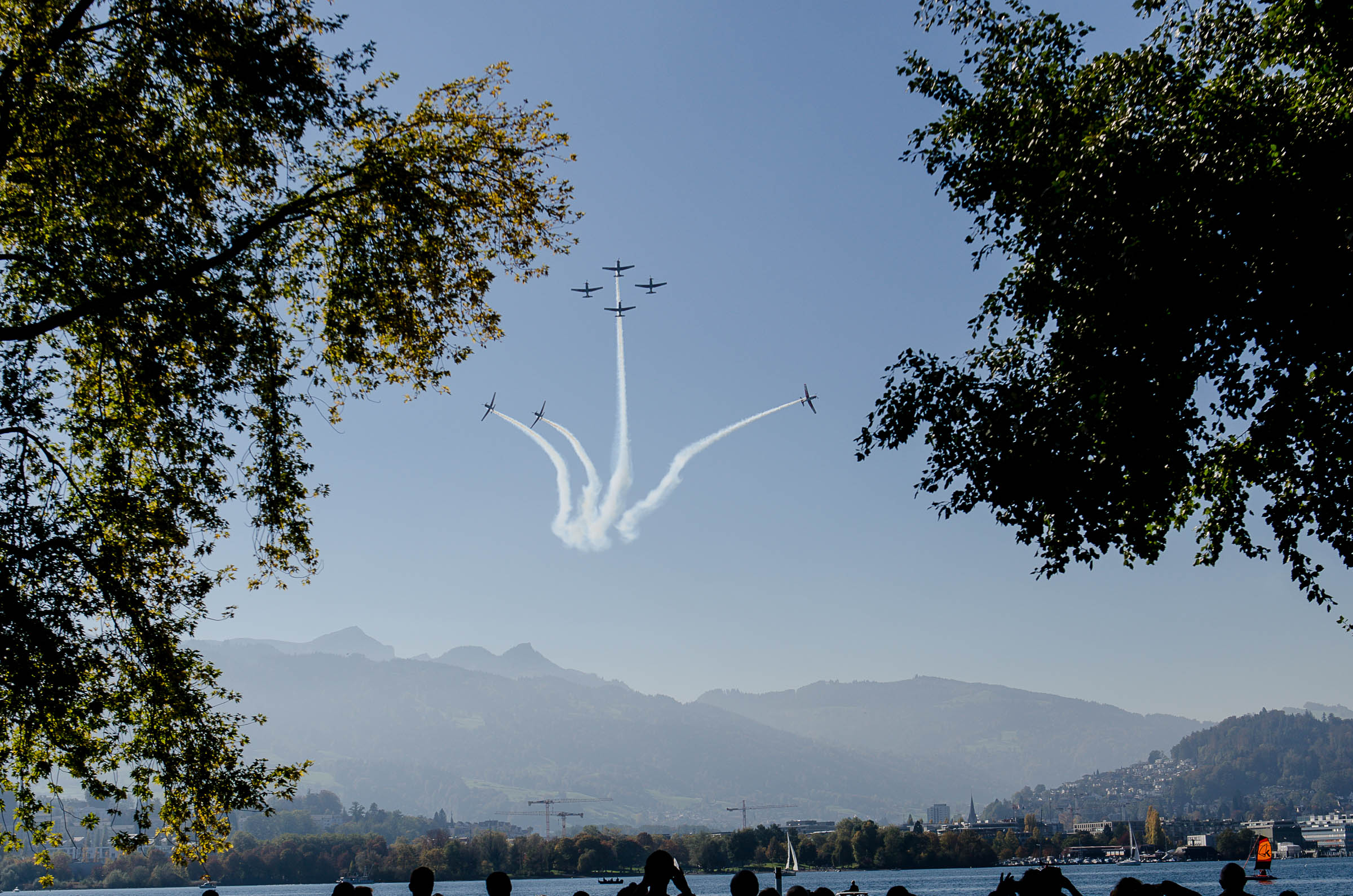 Ab 14:15 fliegt das PC-7 Team über die Köpfe der wartenden Zuschauer. Der Photograph neben mir schaut, wo es das beste Luzerner PC7 Photo gibt. Die Ansage, dass die Show pünktlich beginnt, lässt die angereisten Zuschauer, ob 3 Stunden mit der Bahn angereist aus Schaffhausen oder Besucher aus dem Würzenbachquartier, hinter dem Verkehrshaus, die Augen in den Himmel schweifen.