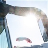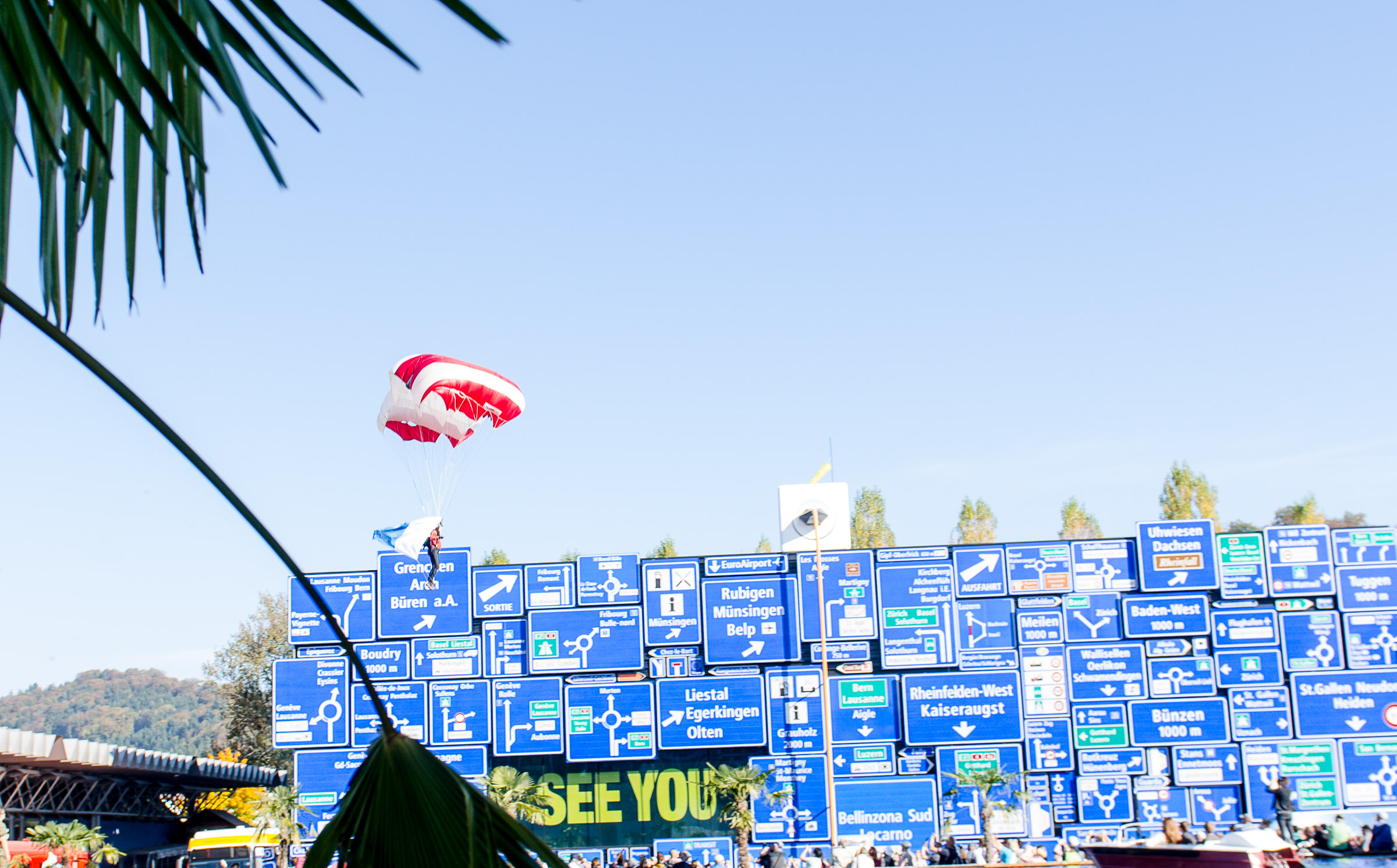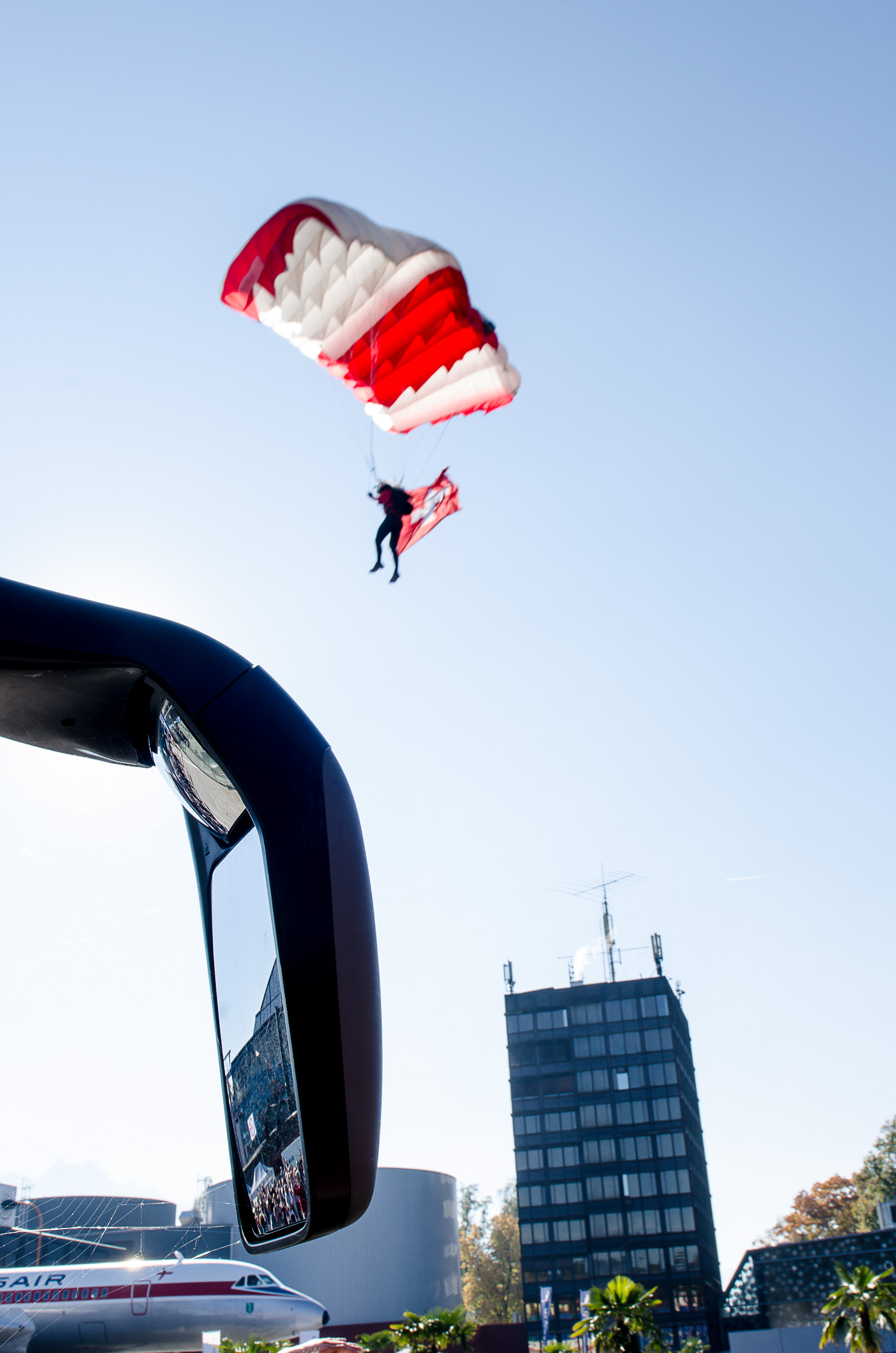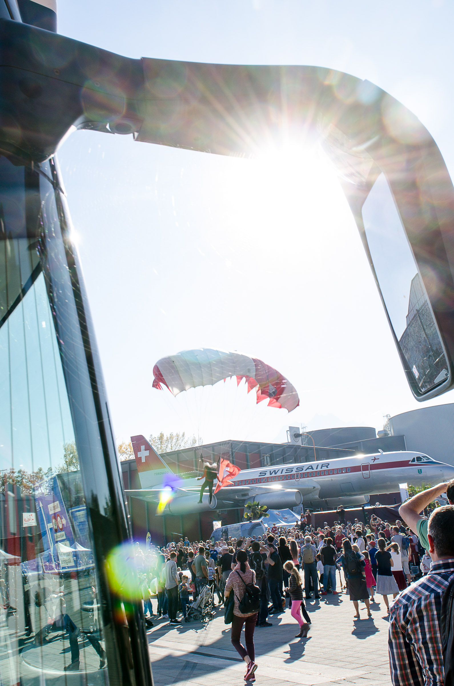 Die Dame sitzt seelenruhig auf ihrem Podest, als die Show vorbei ist und im Verkehrshaus eine Punktlandung der Fallschirmspringer angesagt ist.