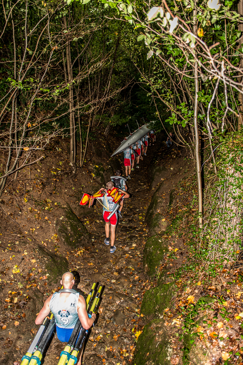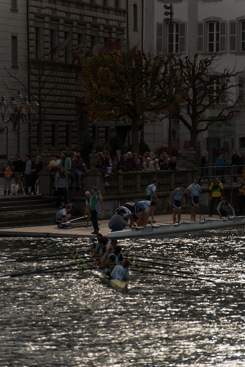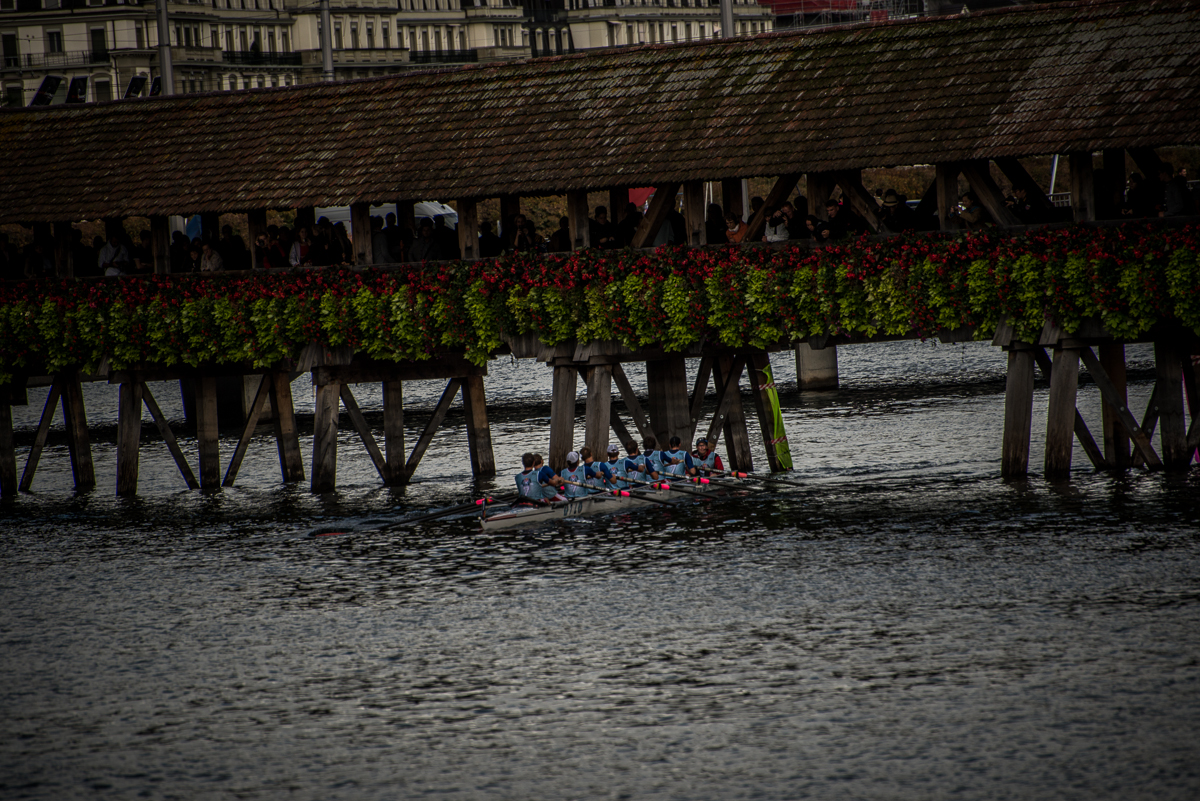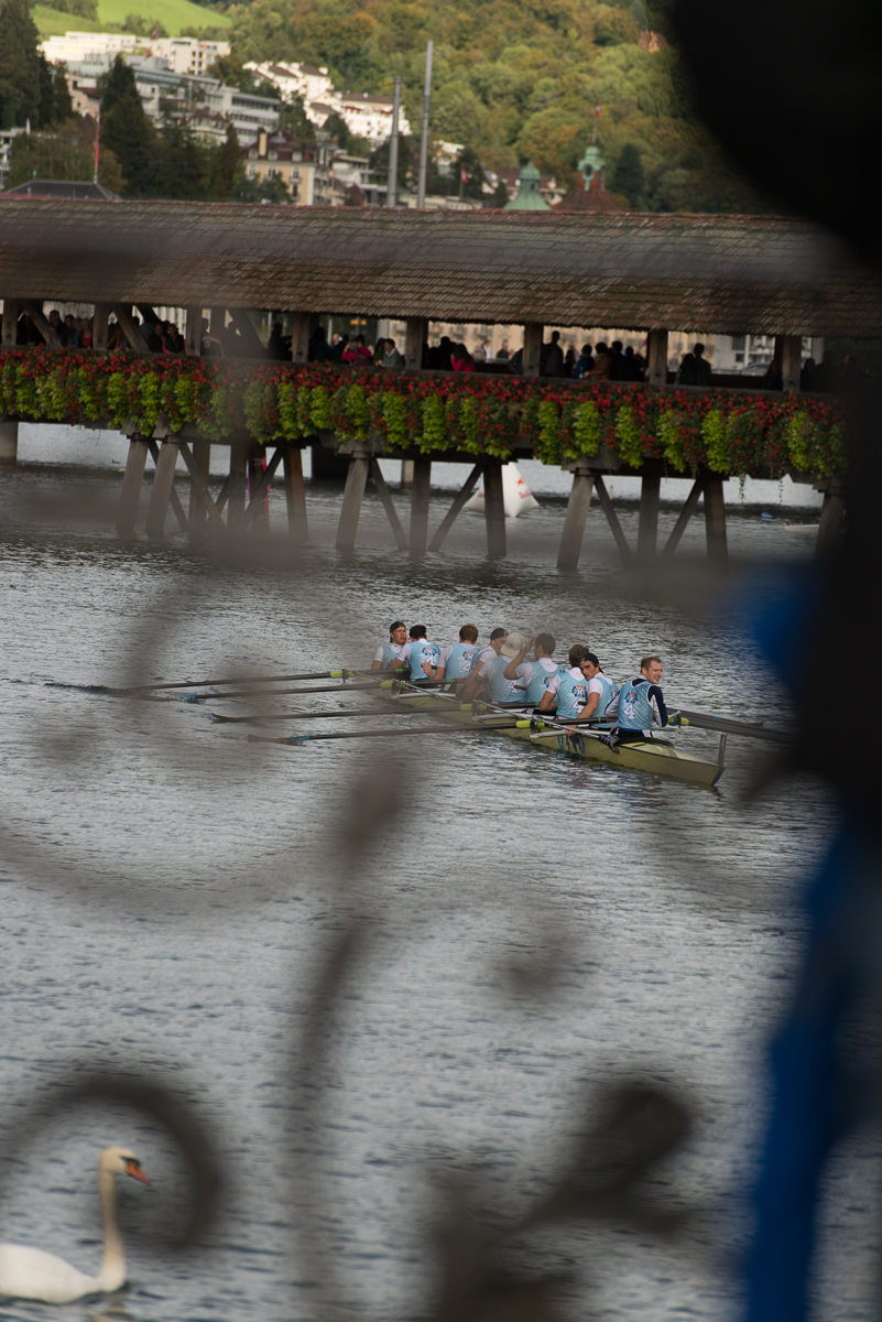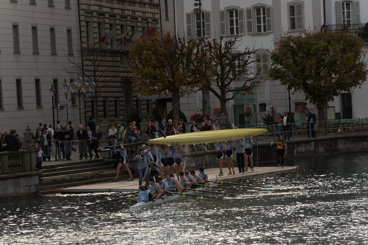 Durch die Hohlen Gasse in Küssnacht kommt heute kein Gessler durch. Die Platzverhältnisse sind viel zu knapp für die 21 Achterboote die in Zug gestartet sind. Das Ziel: Luzern zu erreichen zu Fuss über Asphalt und zu Wasser. In Immensee heisst es aus dem Boot, Ruder zusammenschnüren und ab auf die Strasse. 100 kg ein Boot, getragen von den Rudern nach Küssnacht über Stock und Stein. Durch die Hohlen Gasse wird es eng. Die Zuschauer stehen am Eingang zur Gasse. Der Kampf durch die glitschige Gasse beginnt. Boot drehen, verlorenes Maskotchen holen, weiter geht’s, die Steuerfrau gibt Anweisung, drehen! Go go!