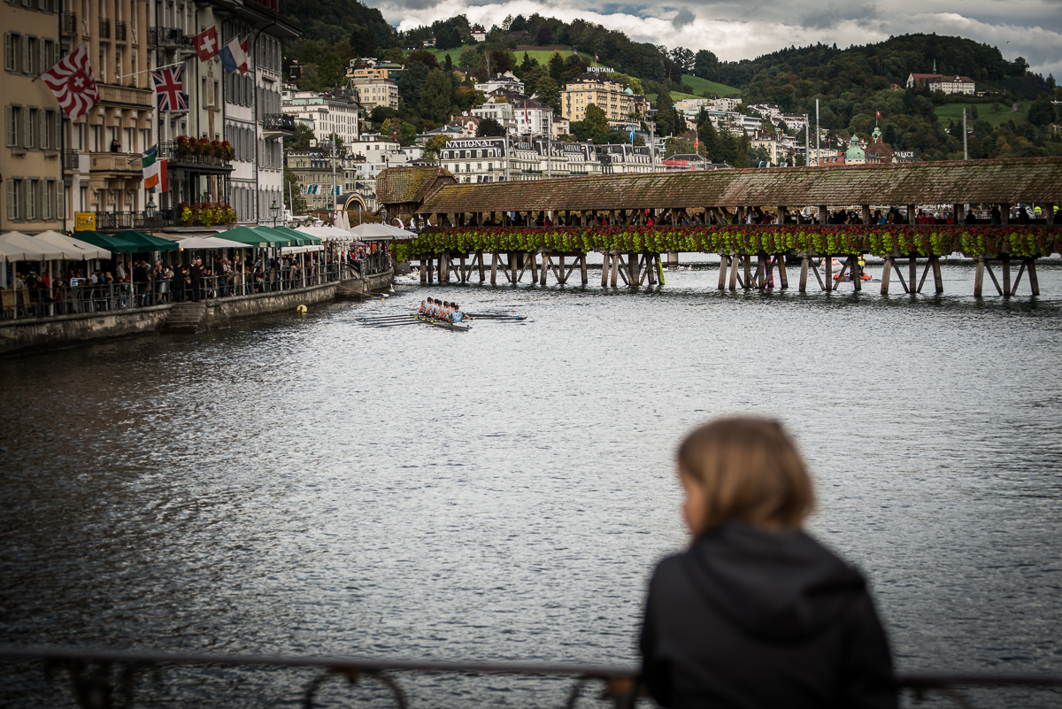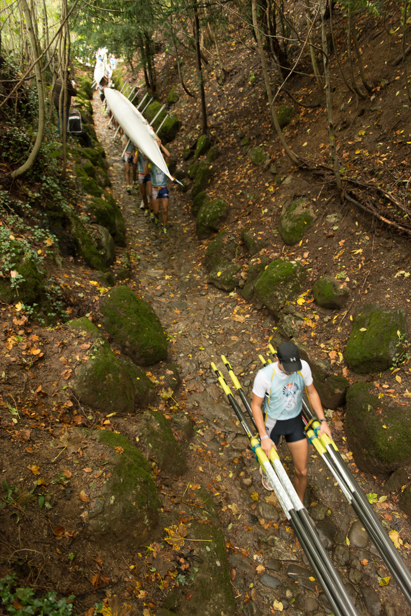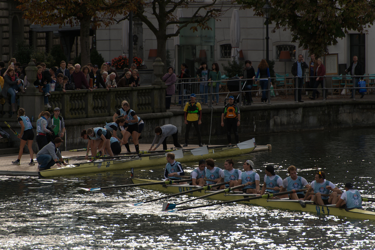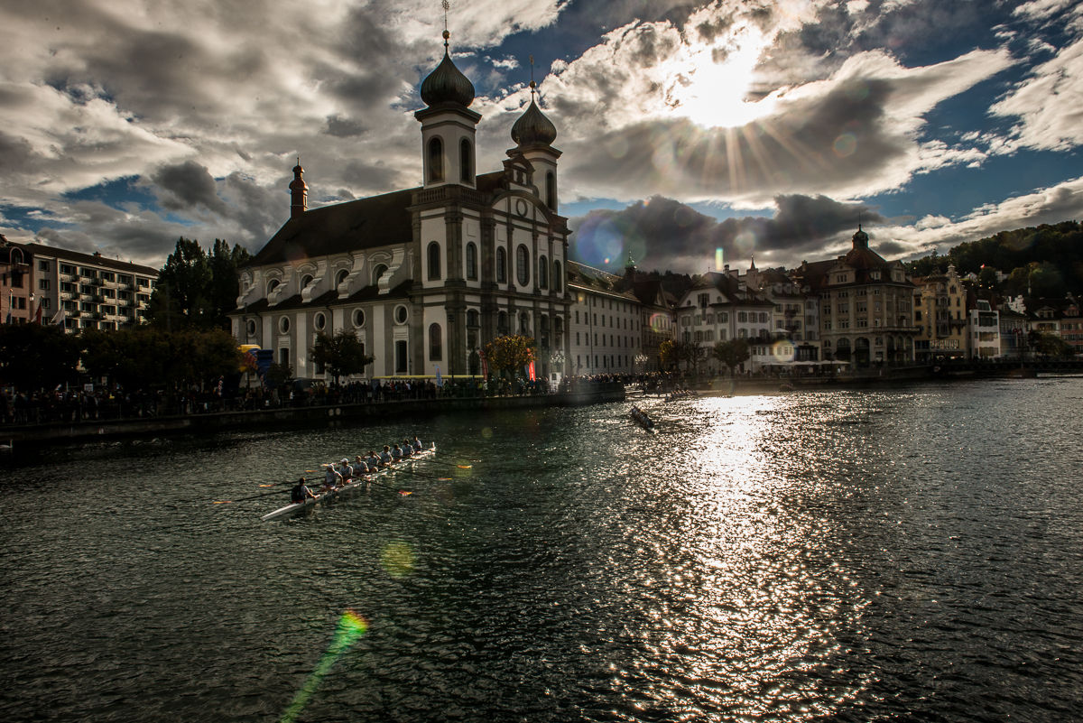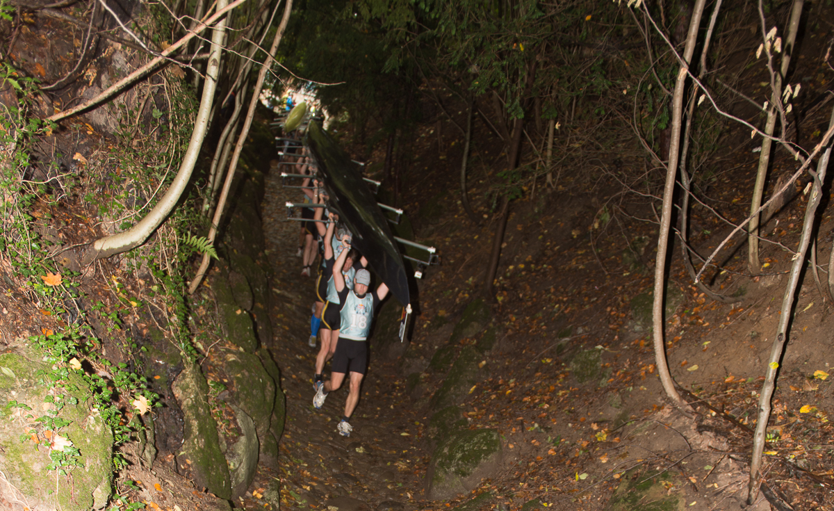 Durch die Hohlen Gasse in Küssnacht kommt heute kein Gessler durch. Die Platzverhältnisse sind viel zu knapp für die 21 Achterboote die in Zug gestartet sind. Das Ziel: Luzern zu erreichen zu Fuss über Asphalt und zu Wasser. In Immensee heisst es aus dem Boot, Ruder zusammenschnüren und ab auf die Strasse. 100 kg ein Boot, getragen von den Rudern nach Küssnacht über Stock und Stein. Durch die Hohlen Gasse wird es eng. Die Zuschauer stehen am Eingang zur Gasse. Der Kampf durch die glitschige Gasse beginnt. Boot drehen, verlorenes Maskotchen holen, weiter geht’s, die Steuerfrau gibt Anweisung, drehen! Go go!