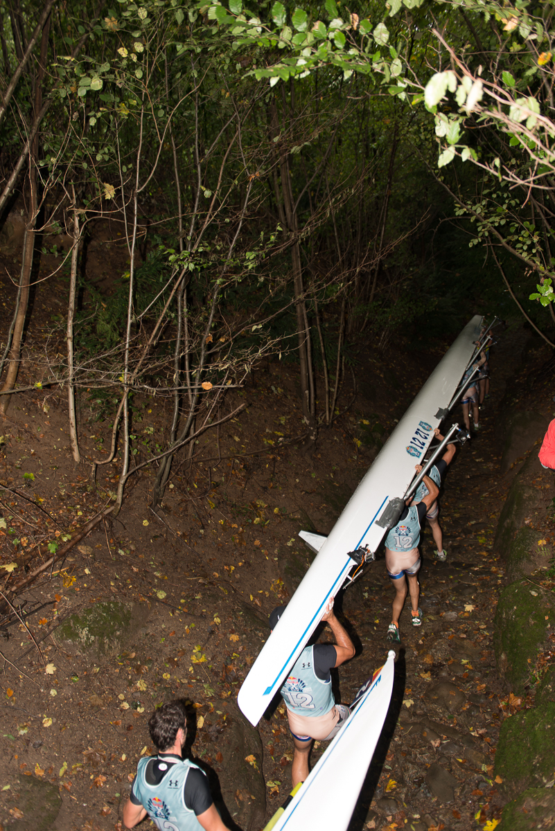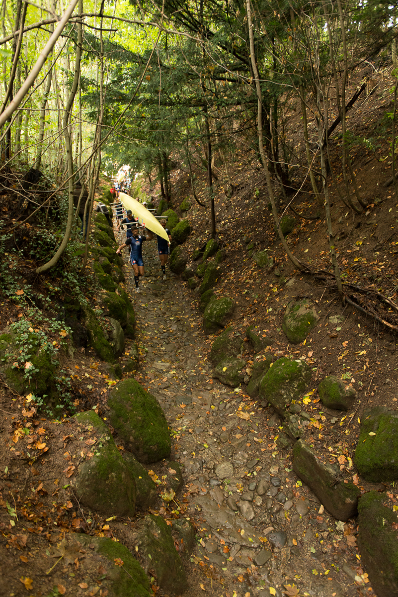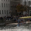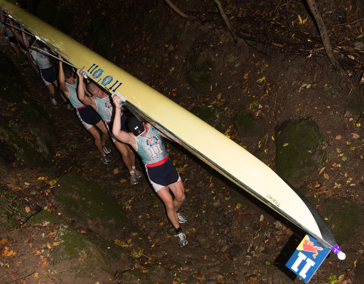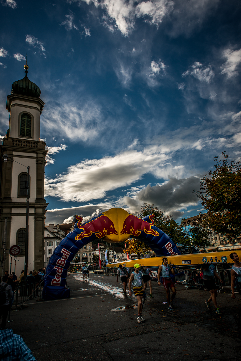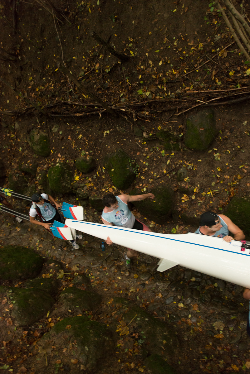 Durch die Hohlen Gasse in Küssnacht kommt heute kein Gessler durch. Die Platzverhältnisse sind viel zu knapp für die 21 Achterboote die in Zug gestartet sind. Das Ziel: Luzern zu erreichen zu Fuss über Asphalt und zu Wasser. In Immensee heisst es aus dem Boot, Ruder zusammenschnüren und ab auf die Strasse. 100 kg ein Boot, getragen von den Rudern nach Küssnacht über Stock und Stein. Durch die Hohlen Gasse wird es eng. Die Zuschauer stehen am Eingang zur Gasse. Der Kampf durch die glitschige Gasse beginnt. Boot drehen, verlorenes Maskotchen holen, weiter geht’s, die Steuerfrau gibt Anweisung, drehen! Go go!