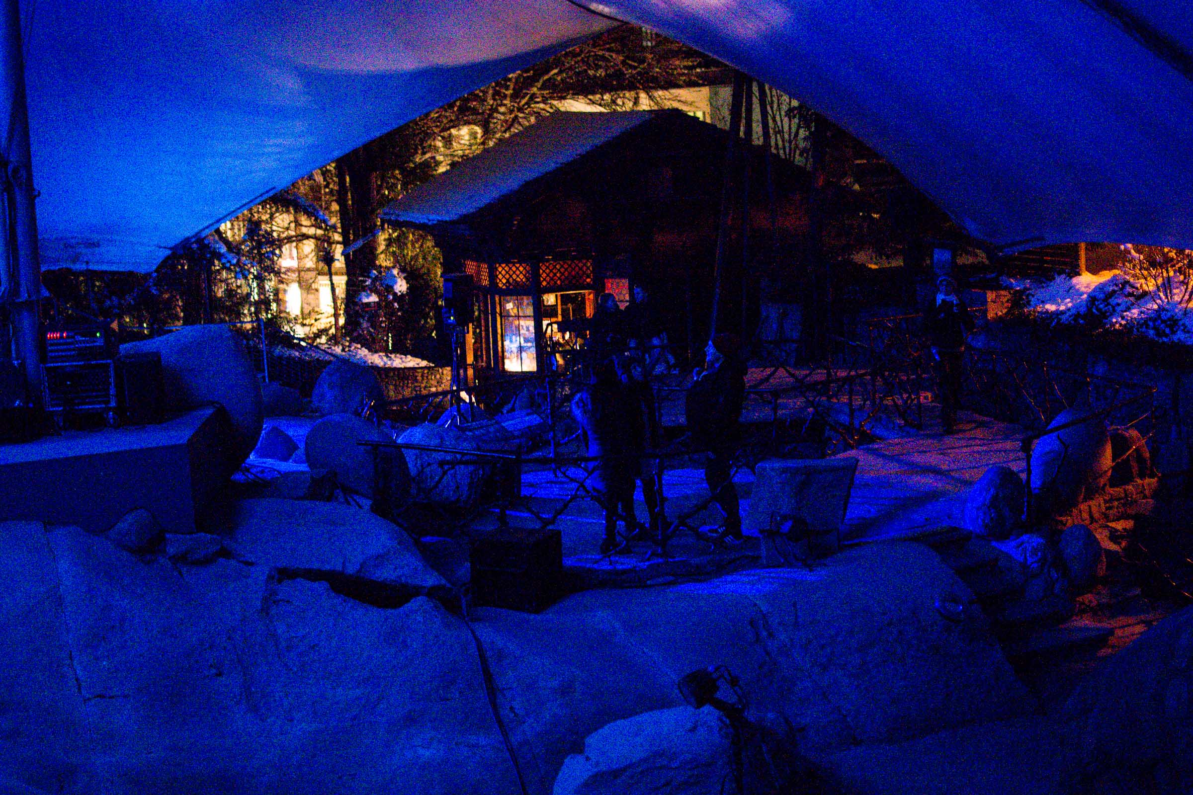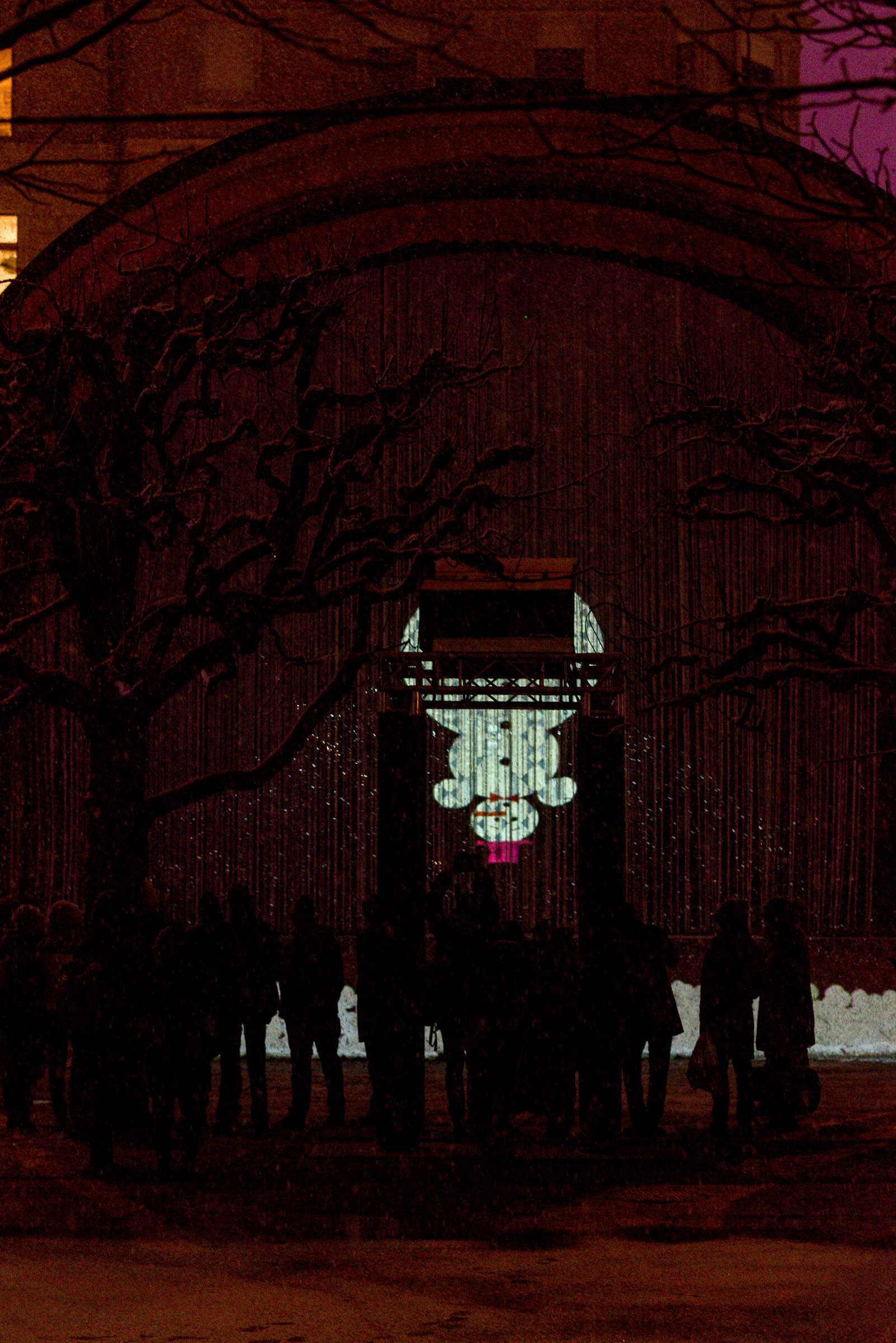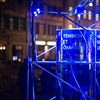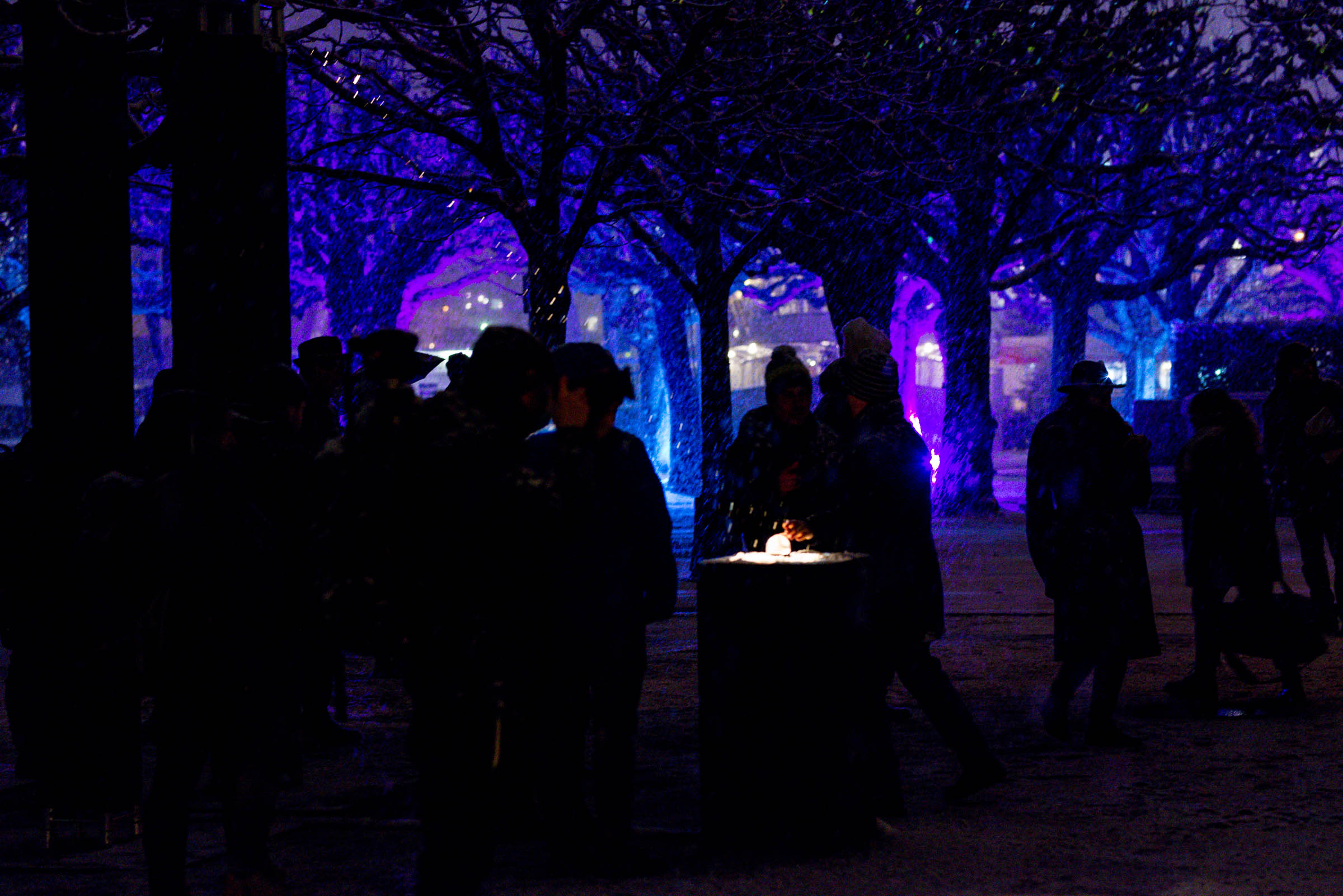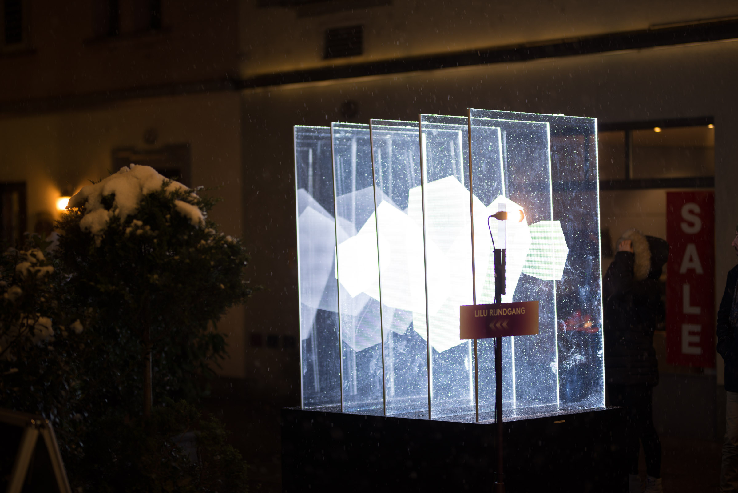 Die Umgebung des Schneemann "Olaf" auf der Bühne im Musipavillon, lässt sich mittels einer Kugel interaktiv mitgestalten. Farben und Formen wirbeln durch die Nacht.