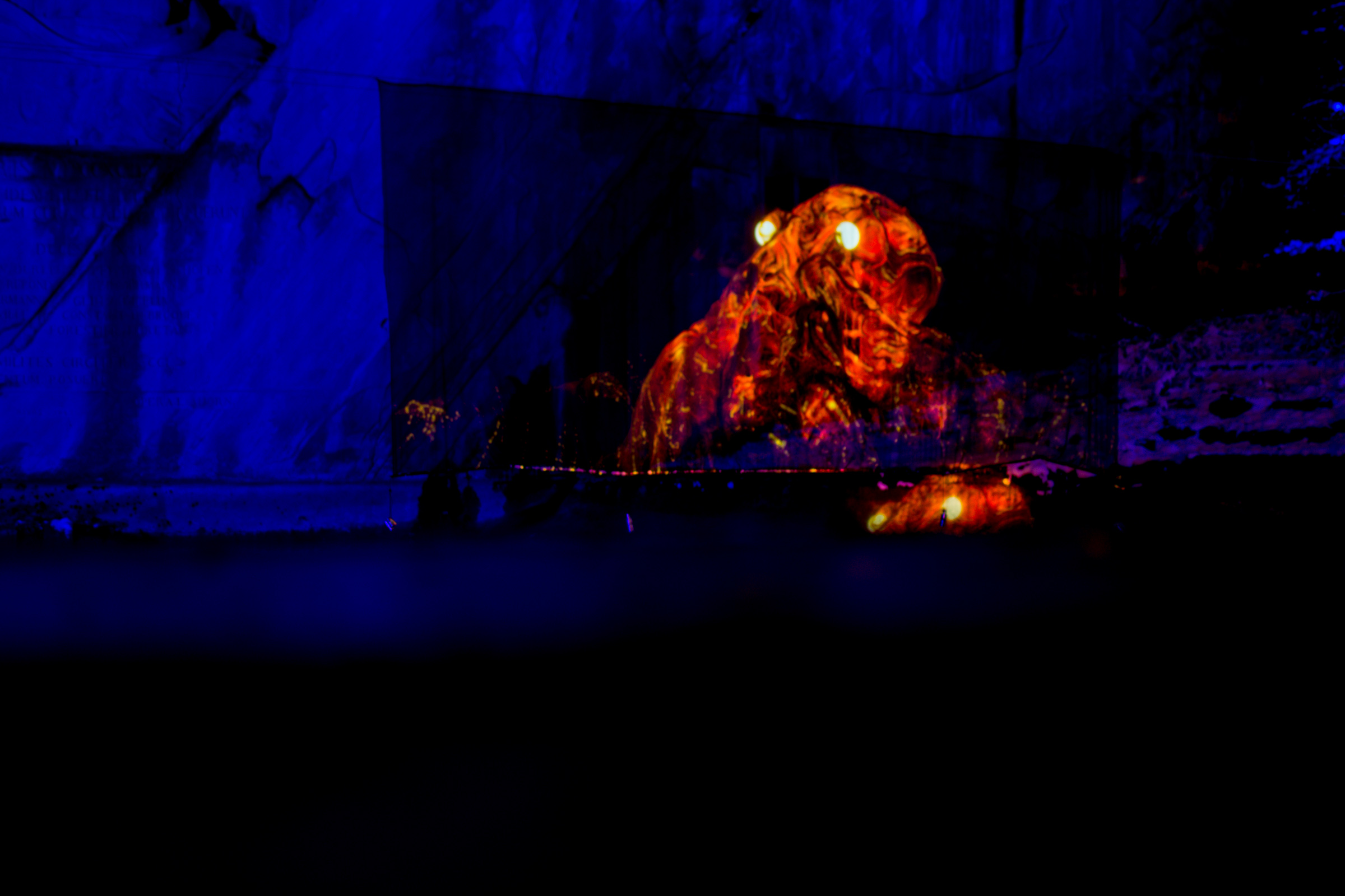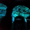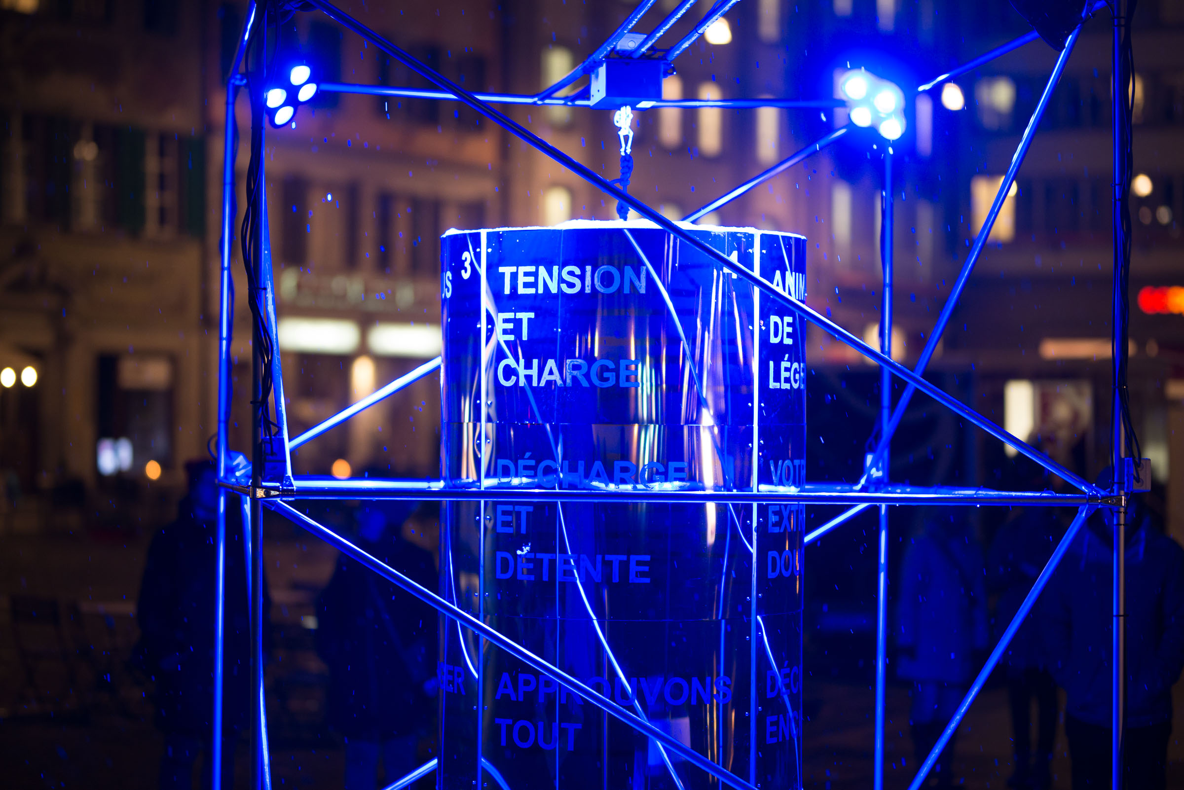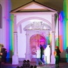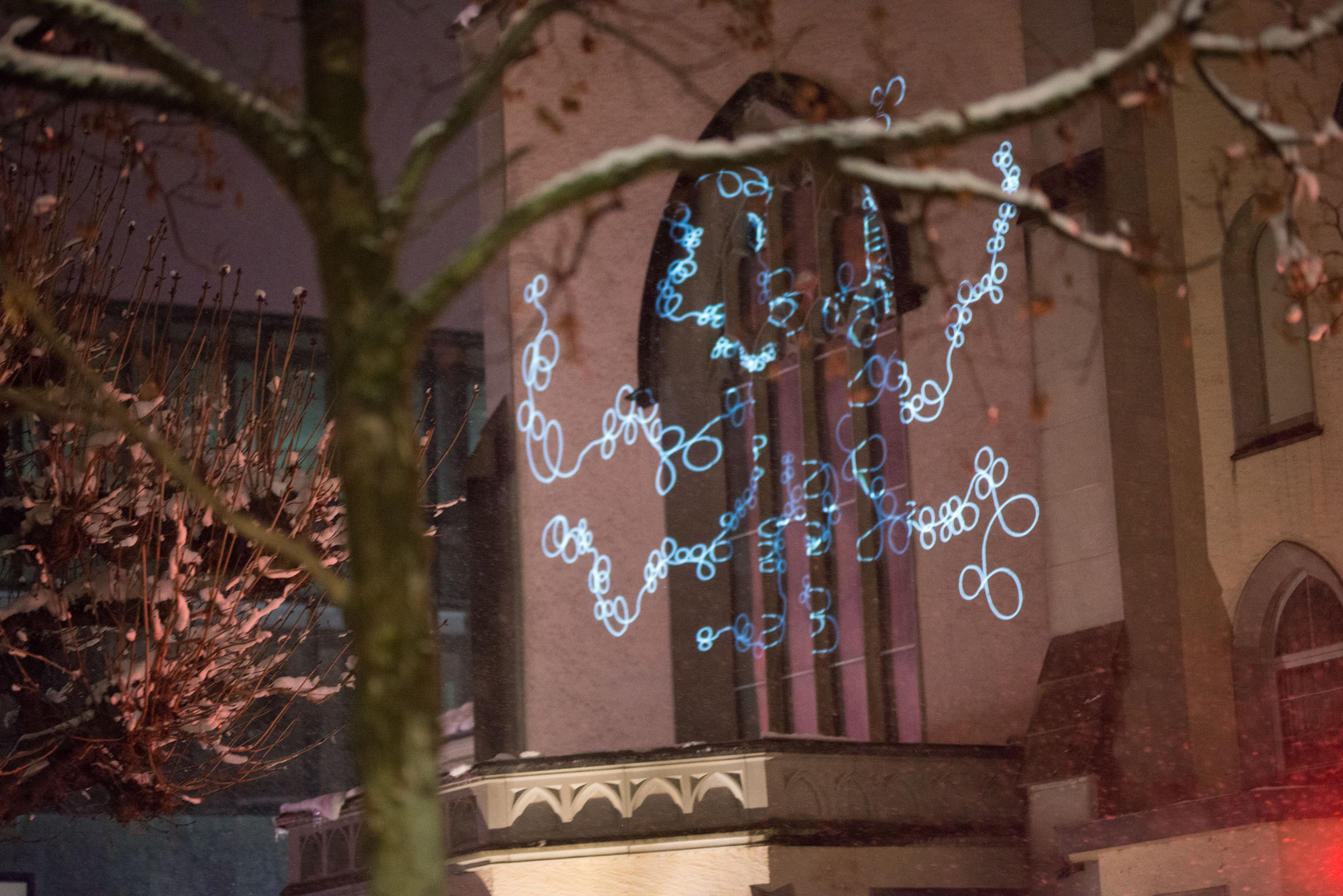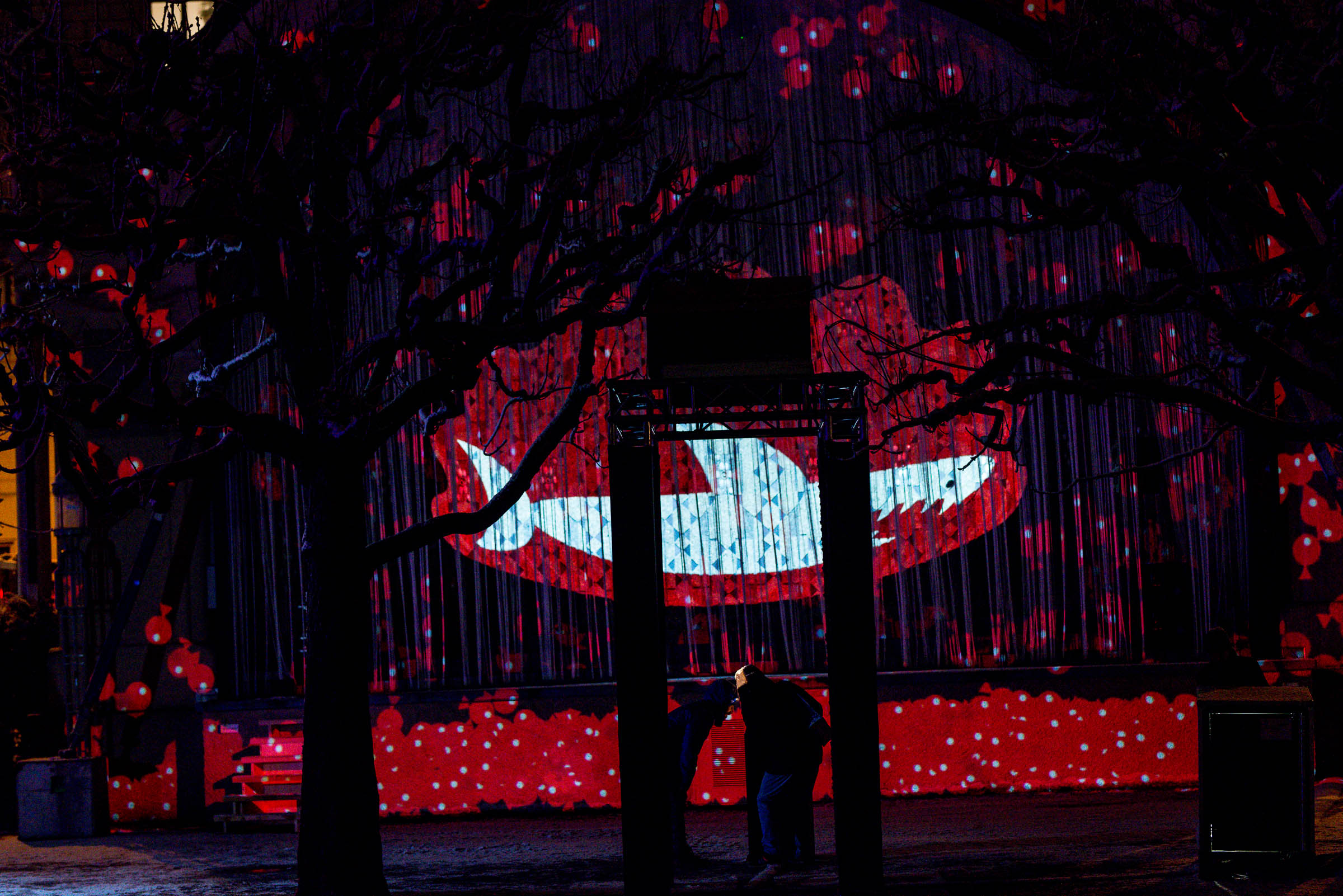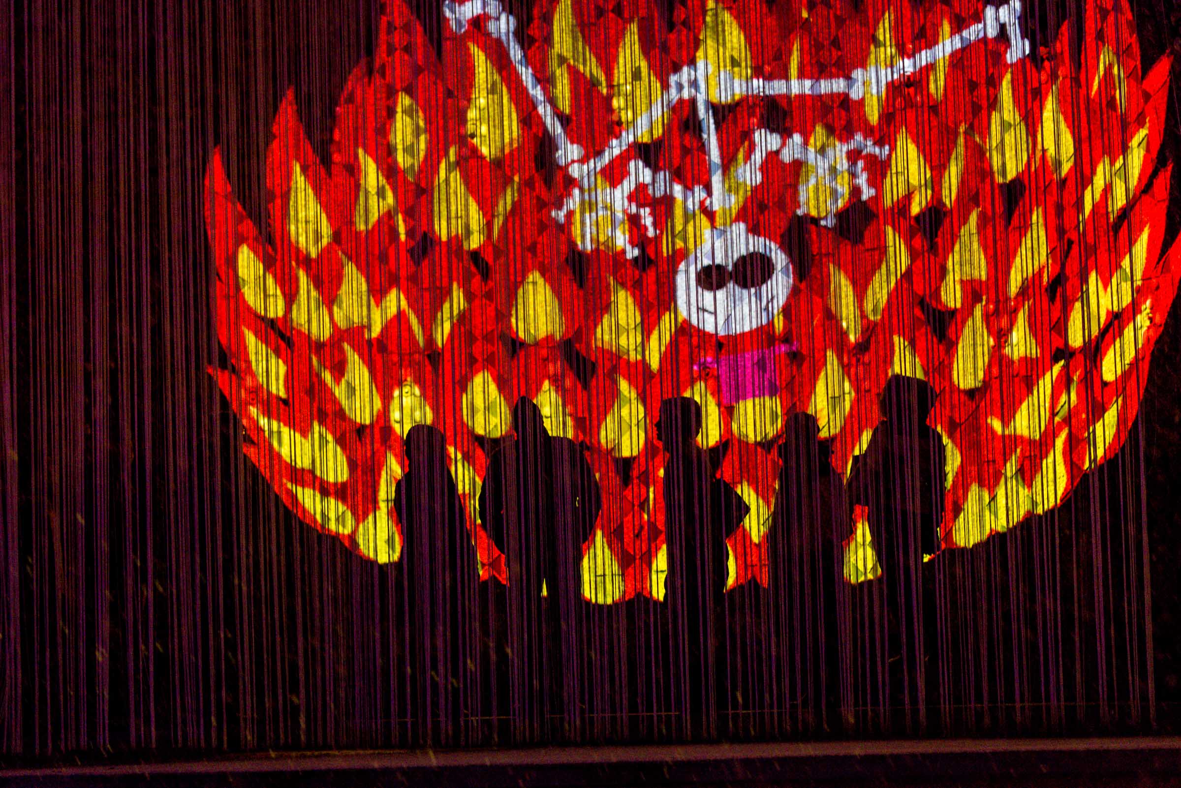 Die Umgebung des Schneemann "Olaf" auf der Bühne im Musipavillon, lässt sich mittels einer Kugel interaktiv mitgestalten. Farben und Formen wirbeln durch die Nacht.