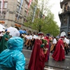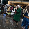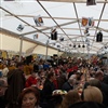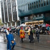 Die Menschen Menge unter dern farbigen Schirmen lacht laut und verlässt Platz, ohne das obligate Bratwurstgrillen.