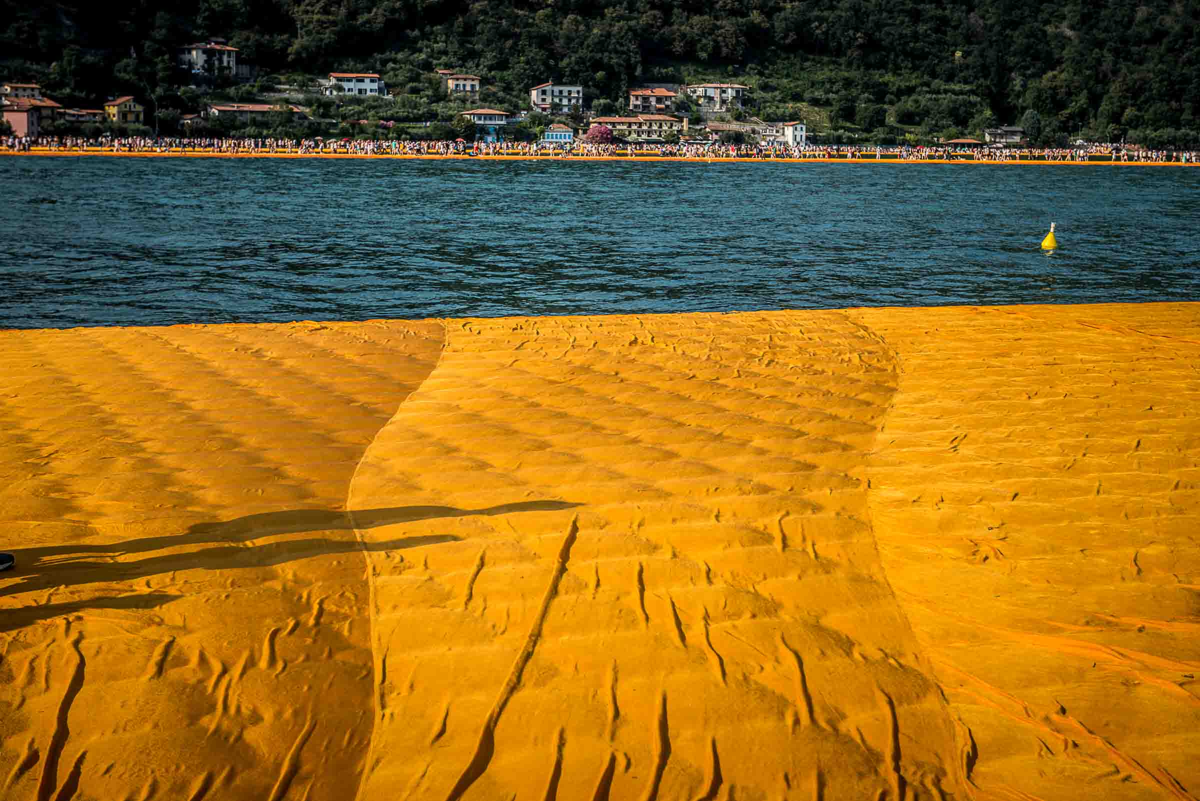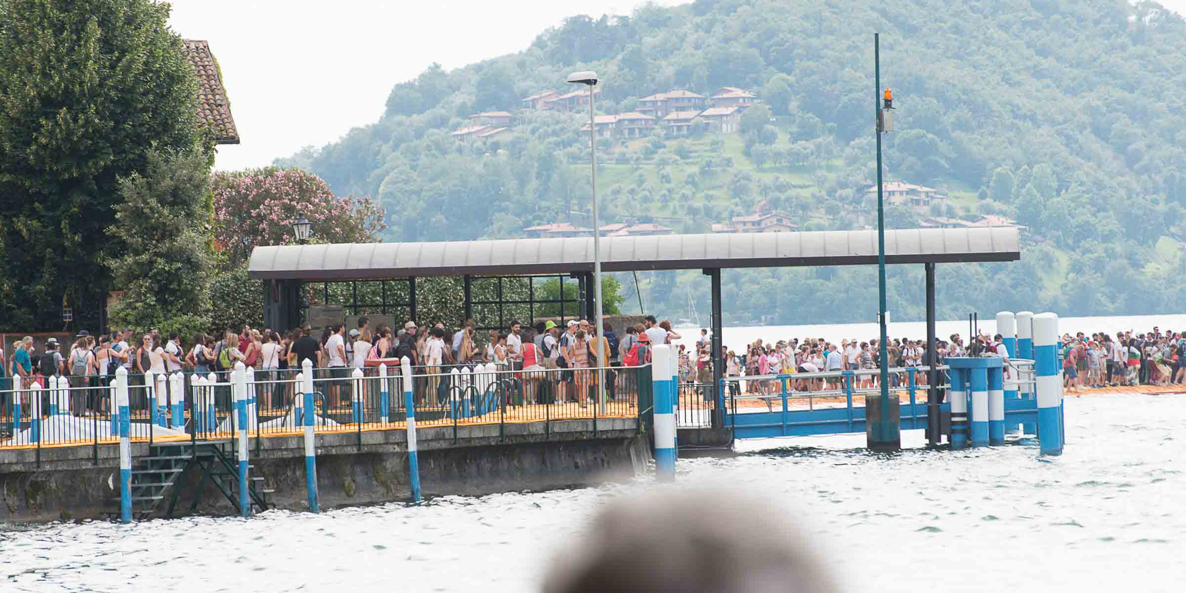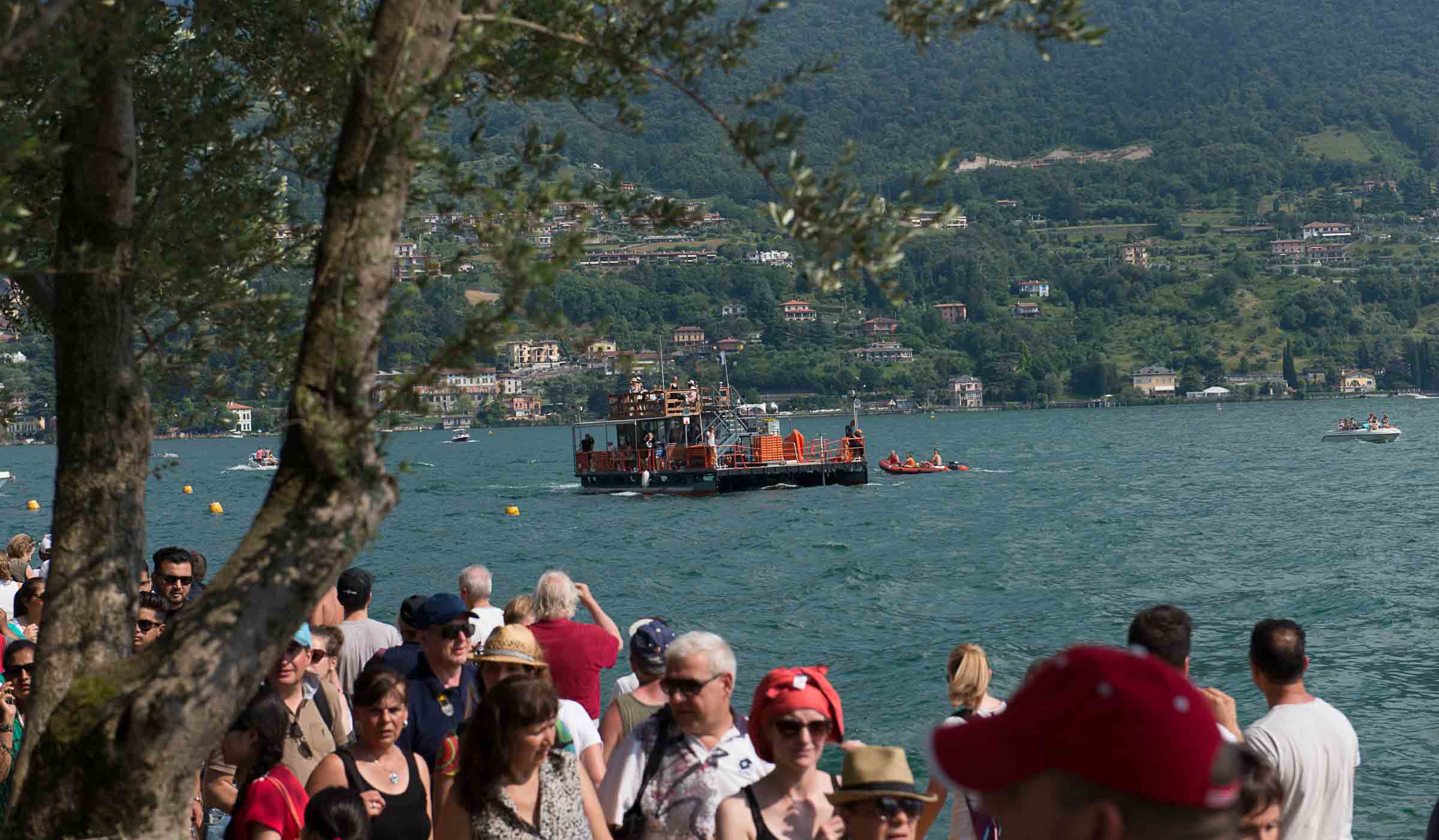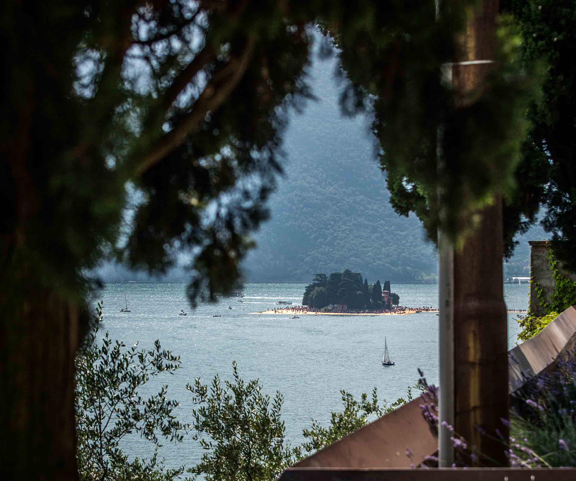 Auf der Insel sind die Wege durch die Gassen teilweise mit den Stoff ausgelegt. Auf Treppenstufen sitzen Touristen; auch hier herrschen gegen 30 Grad. Von der Kirche mit Blick auf den See, werden die Dimensionen der Installationen sichtbar. Ein Pier verbindet die Insel mit dem Festland und auf der westlichen Seite liegt die kleine Insel Isola di S. Paolo, die einem italienischen Grossindustriellen gehört. Zwei Piers führen vom Land zur Insel.