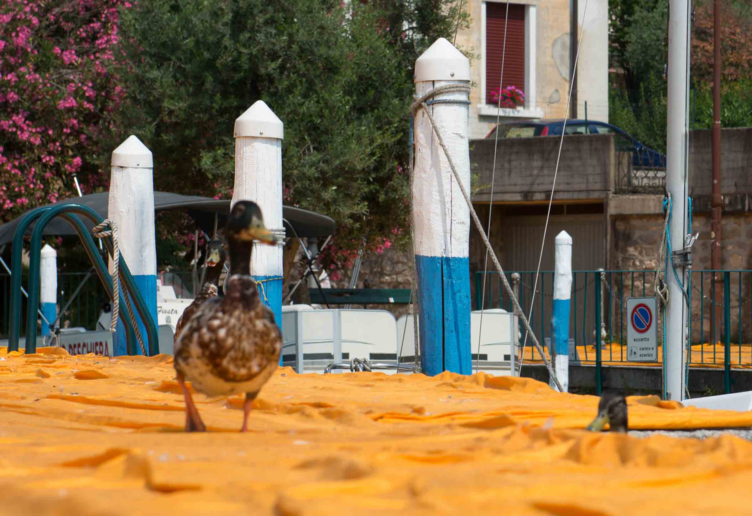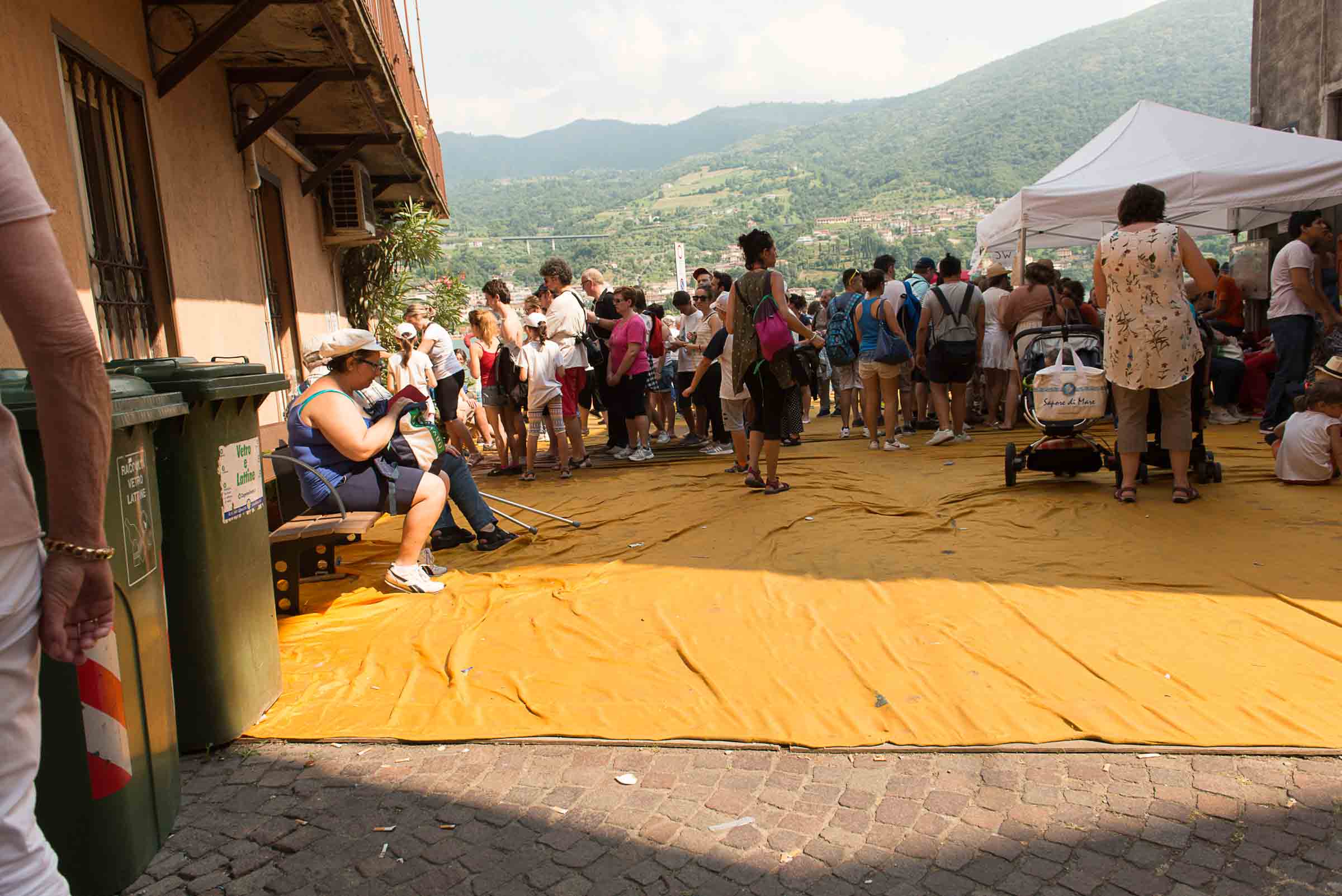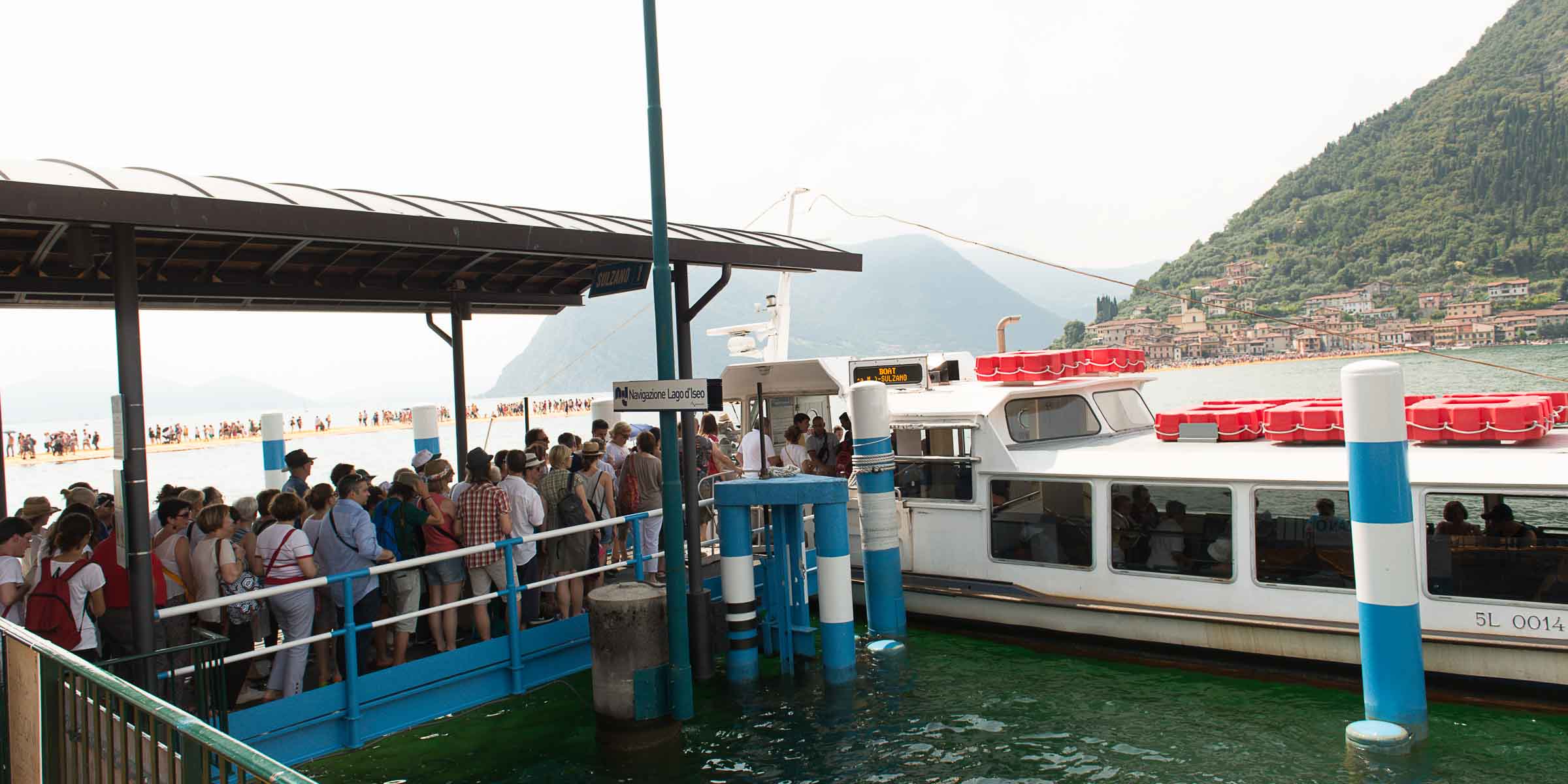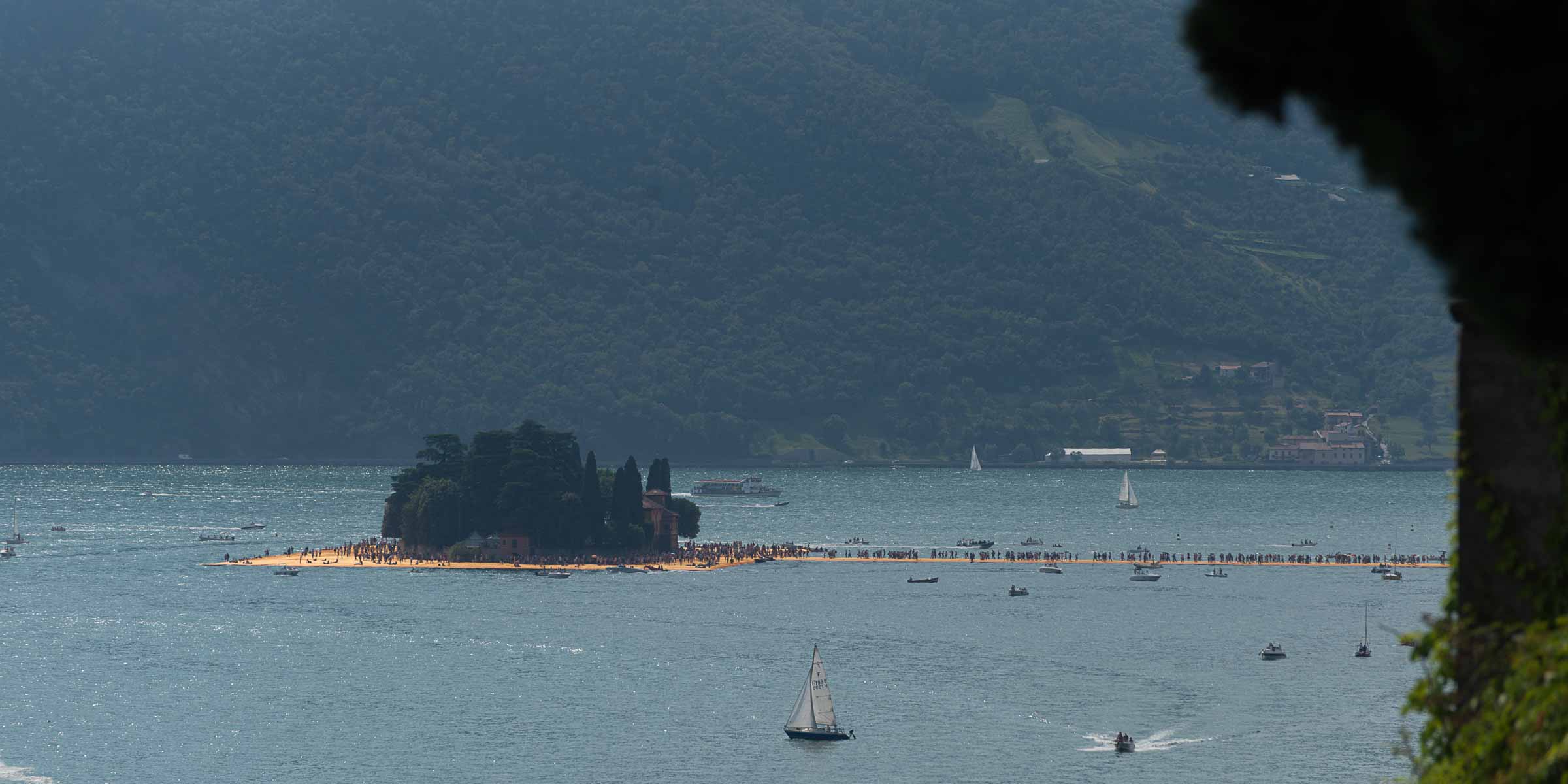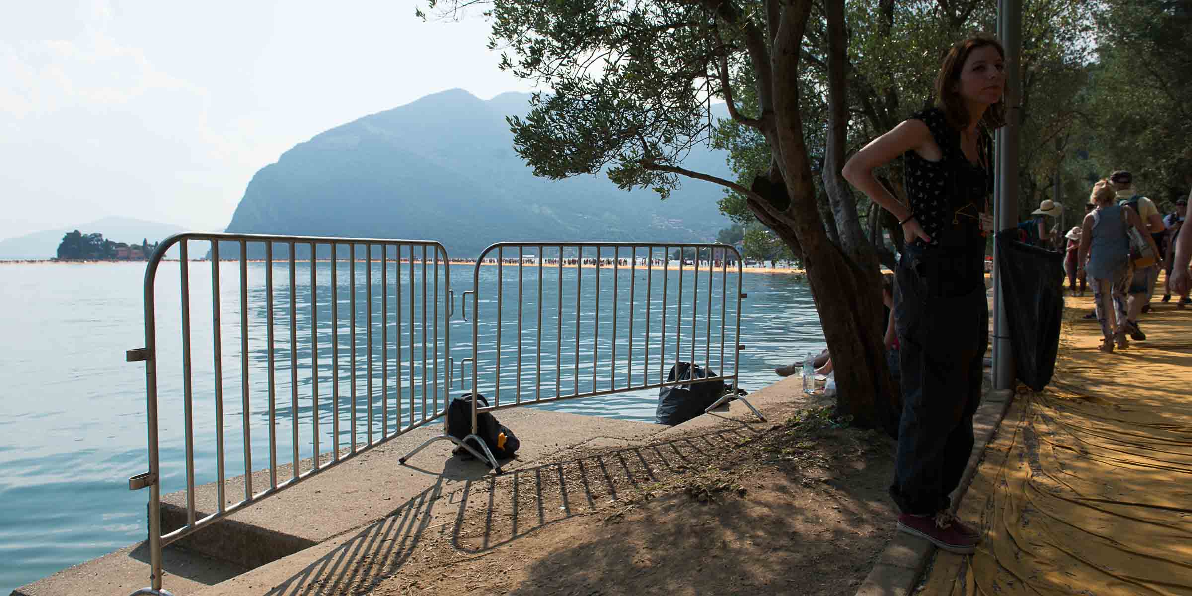 Auf der Insel sind die Wege durch die Gassen teilweise mit den Stoff ausgelegt. Auf Treppenstufen sitzen Touristen; auch hier herrschen gegen 30 Grad. Von der Kirche mit Blick auf den See, werden die Dimensionen der Installationen sichtbar. Ein Pier verbindet die Insel mit dem Festland und auf der westlichen Seite liegt die kleine Insel Isola di S. Paolo, die einem italienischen Grossindustriellen gehört. Zwei Piers führen vom Land zur Insel.
