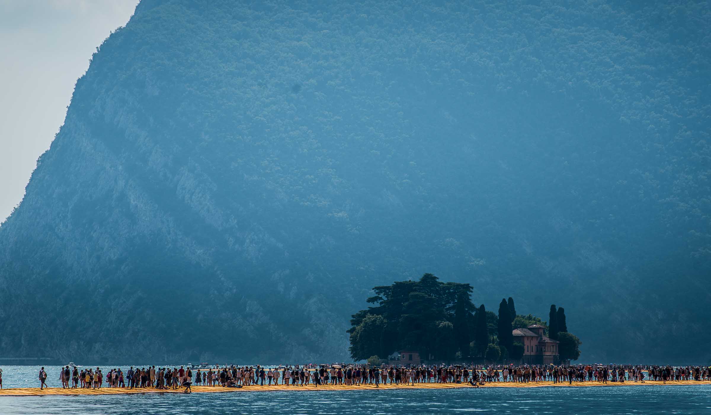 Was in Italien alles in einem Jahr möglich ist. Einen Steg zu bauen, der rund um die Insel schwimmt und von Besuchern über floating piers die Insel aus einer ganz neuen Perspektiven hautnah erleben lässt. Einfach rum laufen und die Insel nicht betreten.