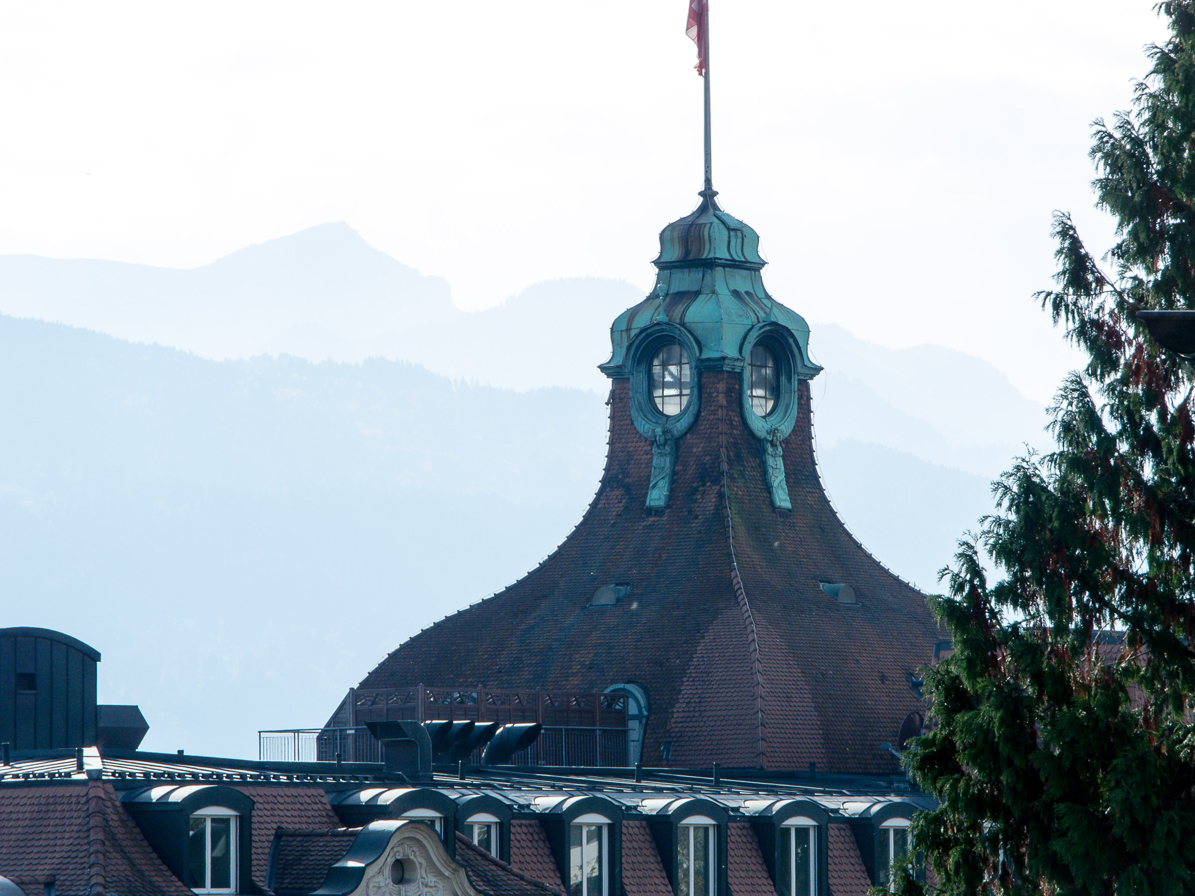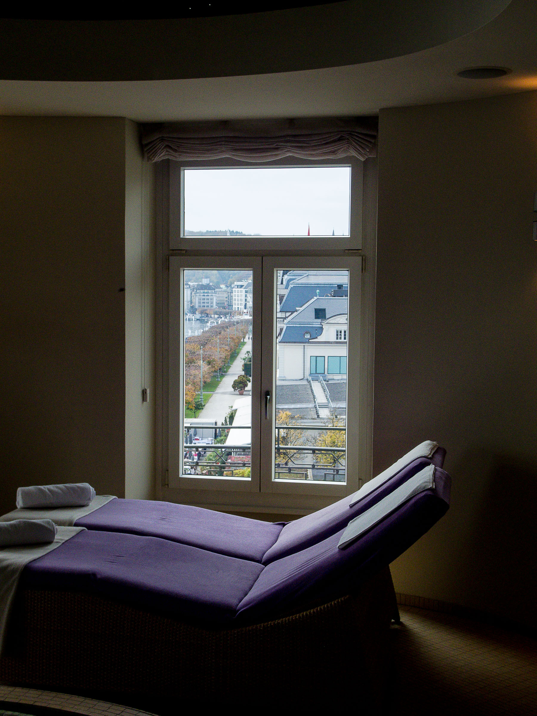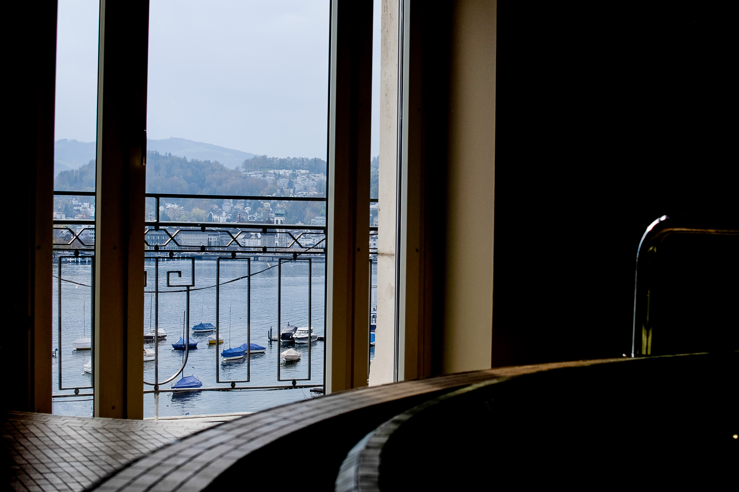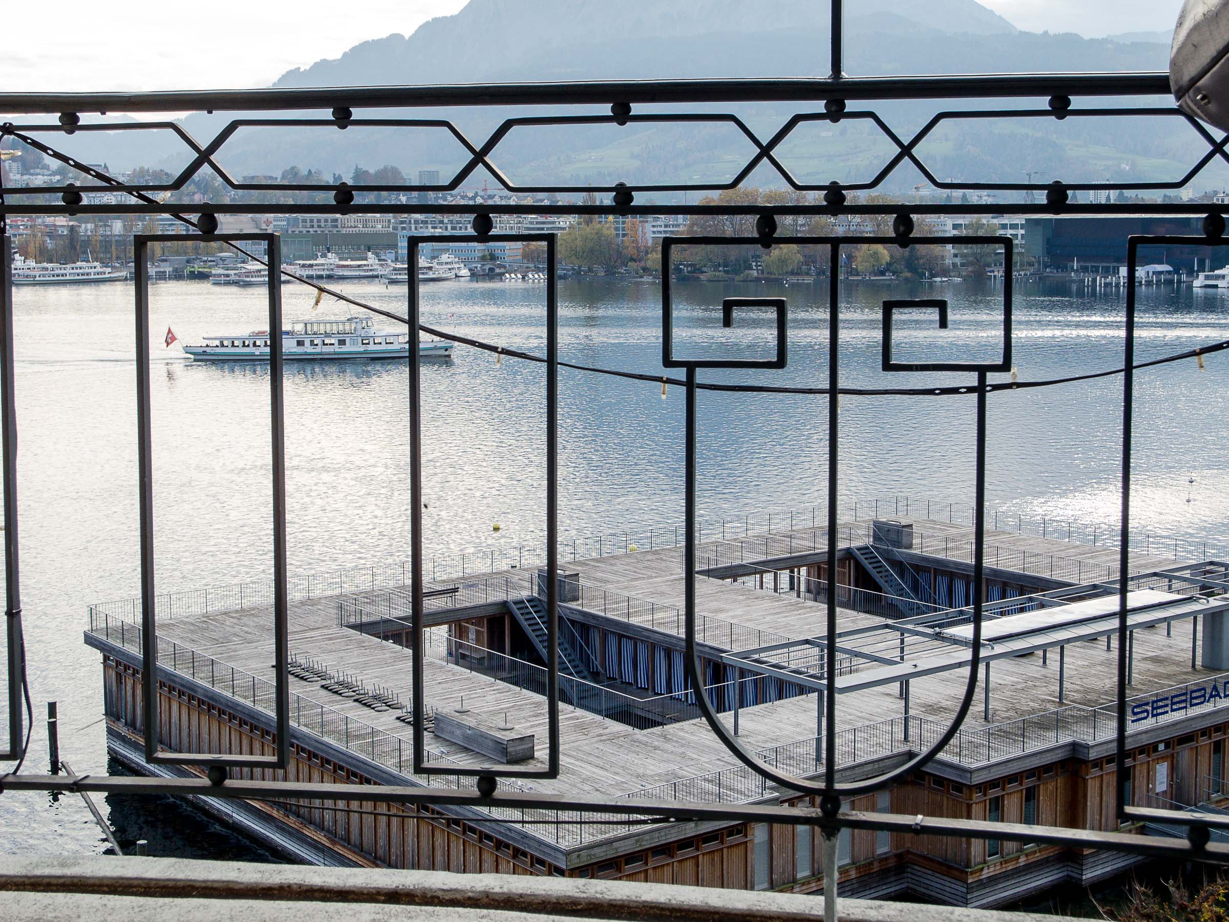 Der Blick schweift an den beiden Damen vorbei über den See und dem KKL Richtung Pilatus, der sich in ein herbstliches Nebelkleid hüllt. Die Aussicht von hier oben ist schon exzellent. Die Gäste im Spa können durch die Fensterfront einen Blick erhaschen. Die Schneeberge sehen in der langsam niedergleitenden Sonne wie Zuckerberge aus. Auf dem Dach der Seebadi stehen die Sonnenschirmständer aufgeräumt und warten tunlichst auf den nächsten Sommereinsatz.