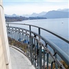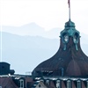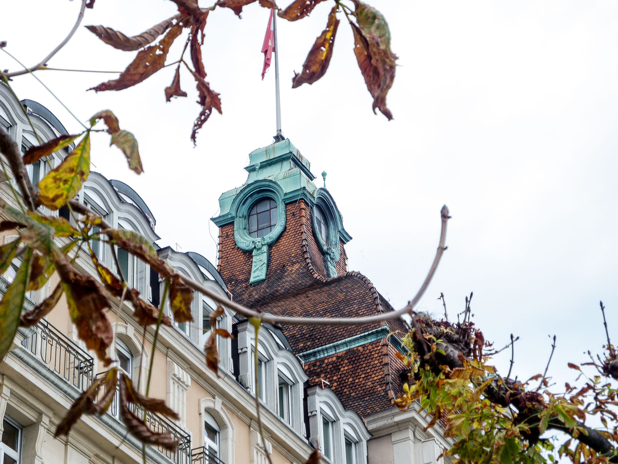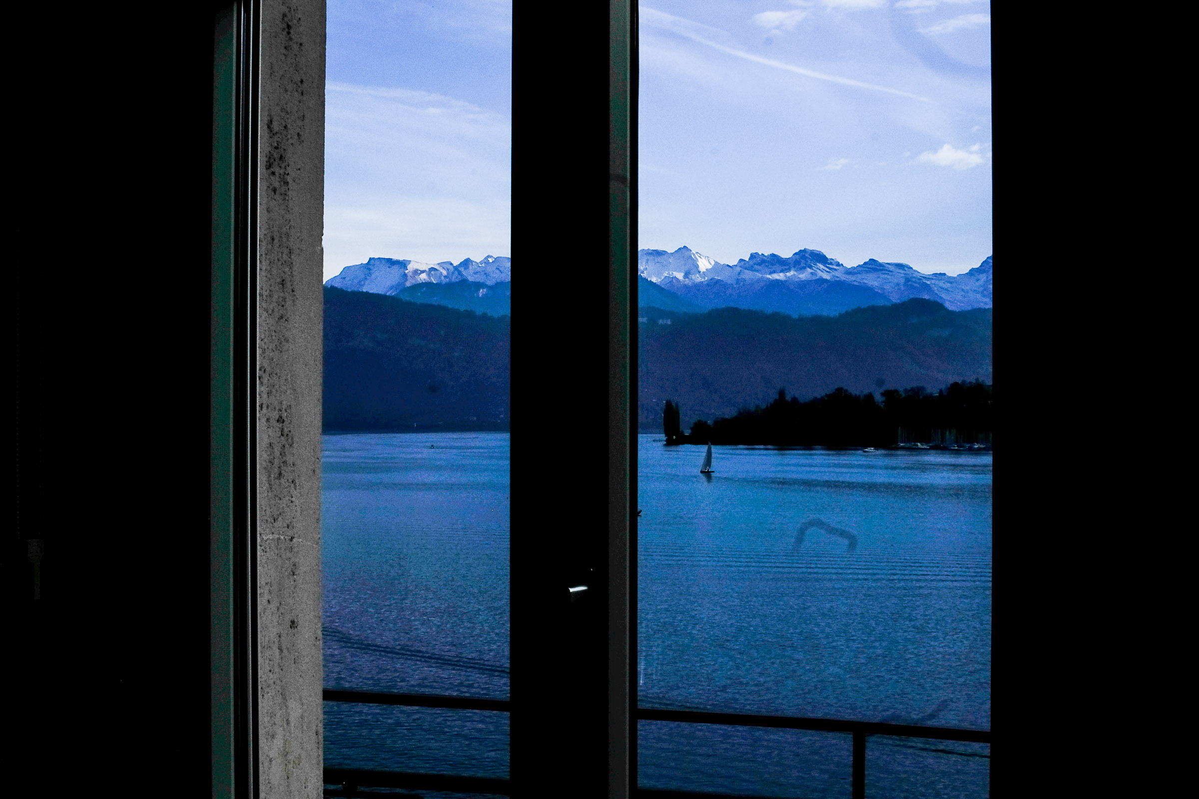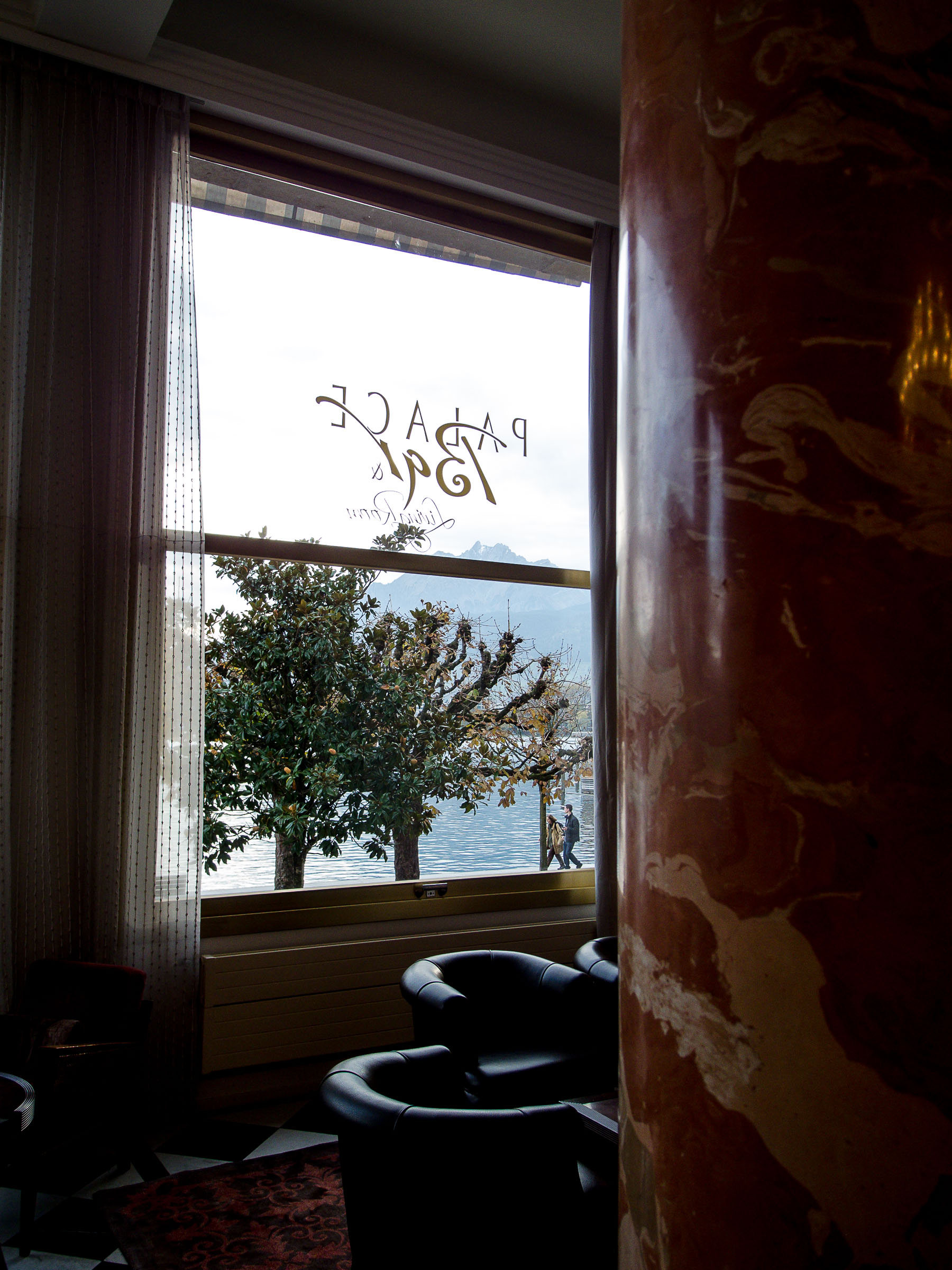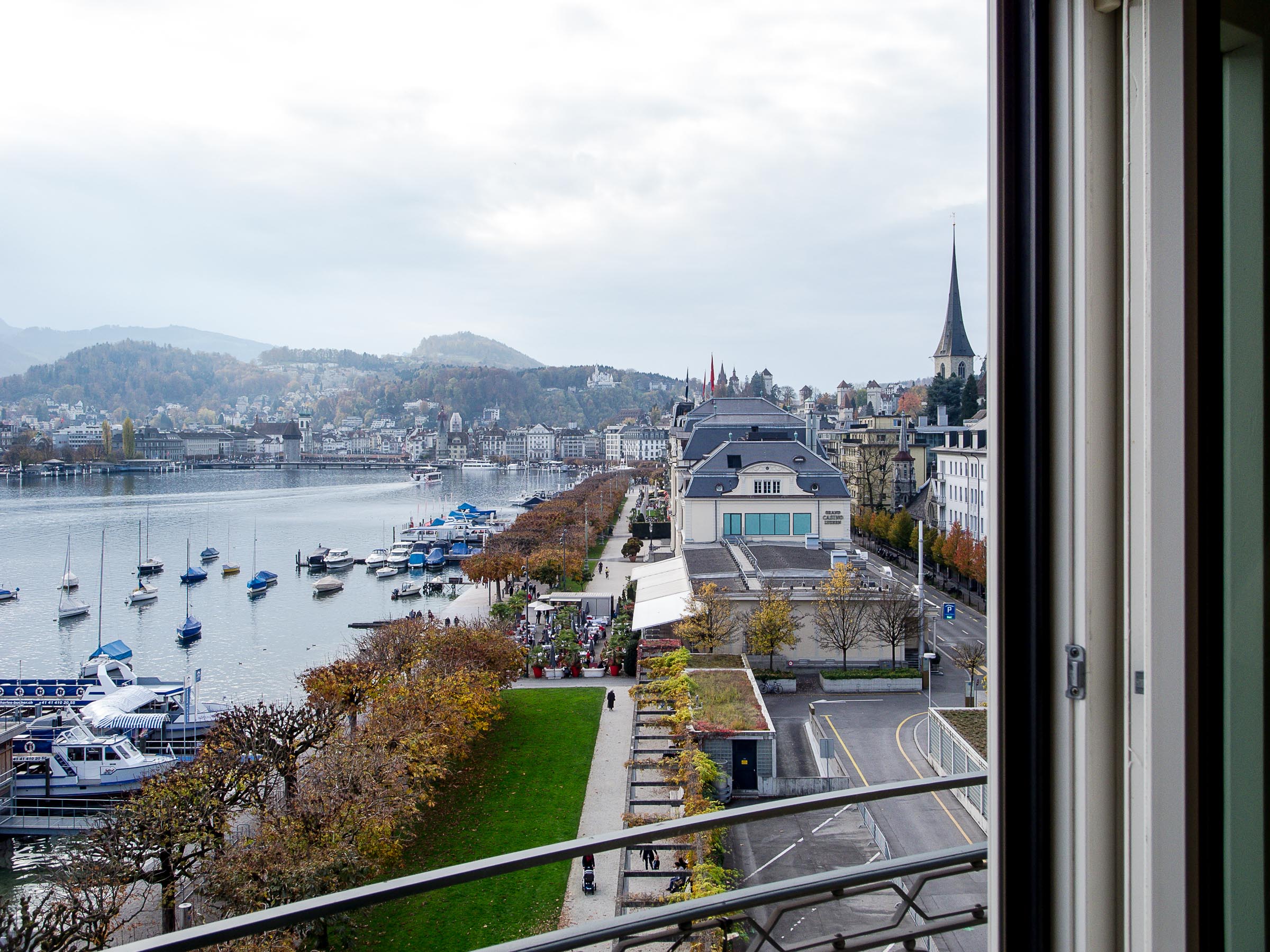 Der Blick schweift an den beiden Damen vorbei über den See und dem KKL Richtung Pilatus, der sich in ein herbstliches Nebelkleid hüllt. Die Aussicht von hier oben ist schon exzellent. Die Gäste im Spa können durch die Fensterfront einen Blick erhaschen. Die Schneeberge sehen in der langsam niedergleitenden Sonne wie Zuckerberge aus. Auf dem Dach der Seebadi stehen die Sonnenschirmständer aufgeräumt und warten tunlichst auf den nächsten Sommereinsatz.