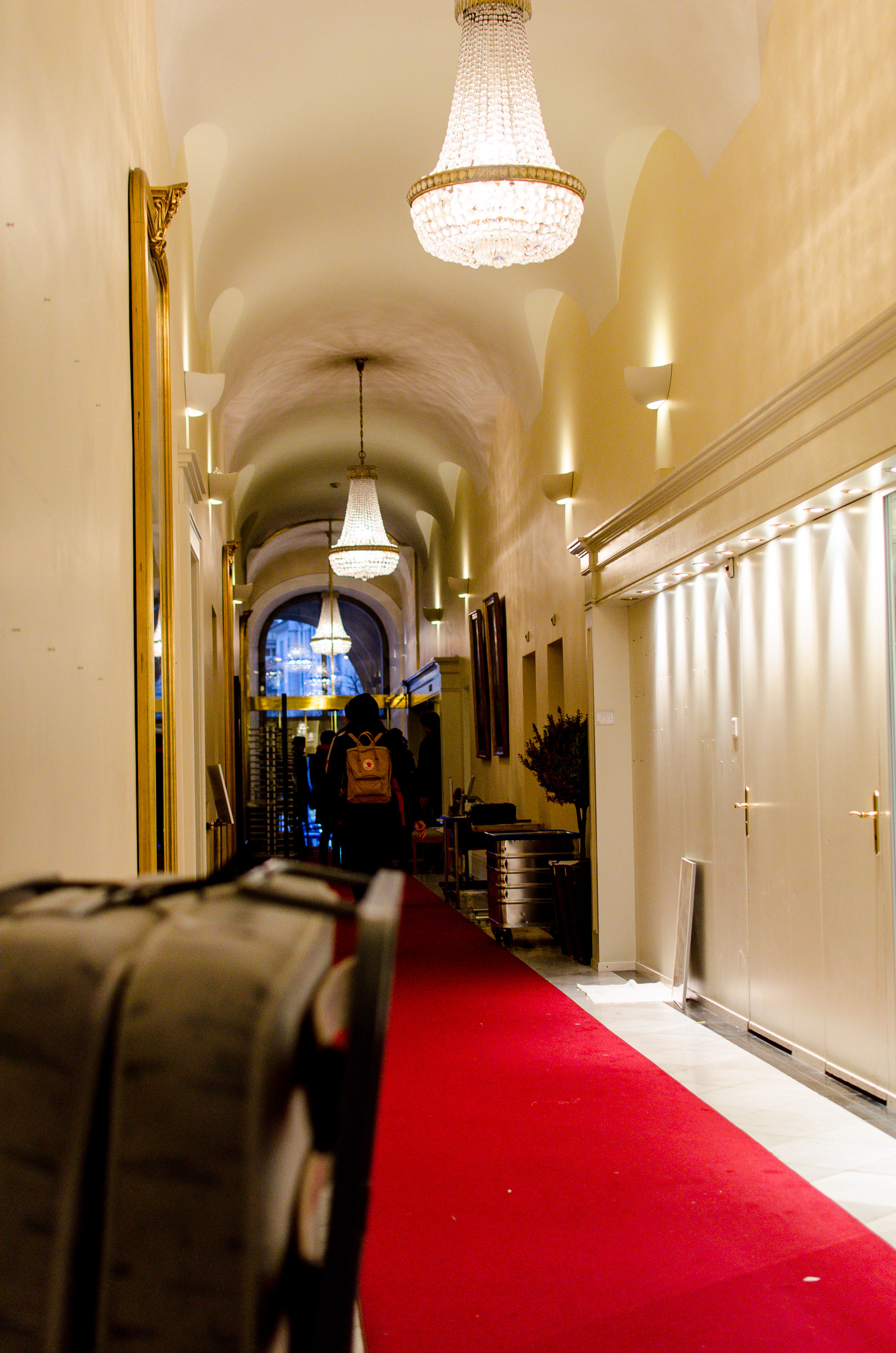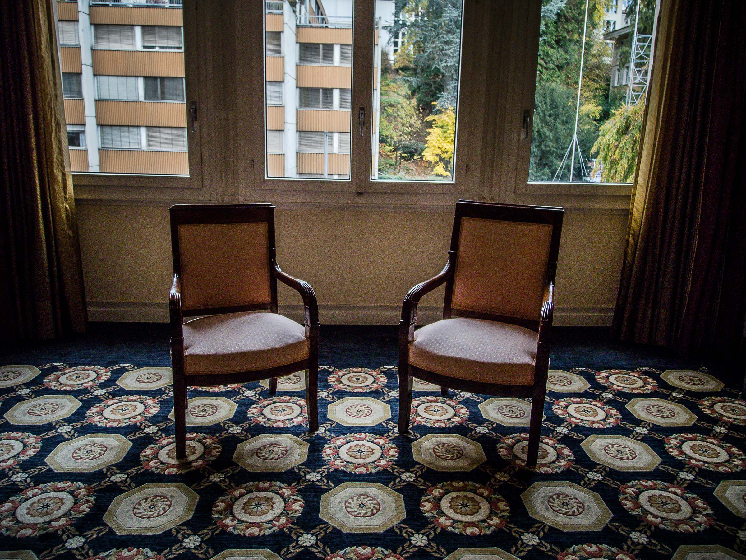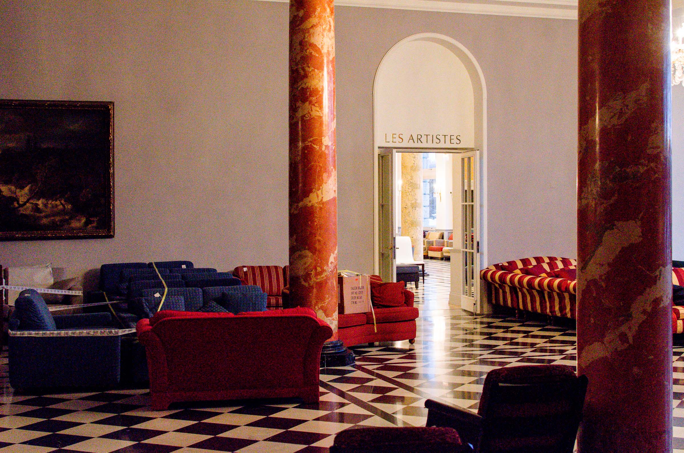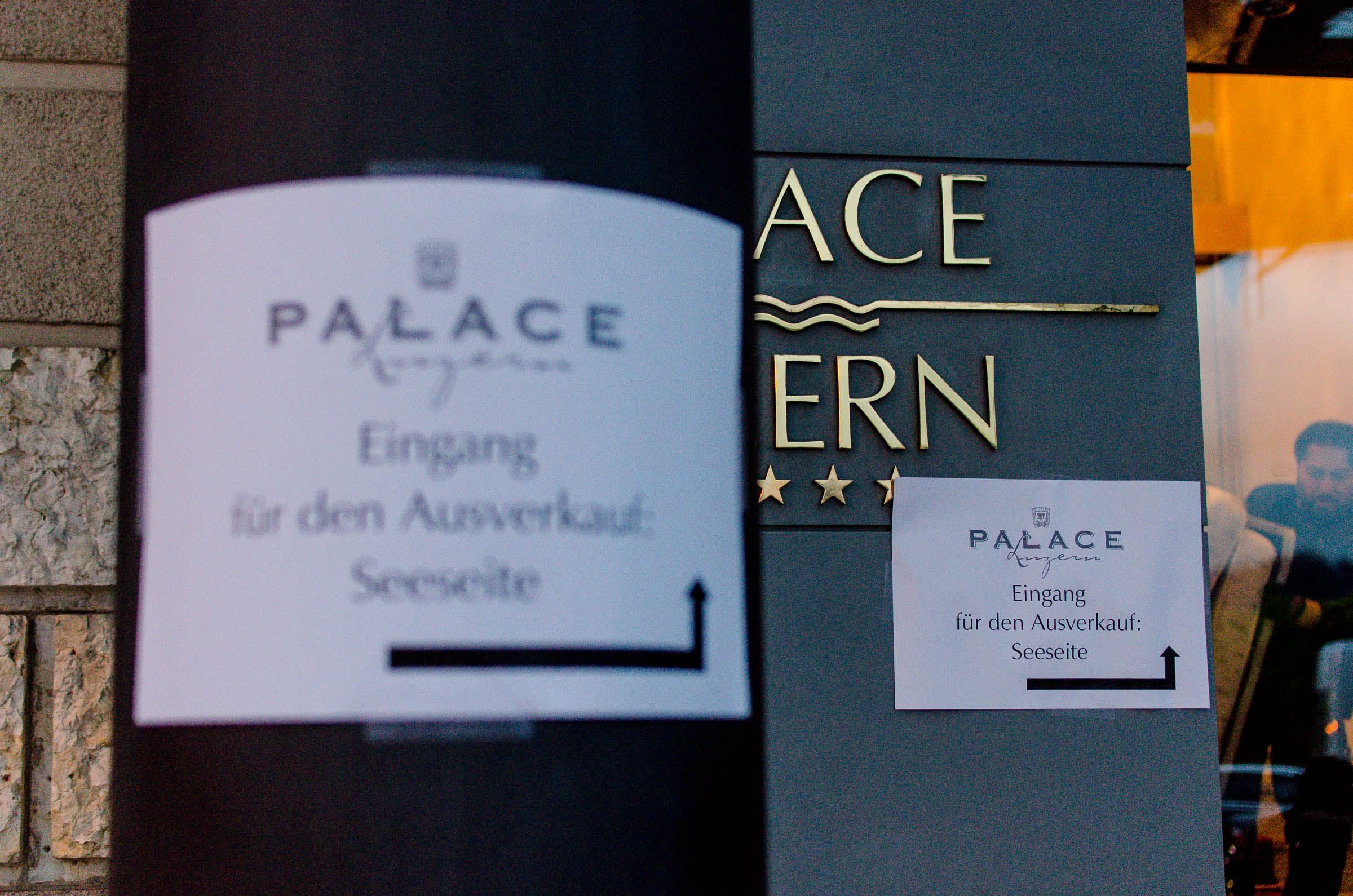 Die Kleiderbügel liegen ungeordnet in einem Transportwagen. Im nächsten Raum finden wir einen roten Fauteuil für CHF 80.--. Die Blauen sind verkauft und stehen abholbereit im grossen Saal. Das Hotel Palace Luzern wird bald in einen Dornröschenschlaf fallen.