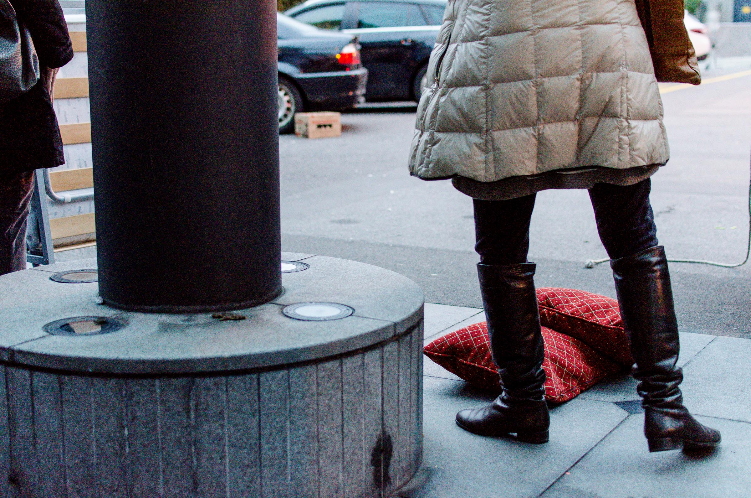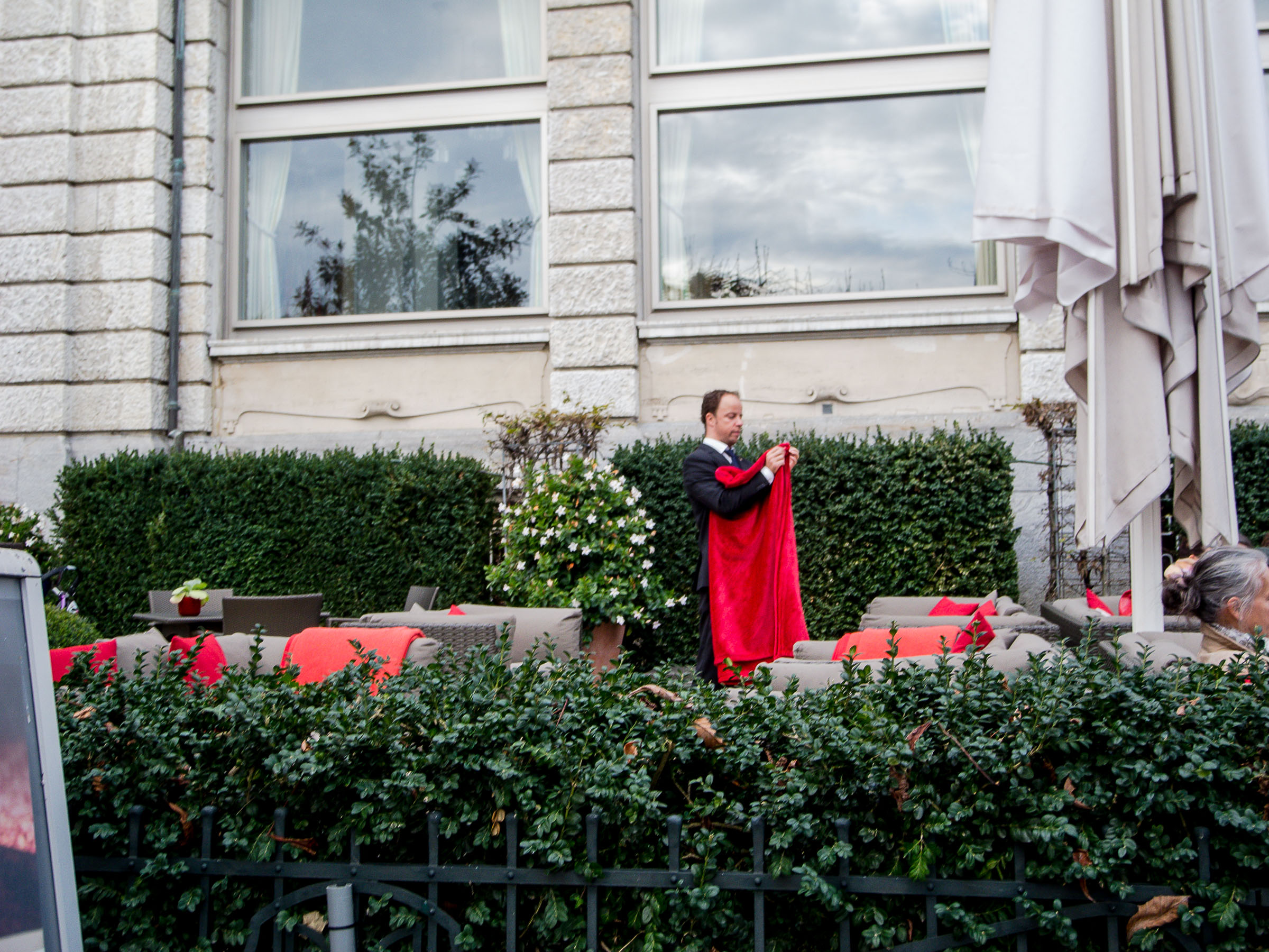 Im Garten werden die roten Sitz-Tücher zusammen gelegt. Der Besitzer des Marronistandes weiss noch nicht, ob er nach der Schliessung weiterhin am Samstag und Sonntag seinen Platz hat.