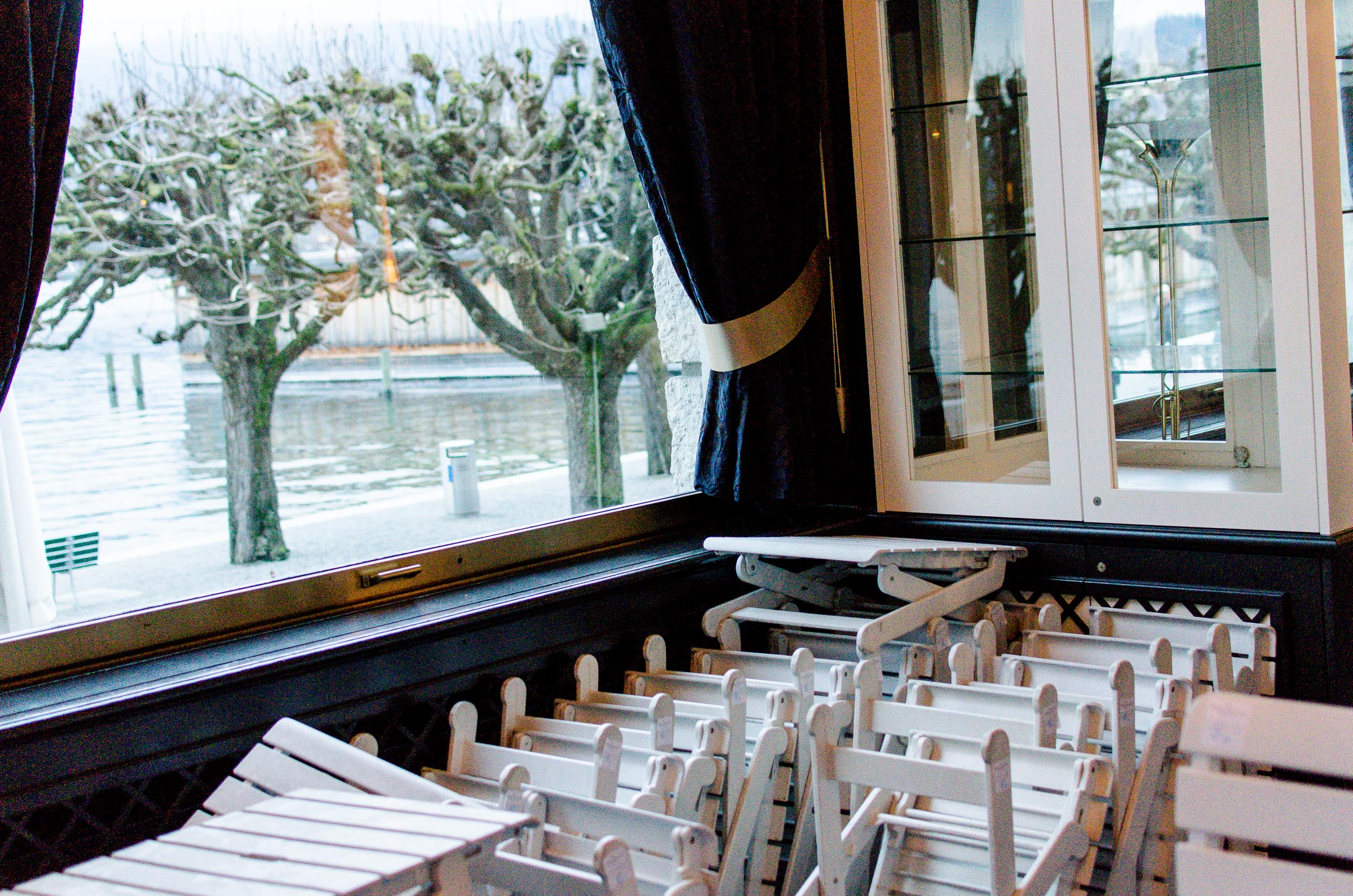 Zwei Damen sitzen lässig an den, ebenfalls zum Verkauf stehenden, Tischen. Darauf aufgereiht die Lampen. Ausgerichtet gegen den See und der steineren Treppe, als ob noch ein Besucher erwartet wird. Im Saal, wo anno 2016 und älter, Fasnachtsevents wie Gisela und Ruedi zelebriert werden, ist bald Ruhe.