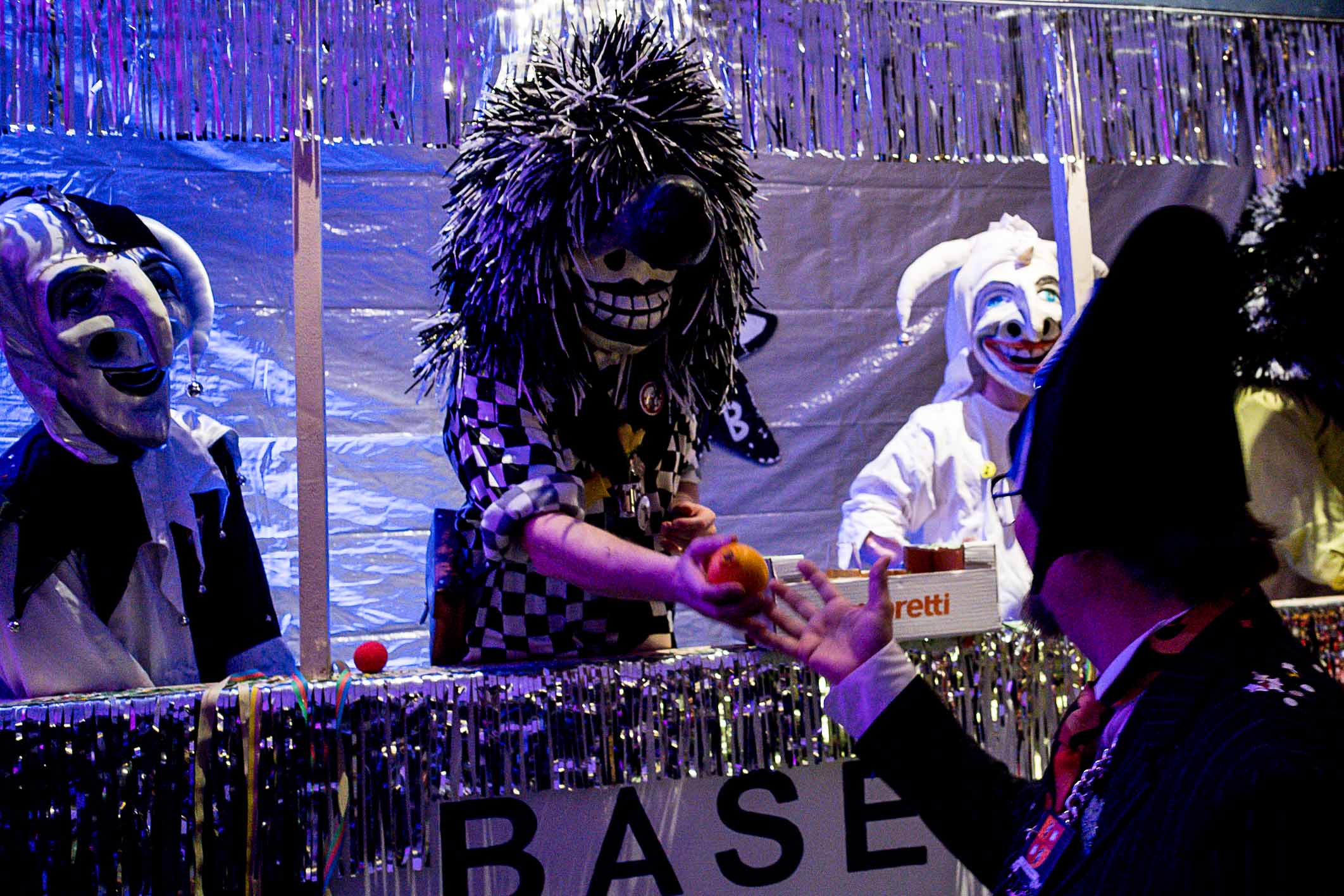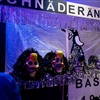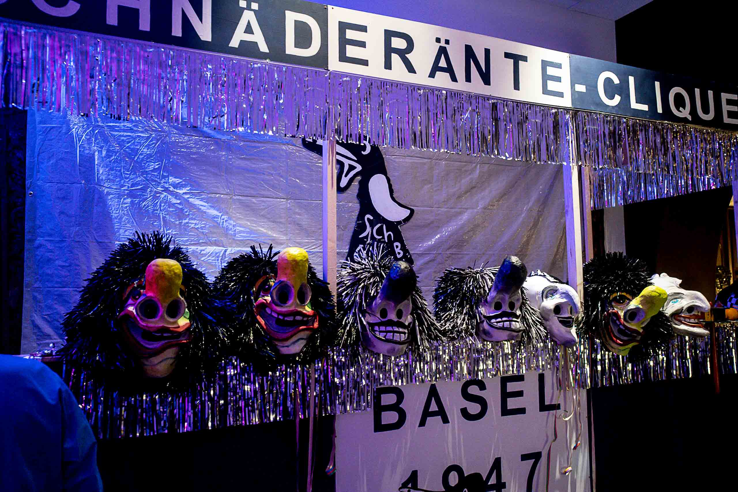 Eine Basler Larve steht auf der Bühne. Angekündigt wurde eine Basler Gruppe mit einer Zweierbesetzung. Nur, wo ist denn der Zweite? Hat er sich schon in sein Zimmer zurückgezogen und ist einfach eingepennt? Oder hat er seine Verkleidung (Irokesen Frisur in poppiger hellgrüner Farbe) nicht mehr vom Kopf runterbekommen und in das Basler Kostüm gepasst? Fragen über Fragen. Auf der Bühne erscheint nur eine verkleidetet Person die ihreVerse präsentiert. Und wer taucht beim letzten Vers auf? Sein Companio der es wohl noch zum obligaten Schlussphoto schafft, aber zu keinem Versli. Ob wir die beiden an der Värsli-Brönzlete  am Komische Fritig  antreffen werden? Oder hat sich der 2. Companio im Hotel verirrt und den Eingang zum Saal nicht gefunden?