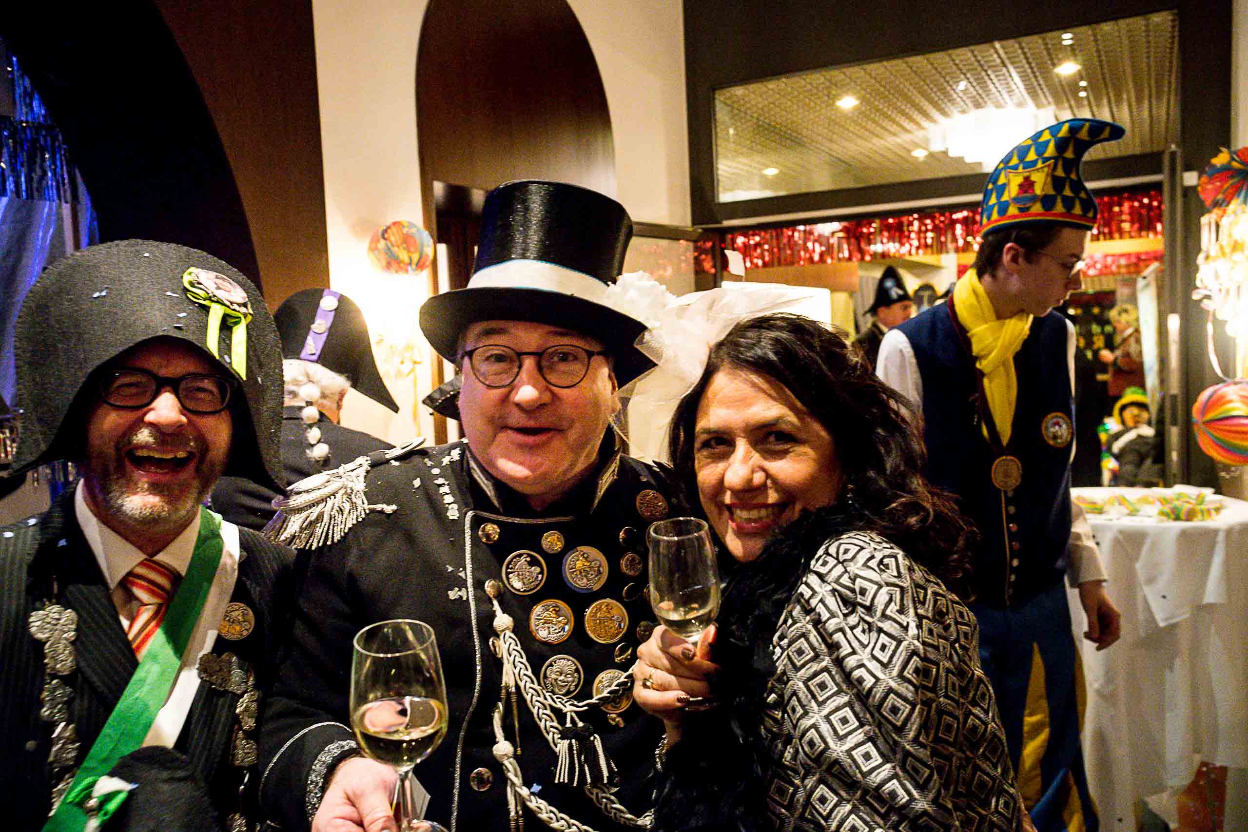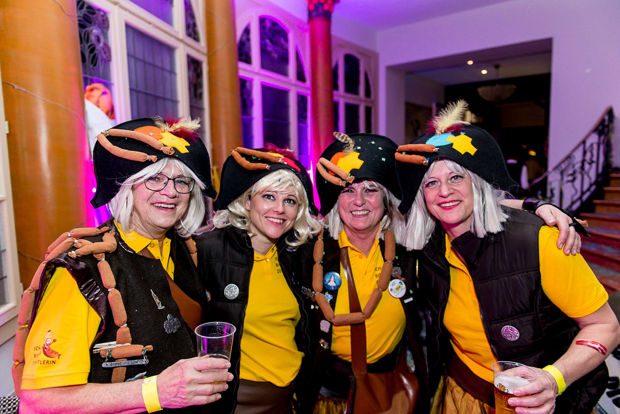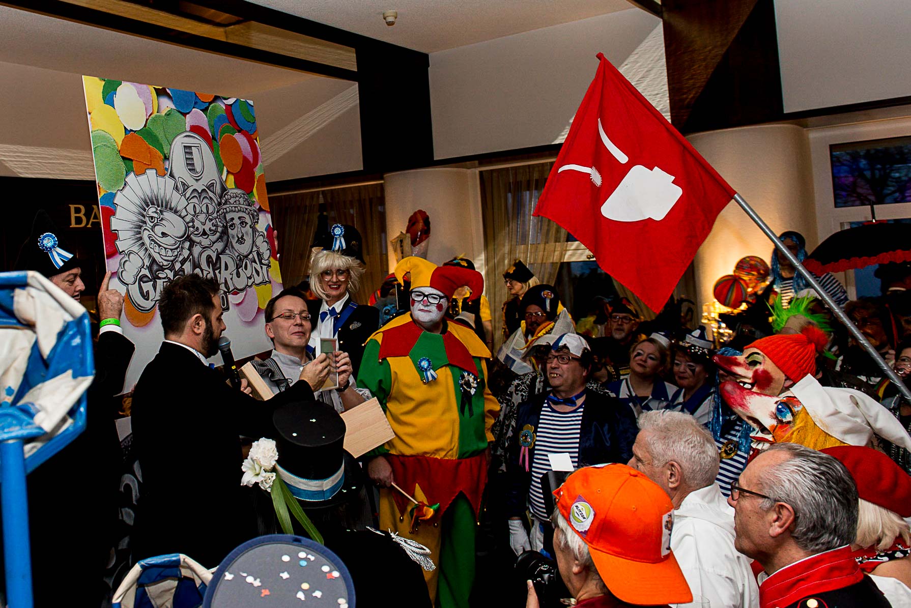 Basler Feinkost wird auf der Bühne serviert. Die Sprüche begeistern das Publikum und applaudiert den Schnitzelbangg von Schnäderänte, Schnappsbagge und Giftspritzi. Die Morenköpfe aus Basel lassen vor dem Hauptgang die bunte Gästeschar nochmals so richtig in Stimmung bringen.