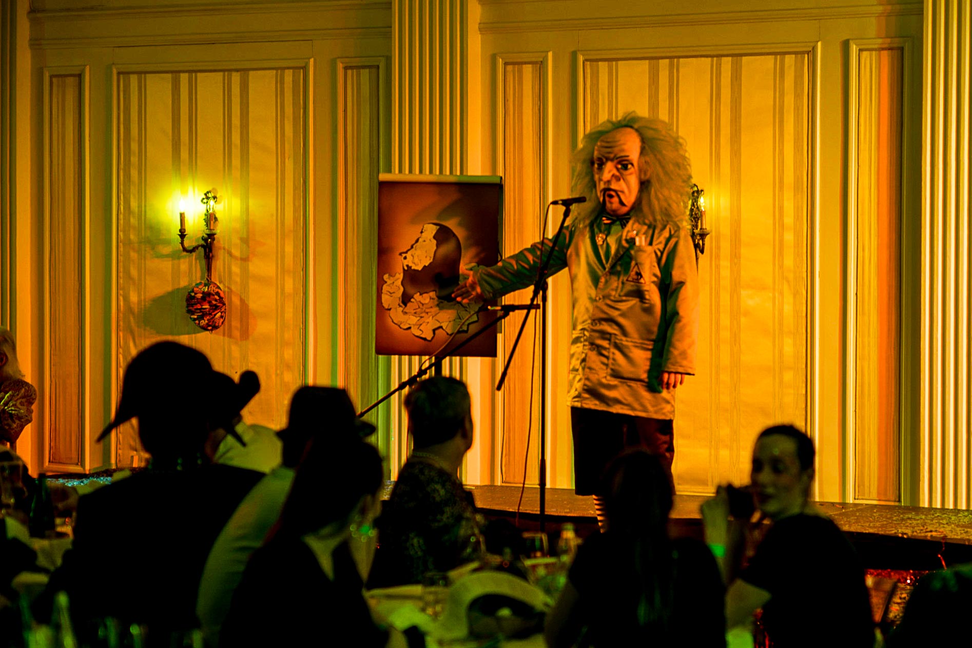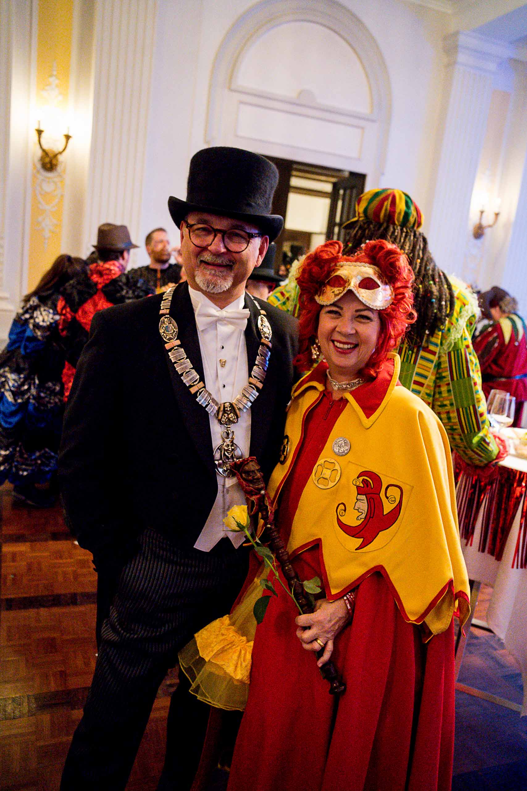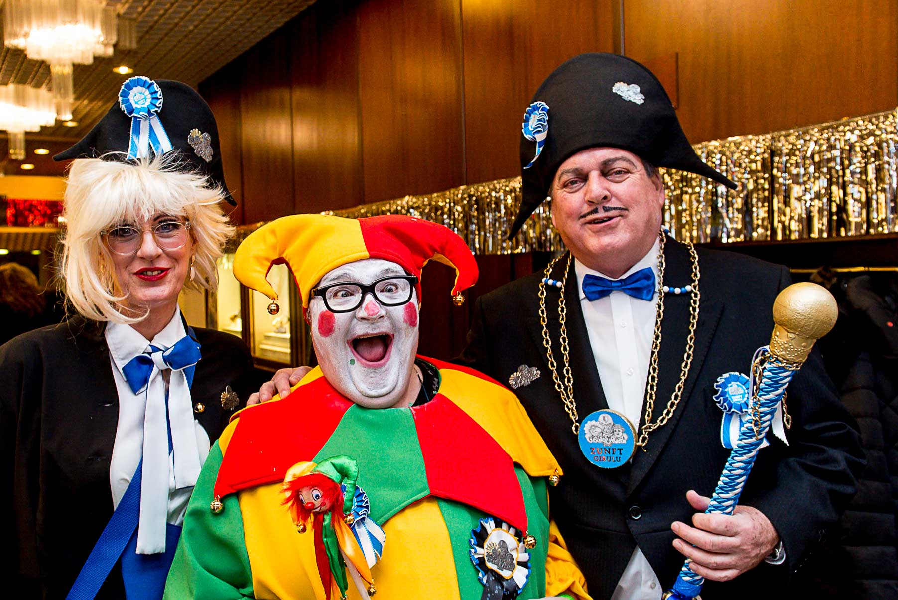 Basler Feinkost wird auf der Bühne serviert. Die Sprüche begeistern das Publikum und applaudiert den Schnitzelbangg von Schnäderänte, Schnappsbagge und Giftspritzi. Die Morenköpfe aus Basel lassen vor dem Hauptgang die bunte Gästeschar nochmals so richtig in Stimmung bringen.