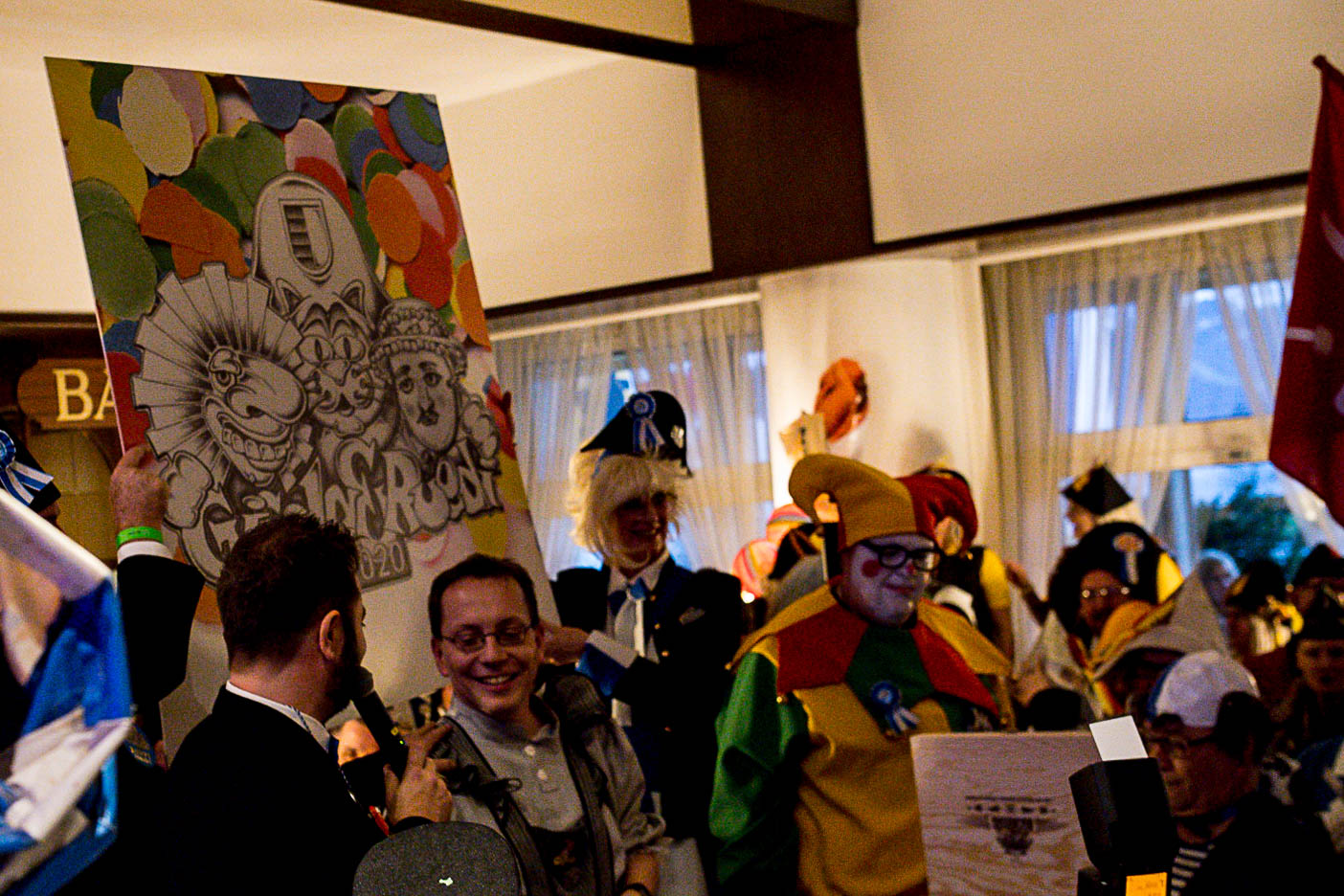 Für diesen Anlass darf eine Plakette nicht fehlen. So wie es an der Fasnacht fast Pflicht ist eine zu tragen. Diese wurde aus diversen eingegangen Vorschlägen durch das OK ausgewählt. Vor versammelter Gästeschar wird Basil Koch auf die Bühne geholt. Schon wieder ein Plaketten-Sieger oder hat er sich geirrt? Er hat gerade die 2020 LFK Plakette entworfen. Und was wird da auf der Bühne einem präsentiert? Ein etwas angepasster alter Entwurf. Dieser hat aber nur zu einem 2. Platz gereicht. Jetzt wird es ruhig im Saal. Wer hat die Plakette bei Gisela & Ruedi entworfen? Der Künstler kommt aus Deutschland.