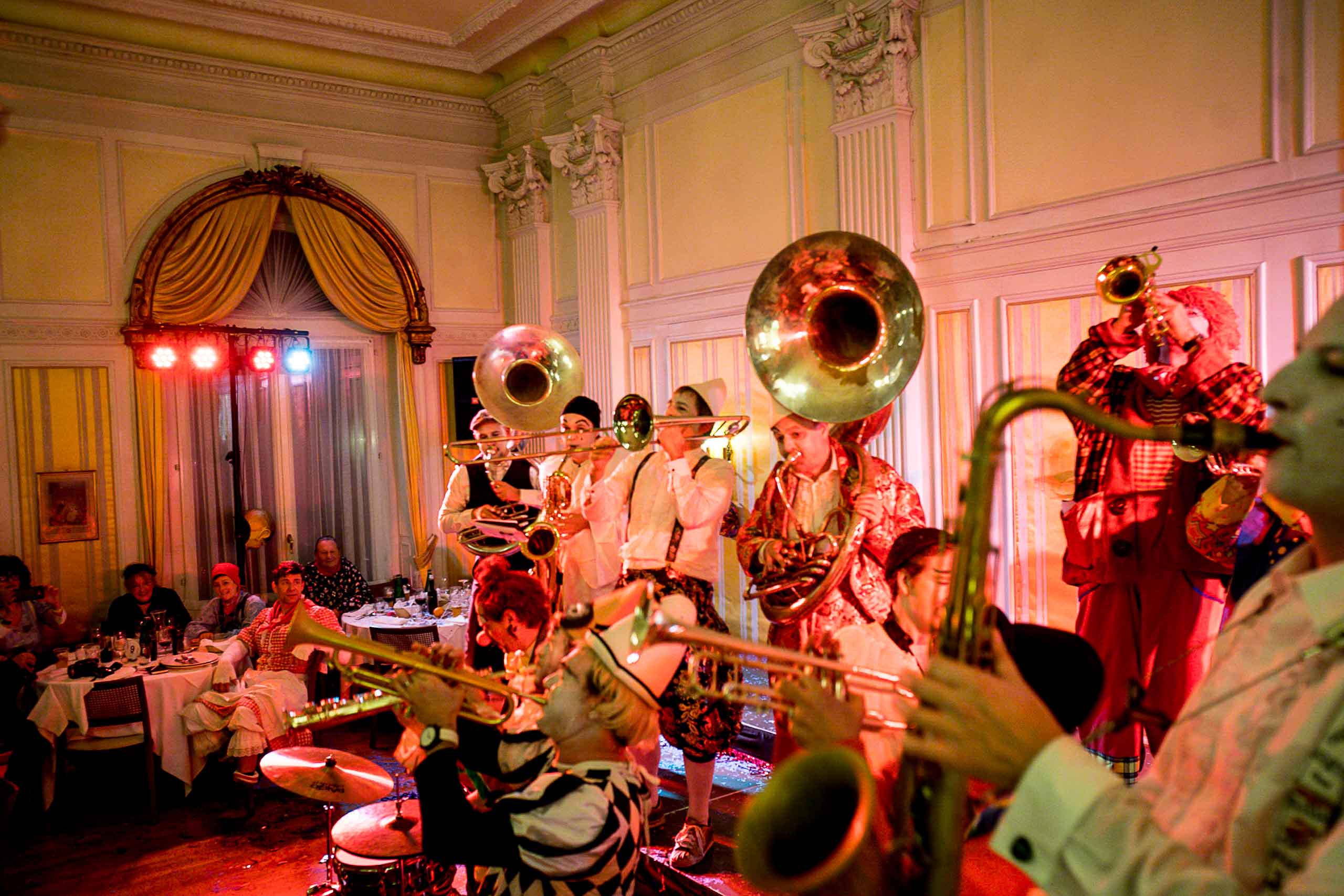 Einen musikalischen Espresso gibts noch vor dem ersten Gang. Und plötzlich stürmen Fasnachtsgestalten mit lauten Schellen in den Saal.