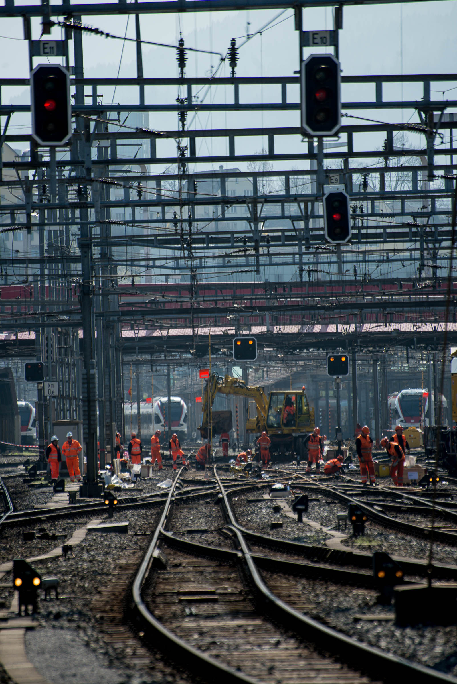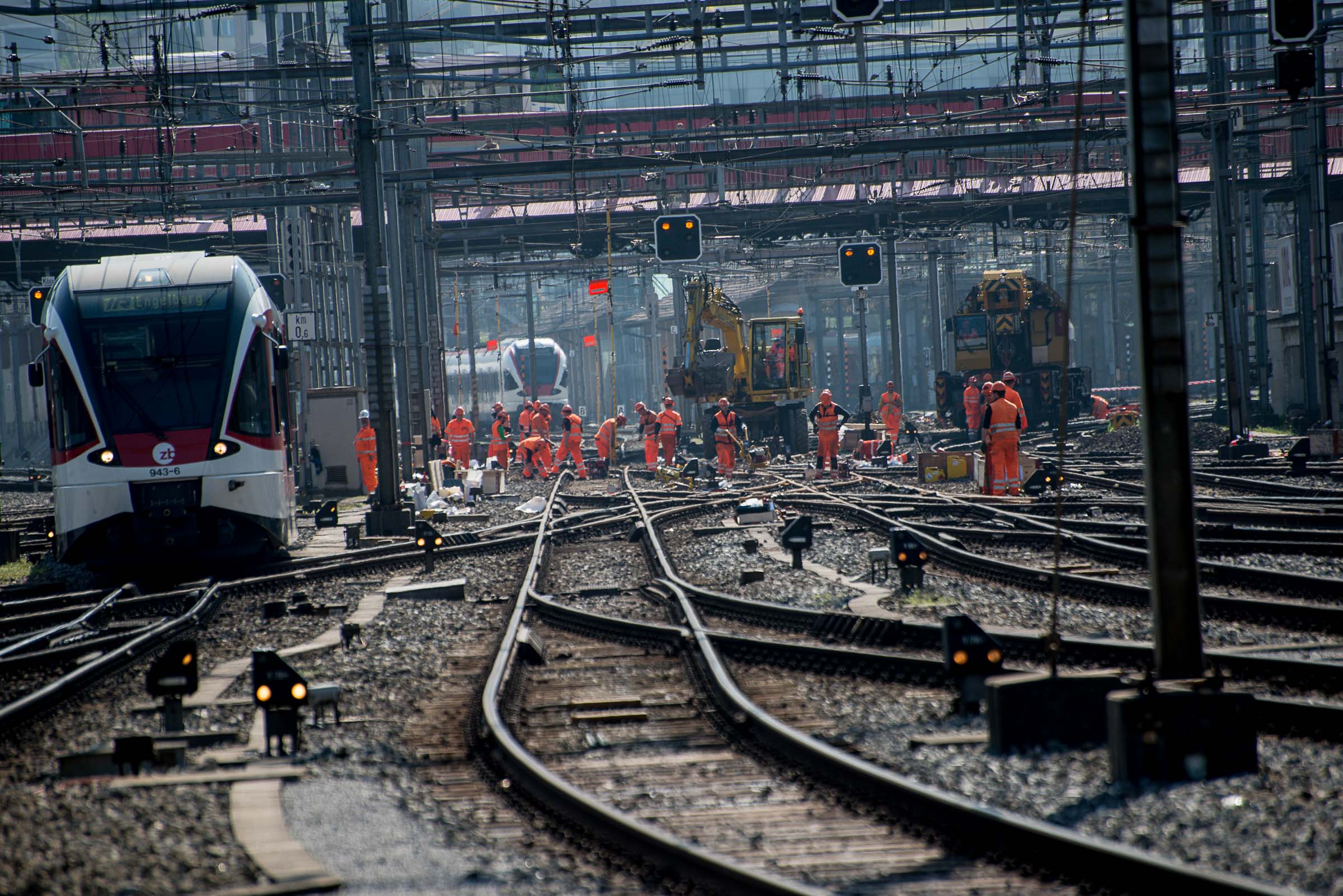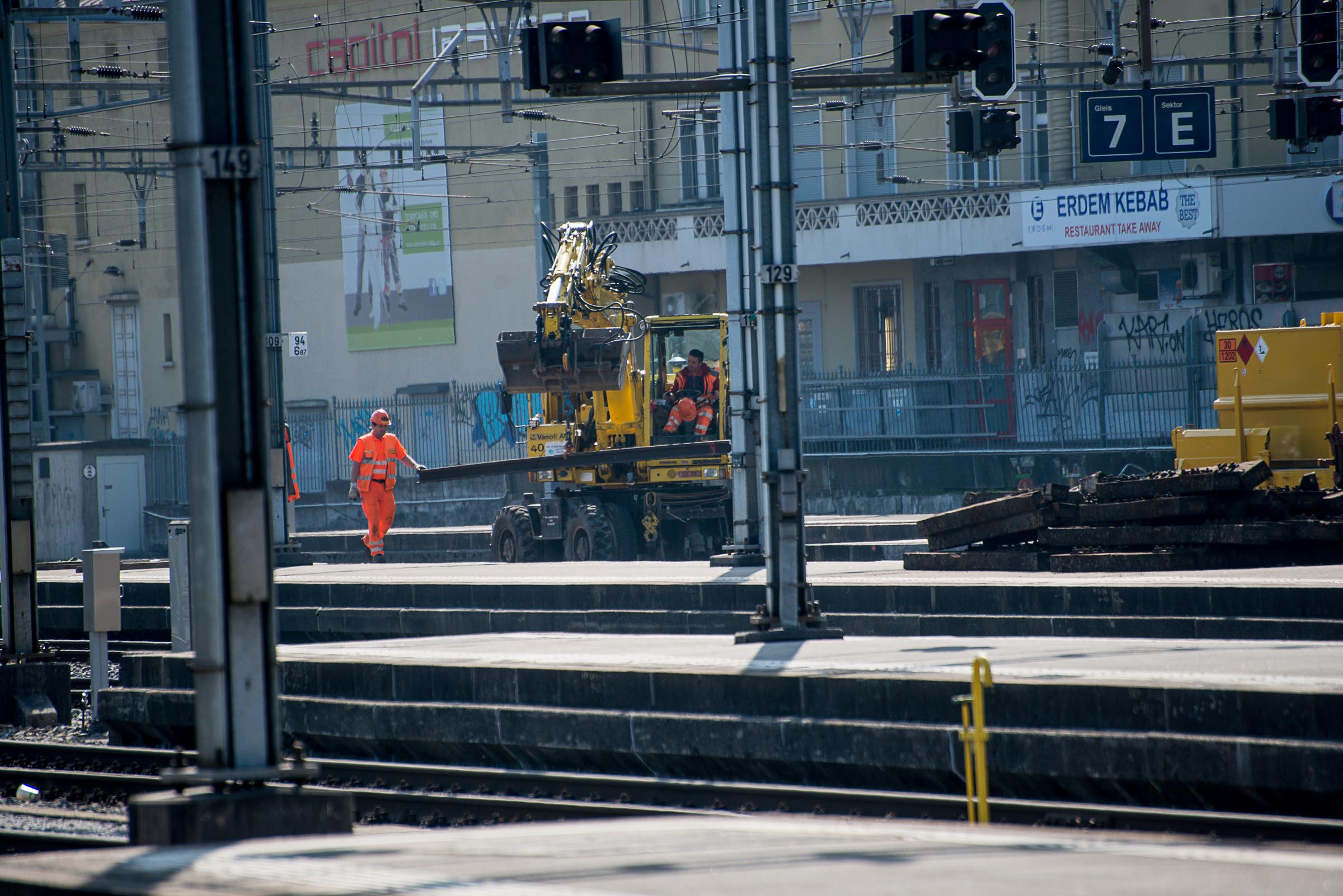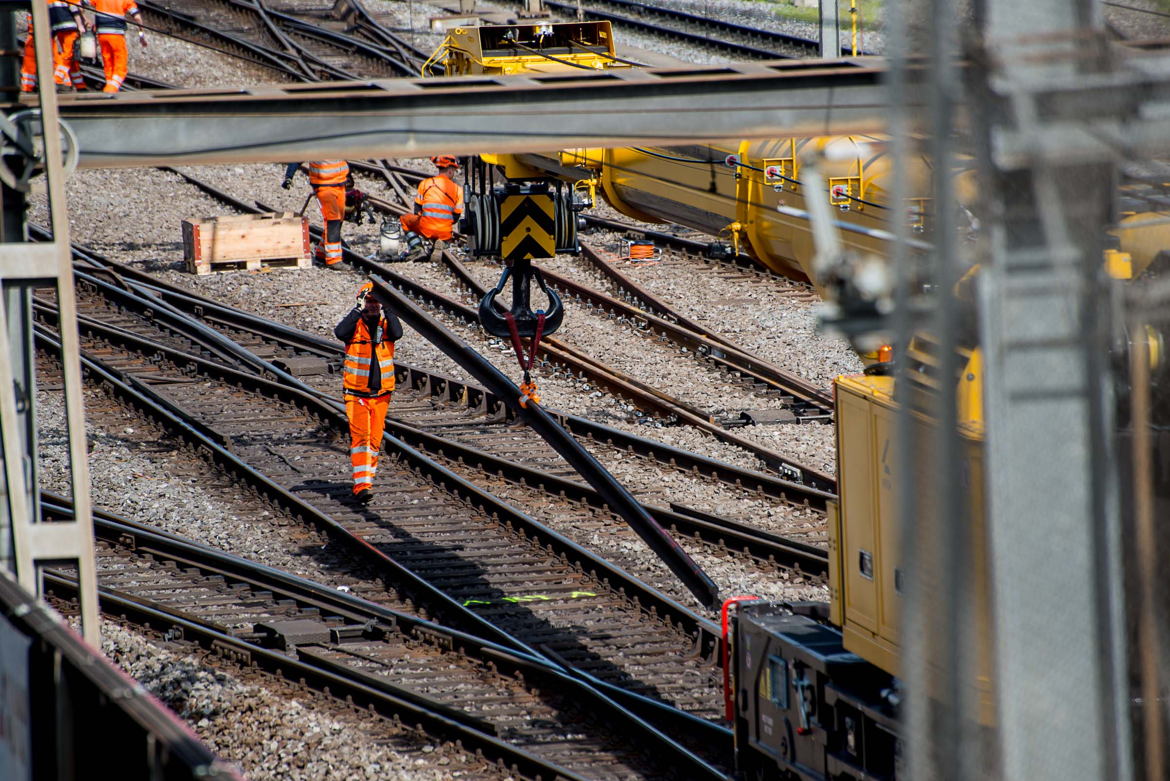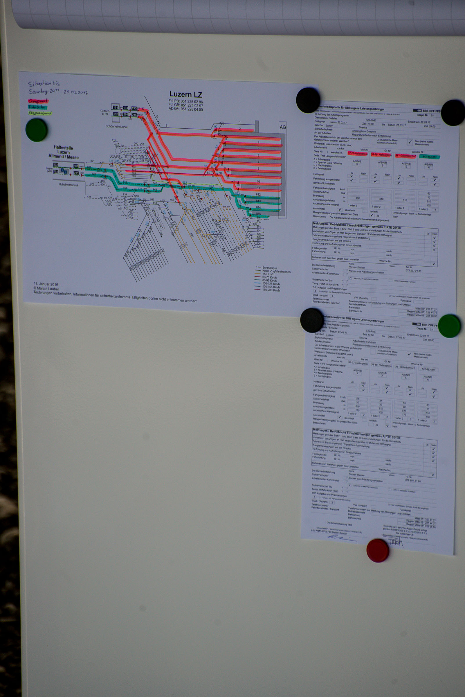 Die Weichen 37-77, 38-88 und 38 werden heute eingebaut. So steht's auf dem Sicherheitsdispositiv. Nebenan können die Züge der Zentralbahn Richtung Allmend mit 6o km/h vorbeifahren. Bevor ein Zug vorbeifährt, tönt ein akustisches Alarmsignal.
