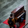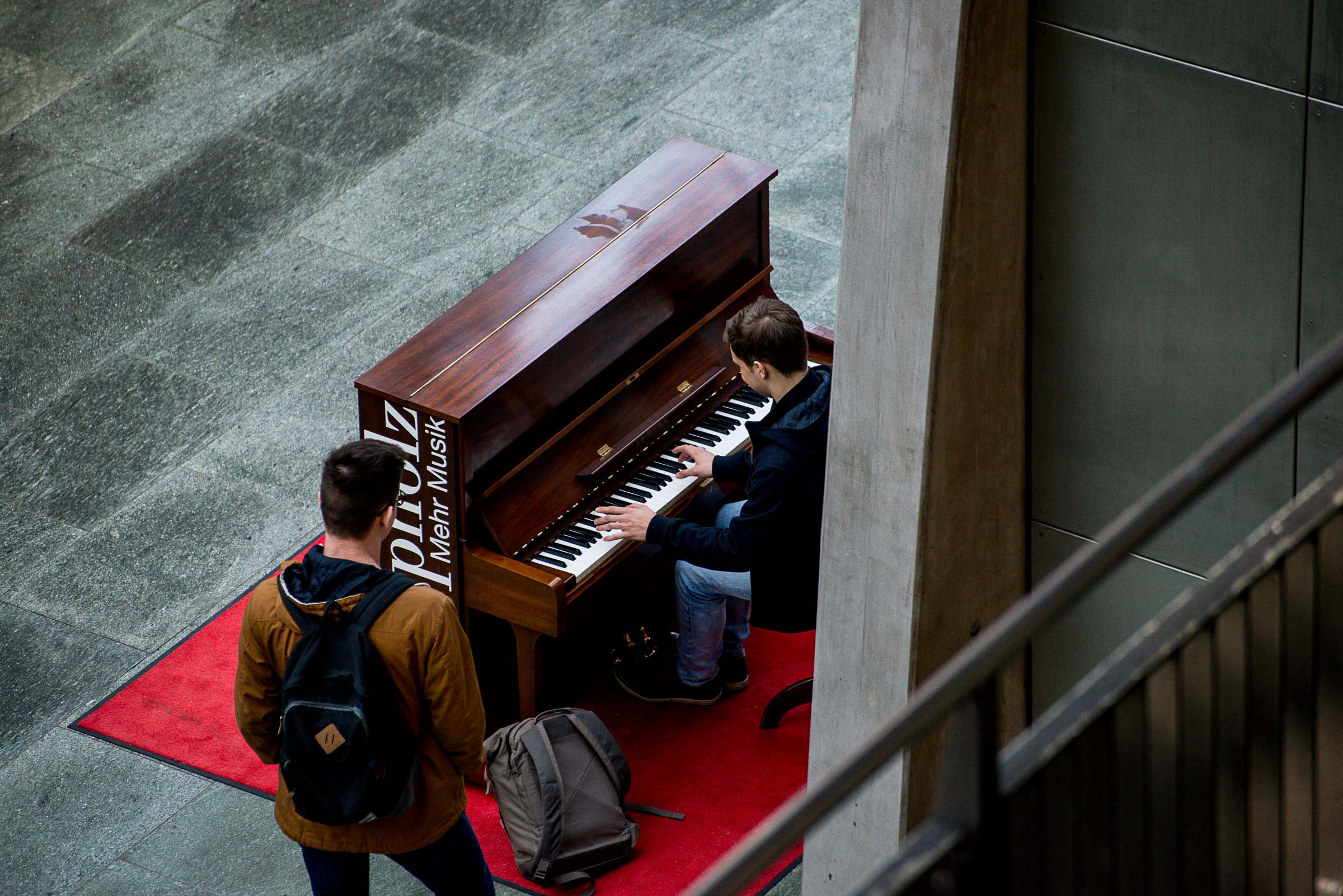 Im Bahnhof steht ein Klavier inkl. Pianist. Ein Zuhörer steht daneben. Es ist ruhig im Bahnhof. Dafür gibt’s heute Bahndurchsagen auf Italienisch und Deutsch.