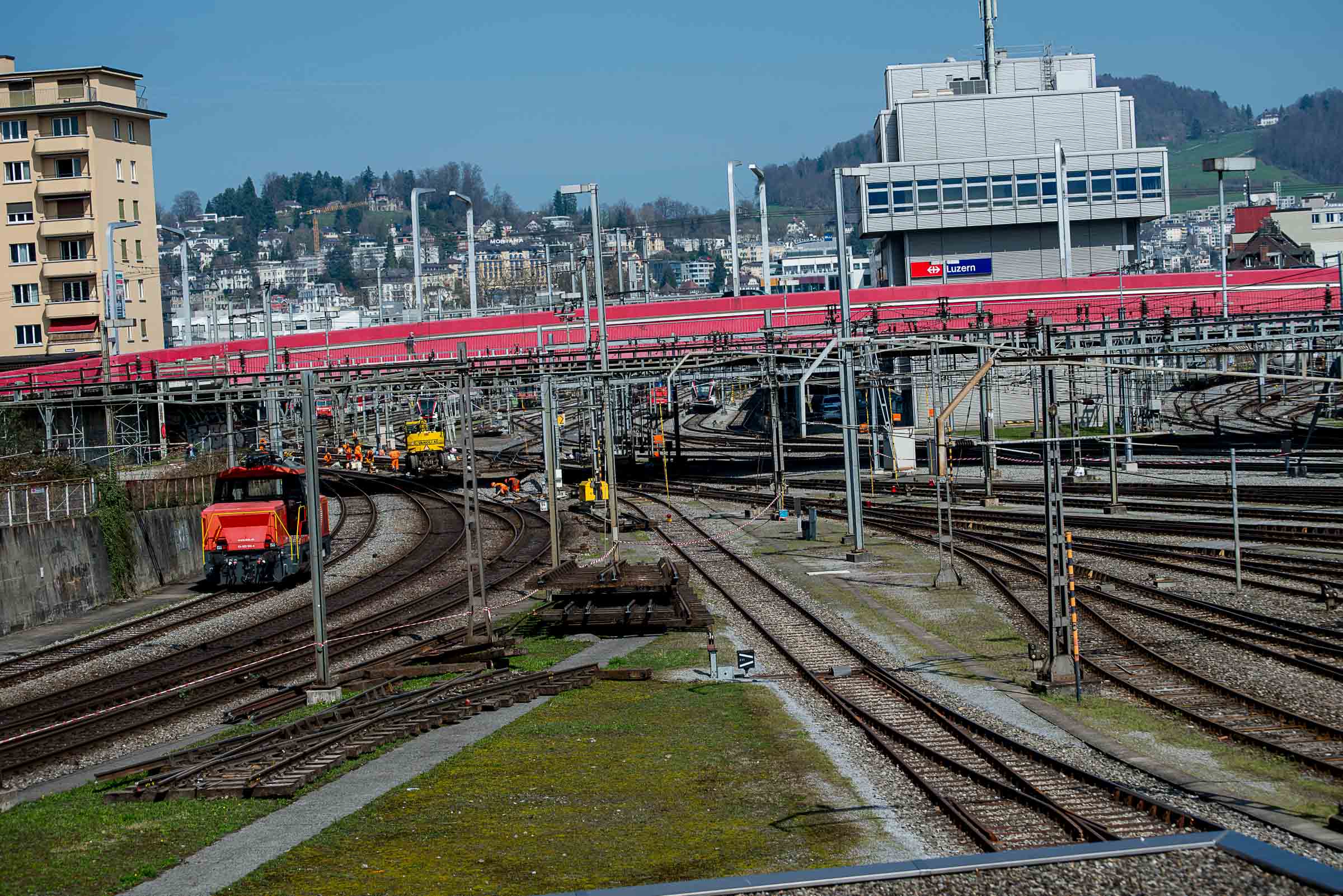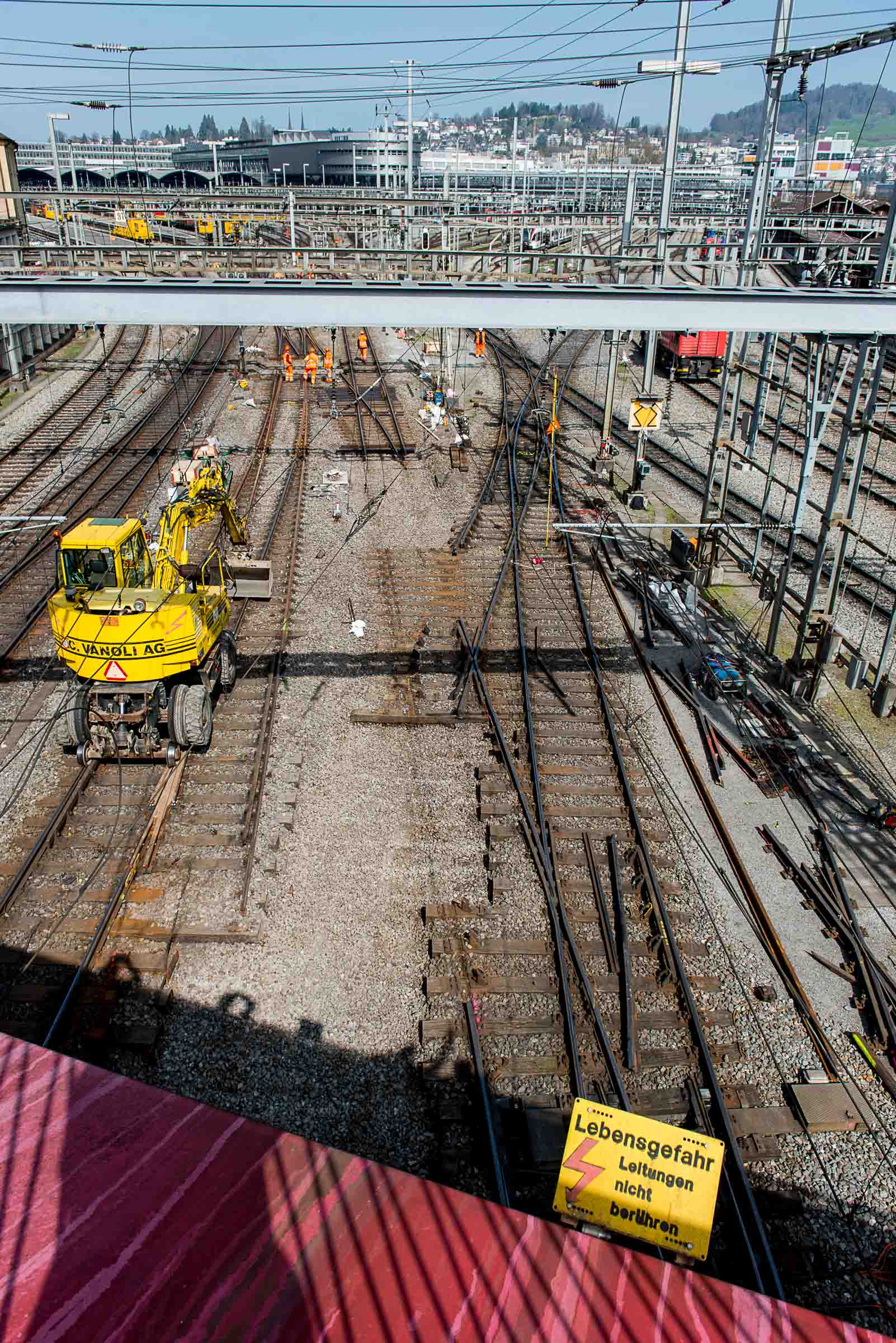 Auf der Einfahrstrecke in den Bahnhof Luzern, muss bis am Sonntag die Instandstellung der Gleise, Weichen und dem Unterbau fertig sein. Bis dann wird auch der ETR 610 auf Gleis 7 stehen bleiben. Verdeckt für die vorbeispazierenden Bahnhofbesucher, steht er still und wird gründlich untersucht.