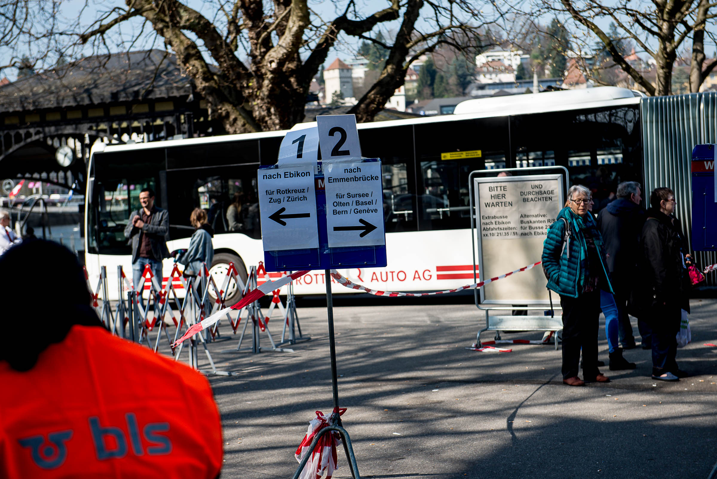 Die anderen Gleise sind heute alle abgesperrt, ausser Richtung Engelberg und Interlaken. Die Fahrgäste werden mit Bussen in die Vorort Bahnhöfe von Luzern gefahren. Auf der Strecke Richtung Emmenbrücke ist die Busabfahrt jetzt schon wieder um x Minuten verschoben. Der Bus kommt und alle quetschen sich rein. Dass im nachfolgenden Bus, der mit 200 m Abstand fährt, die meisten Plätze frei sind, sieht nur der Schreibende.