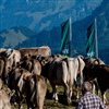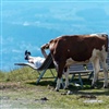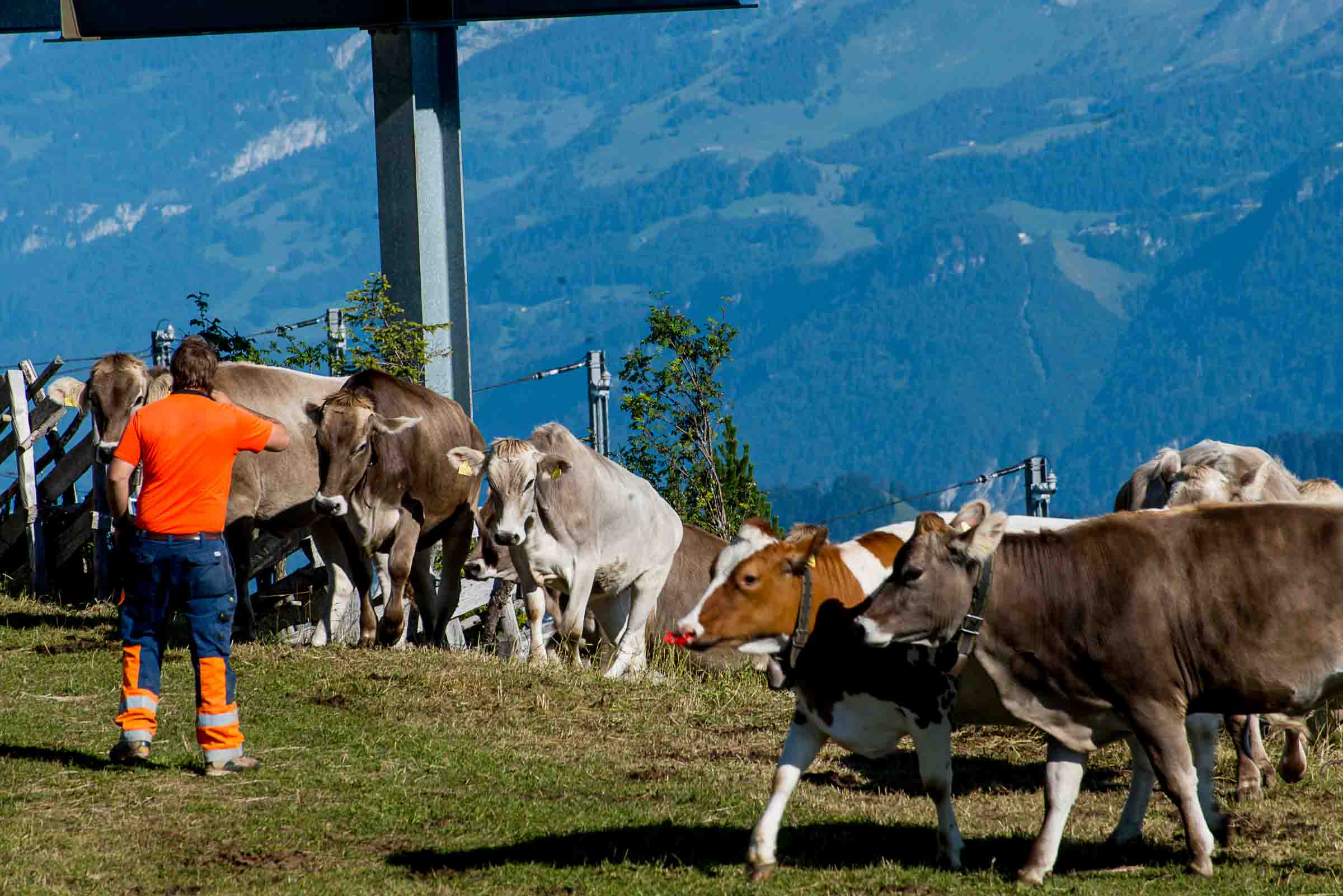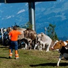 Höchste Zeit für die Kuhherde. Zurück in den Stall. Unter der Terrasse, wo noch vor wenigen Momenten einige Touristen neben Kühen auf Holzstühlen die Sonne genossen haben, ziehen die Kühe weiter.