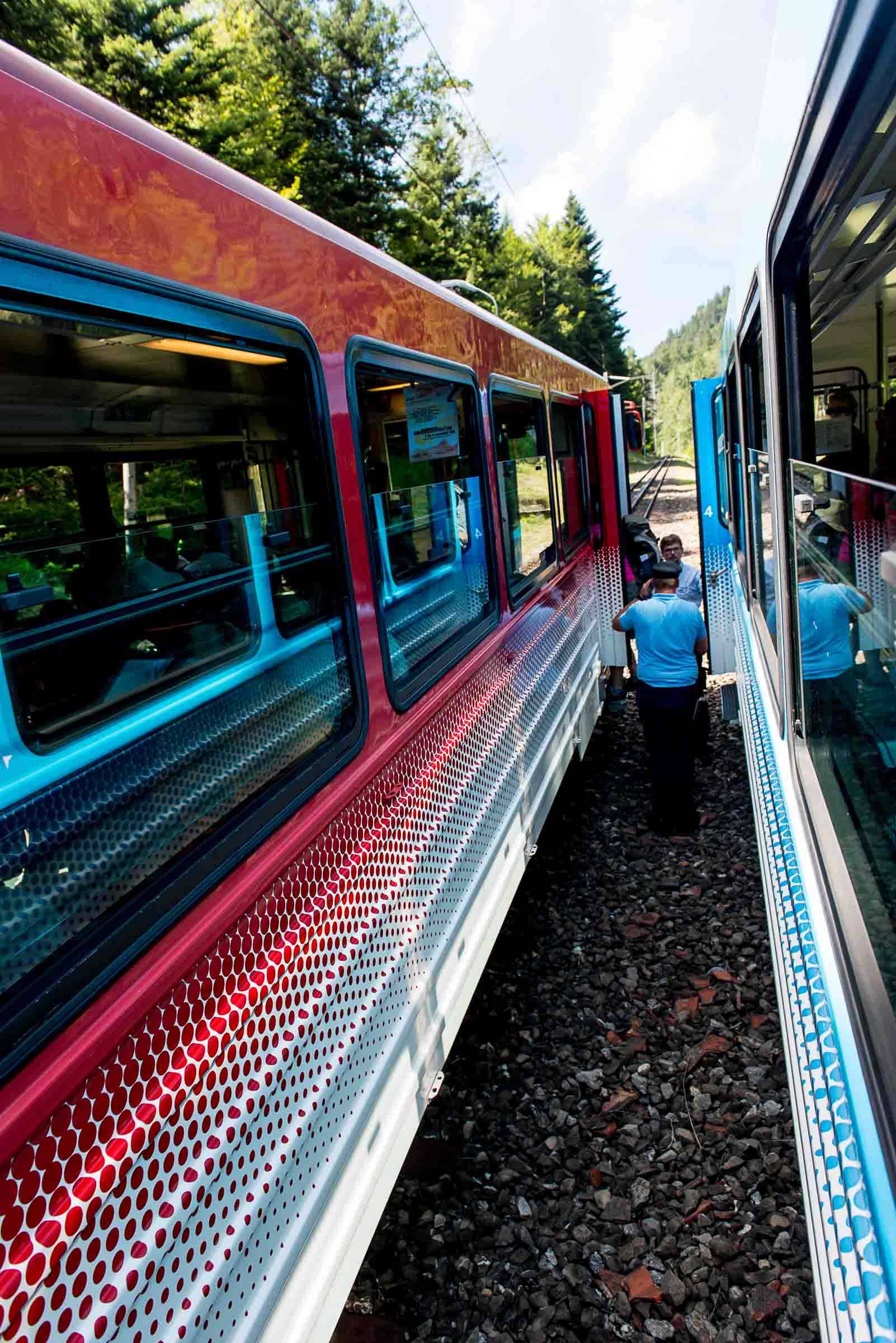 Ja, heute fährt ein rotes und ein blaues Bähnli. Bis 1991 war es nicht möglich von Goldau nach Vitznau ein Schienenfahrzeug auszutauschen. Es gab Tage, da hatten die Blauen zu viel und die Roten zu wenig Passagiere. Die erste Weiche und die Verbindung von Blau zu Rot war gelegt. Und heute fahren die Bahnen je nach Bedarf.