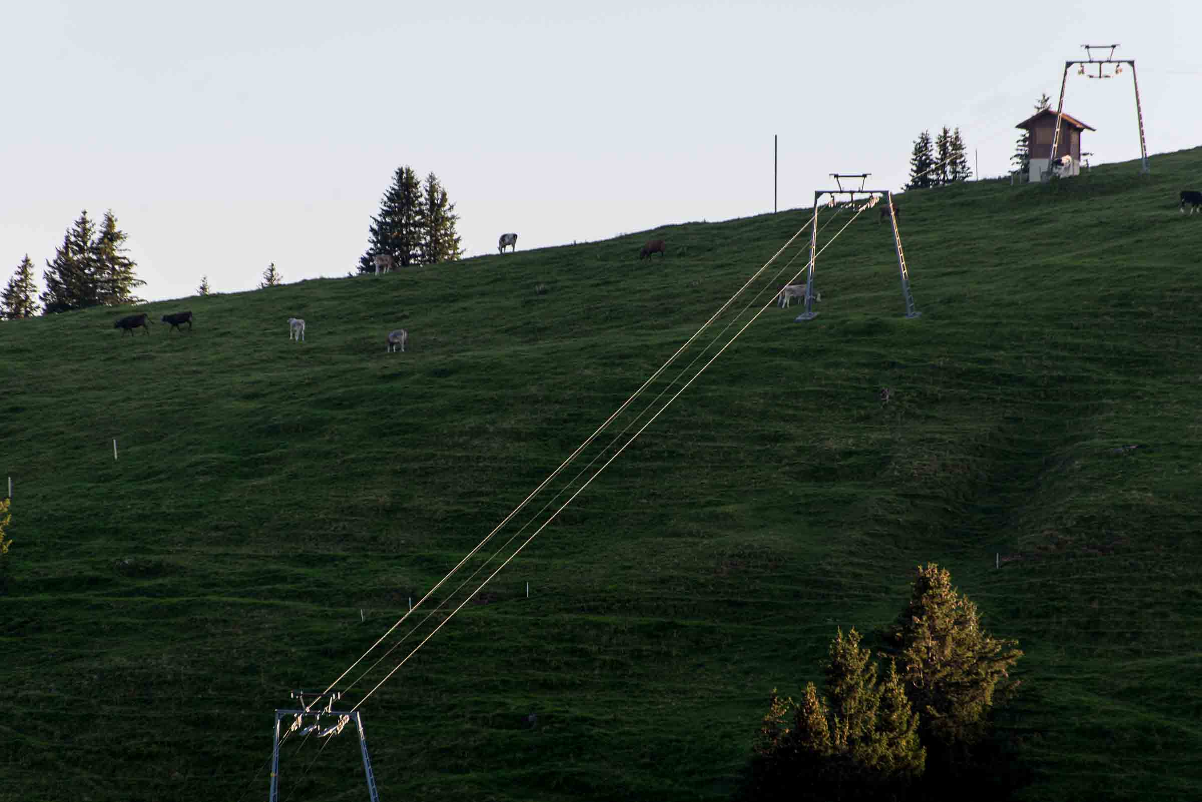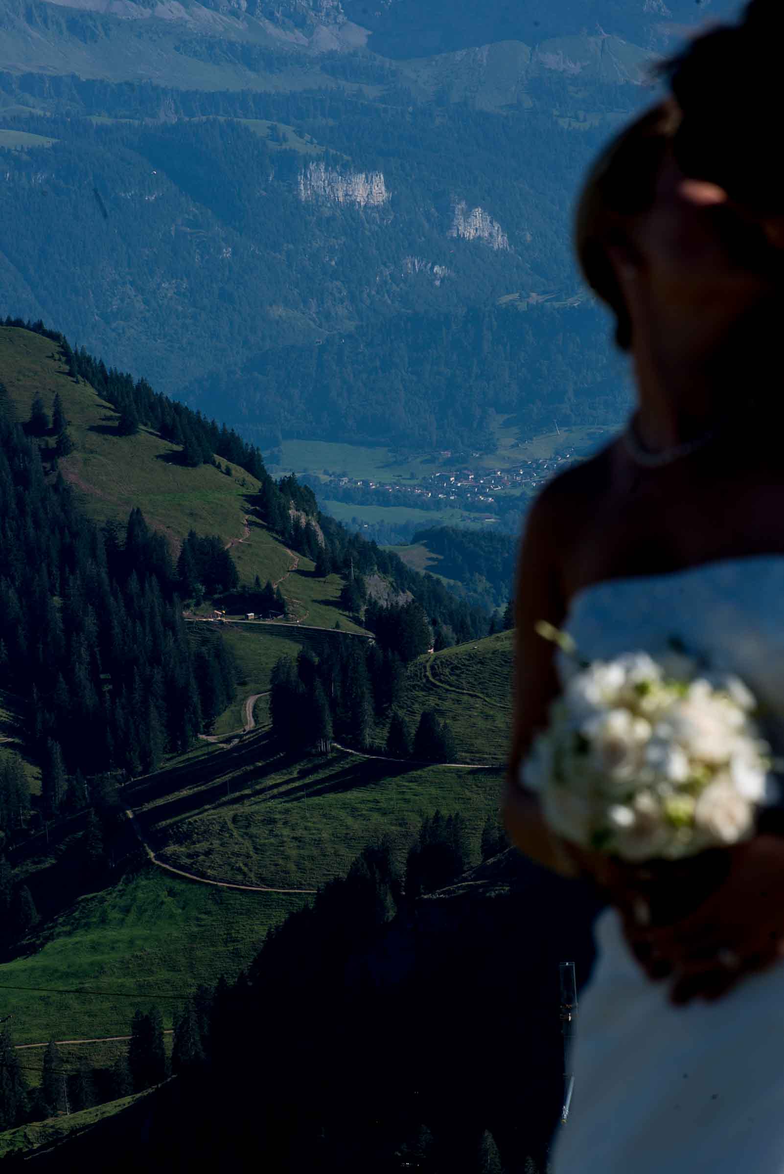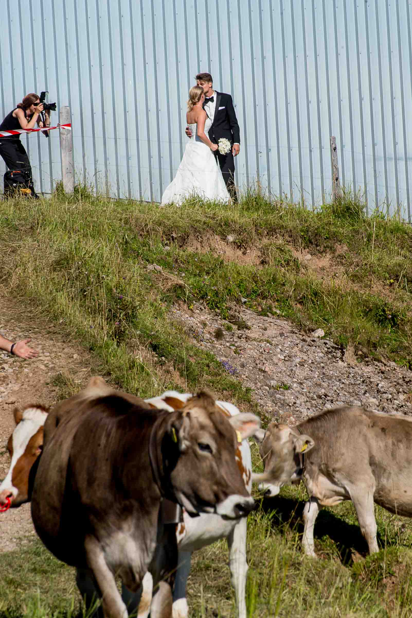 Das Brautpaar ist jetzt angekommen. Die Photographin auf Besichtigungstour und schon das erste Sujet. Die Kühe störts nicht. Den Bräutigam schon. Auf dem weiteren Weg zur richtigen Position für's Photo ist er in die Schei… gestanden. Und das Brautkleid hat auch etwas braune Farbe abgekriegt und duftet nach Alpenparfüm.