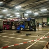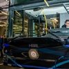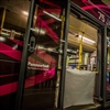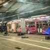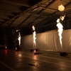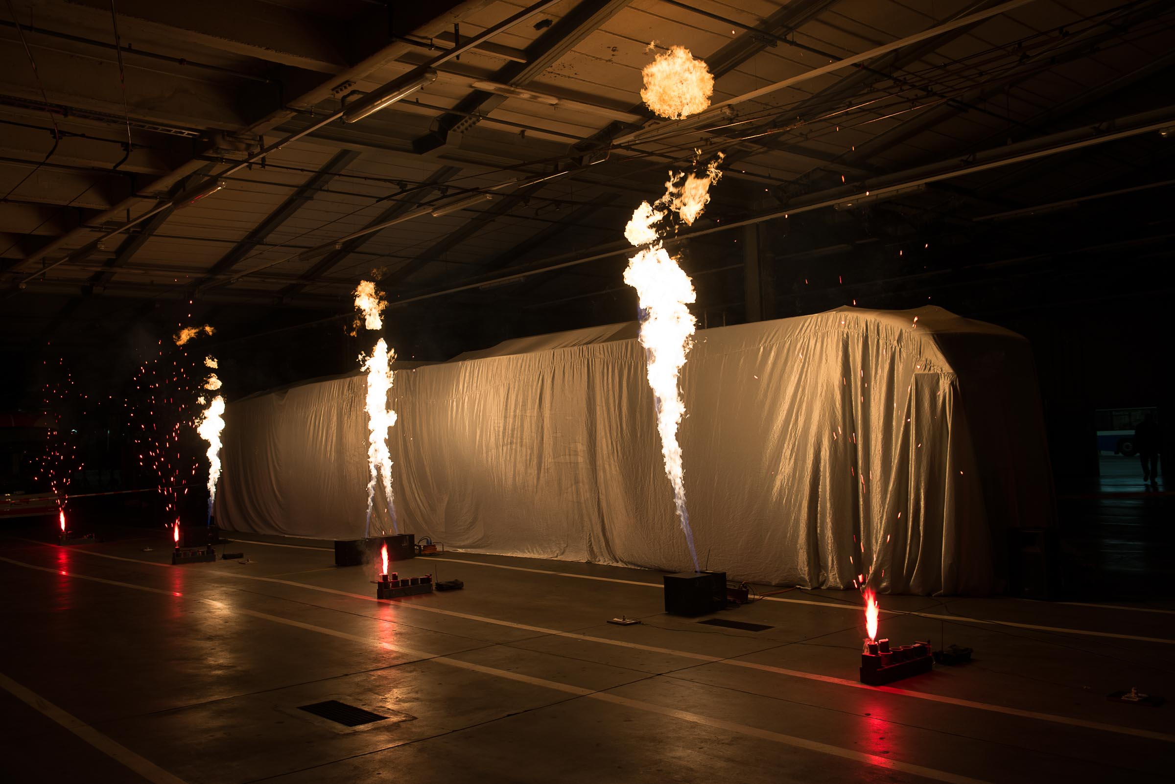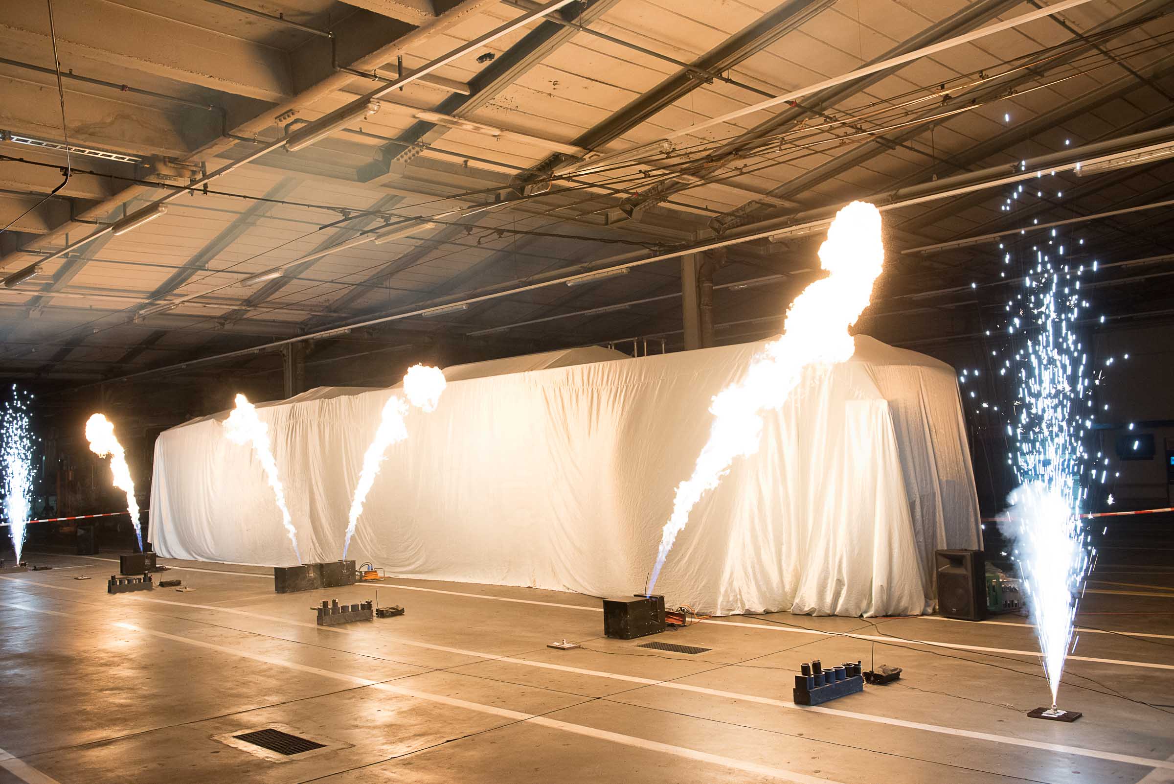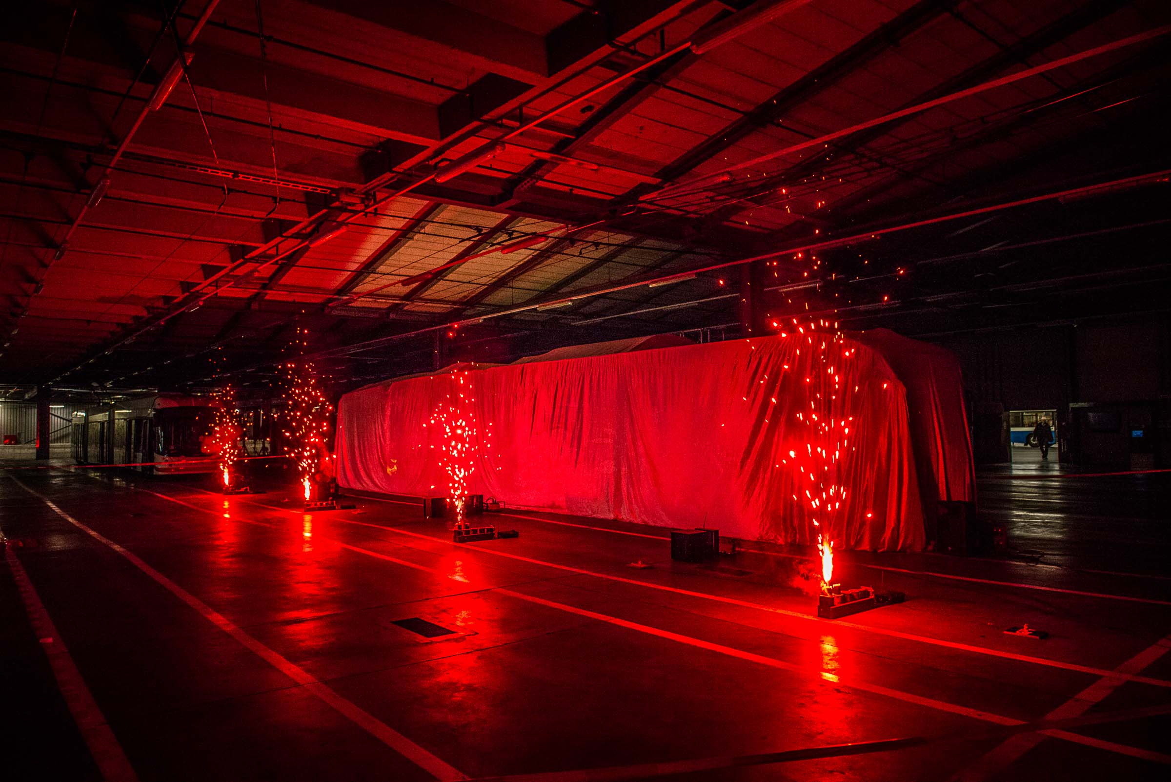 Mit der feuertechnischen Begrüßung durch die Pyromantiker konnten die Mitarbeiter den neu verpackten Bus im Depot in Empfang nehmen.