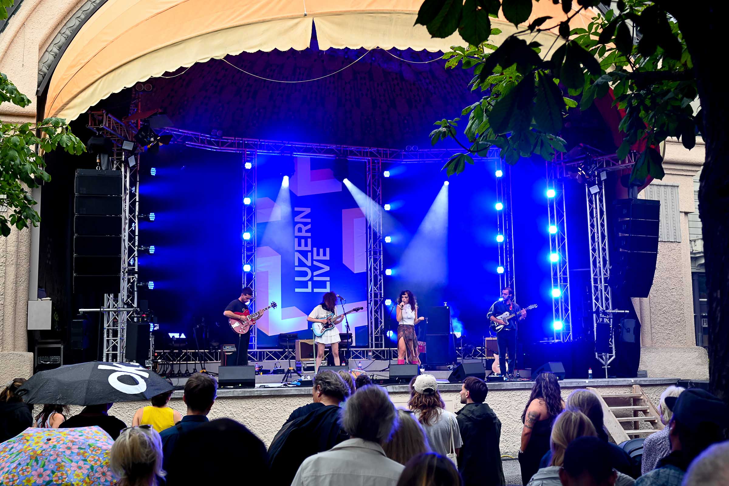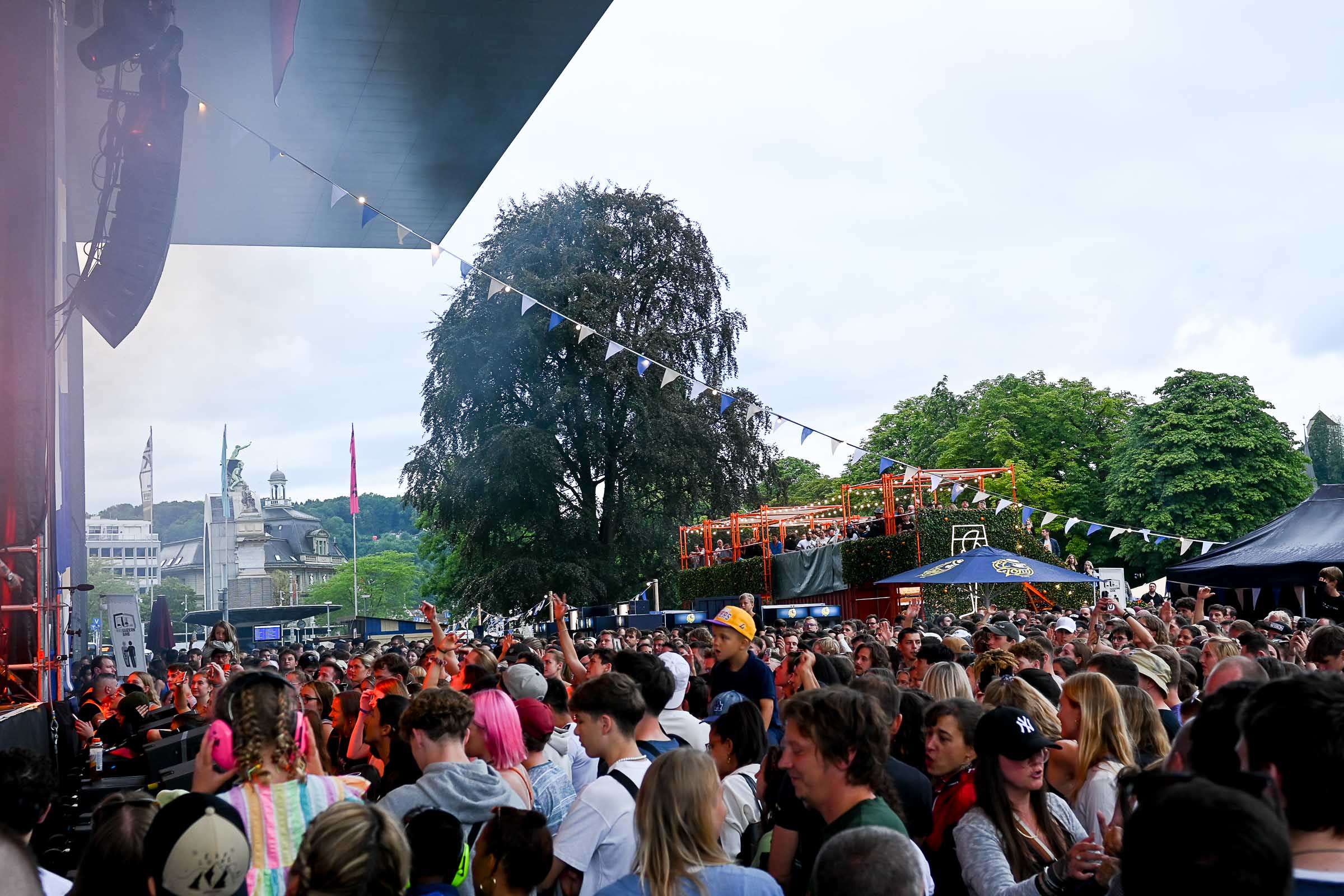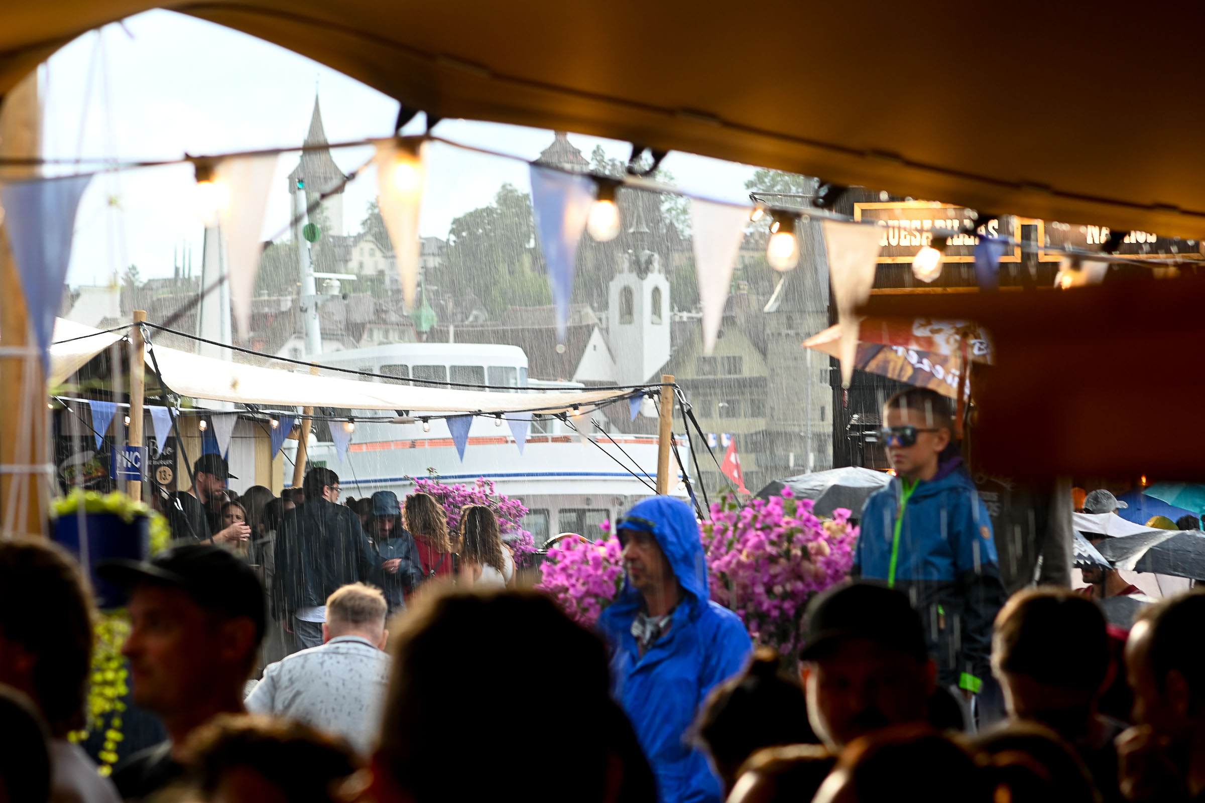 Und falls mal ein Sommer-Gewitter über den Pilatus Richtung Luzern zieht, die Zelte lassen den Regen schön draussen und die freie Sicht auf die Bühne ist inklusiv, und für die Regentropfen gibts ein DisLike vom Publikum.