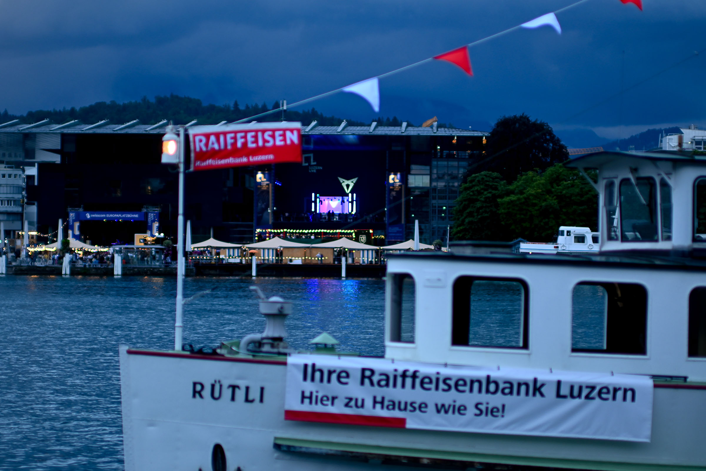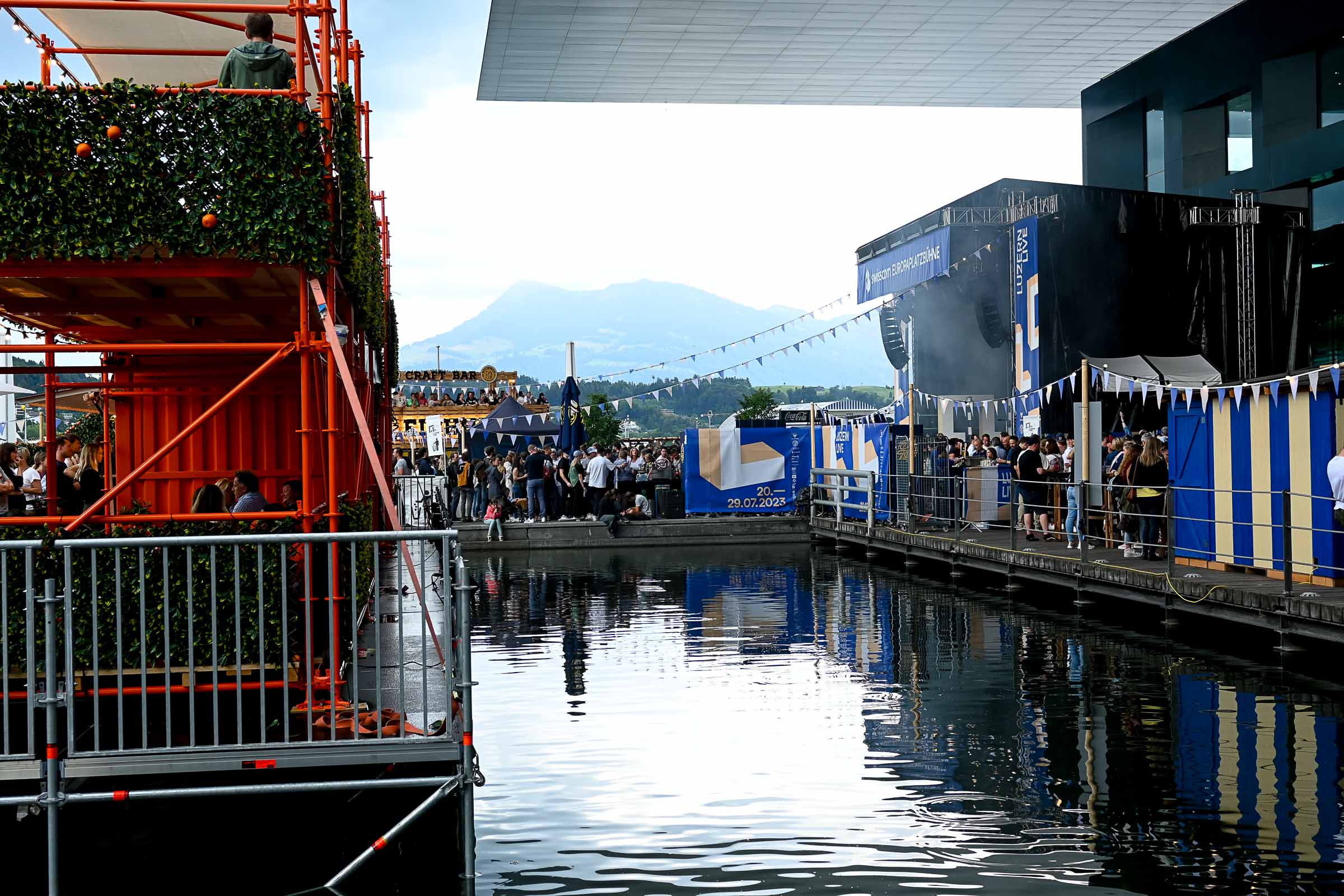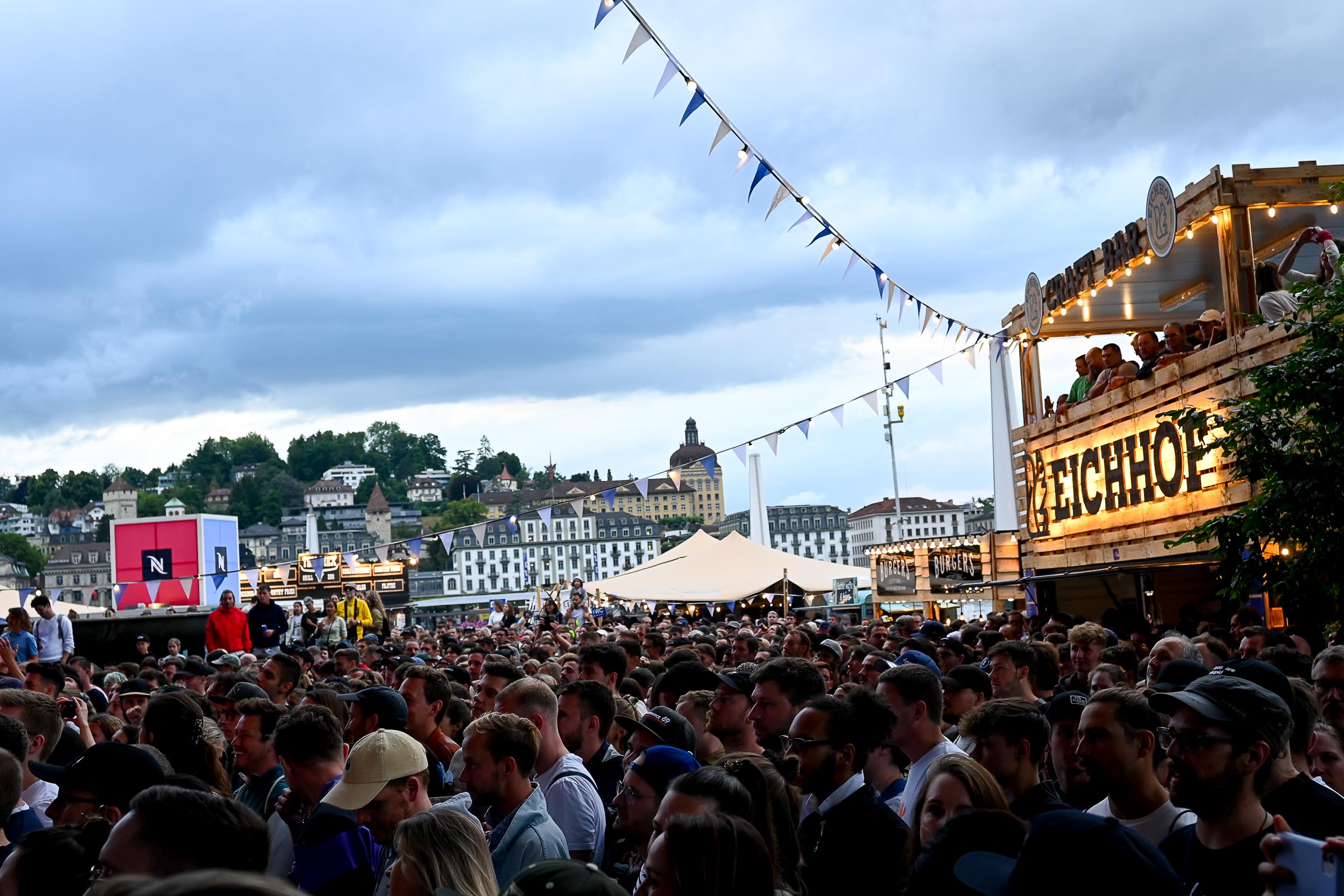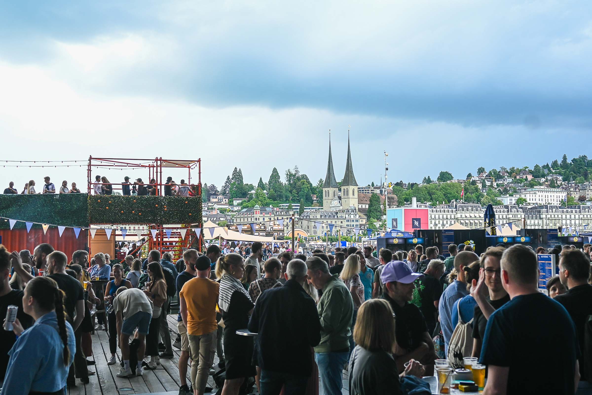 «Die Stadt vibriert!» meinten 4 Besucher:innen am Eröffnungsabend am Donnerstag auf der KKL Terrasse. Nach einer Pause von zwei Jahren ist das Nachfolge Festival in voller Pracht am See angekommen. Ob Getränke mit moderaten Preisen (ohne Preiserhöhungen beim Bier), Essen oder Musik geniessen. Und wie sagte der Raiffeisen-Sponsor des Shuttle Schiffs, das zwischen KKL und Quai im Einsatz ist.