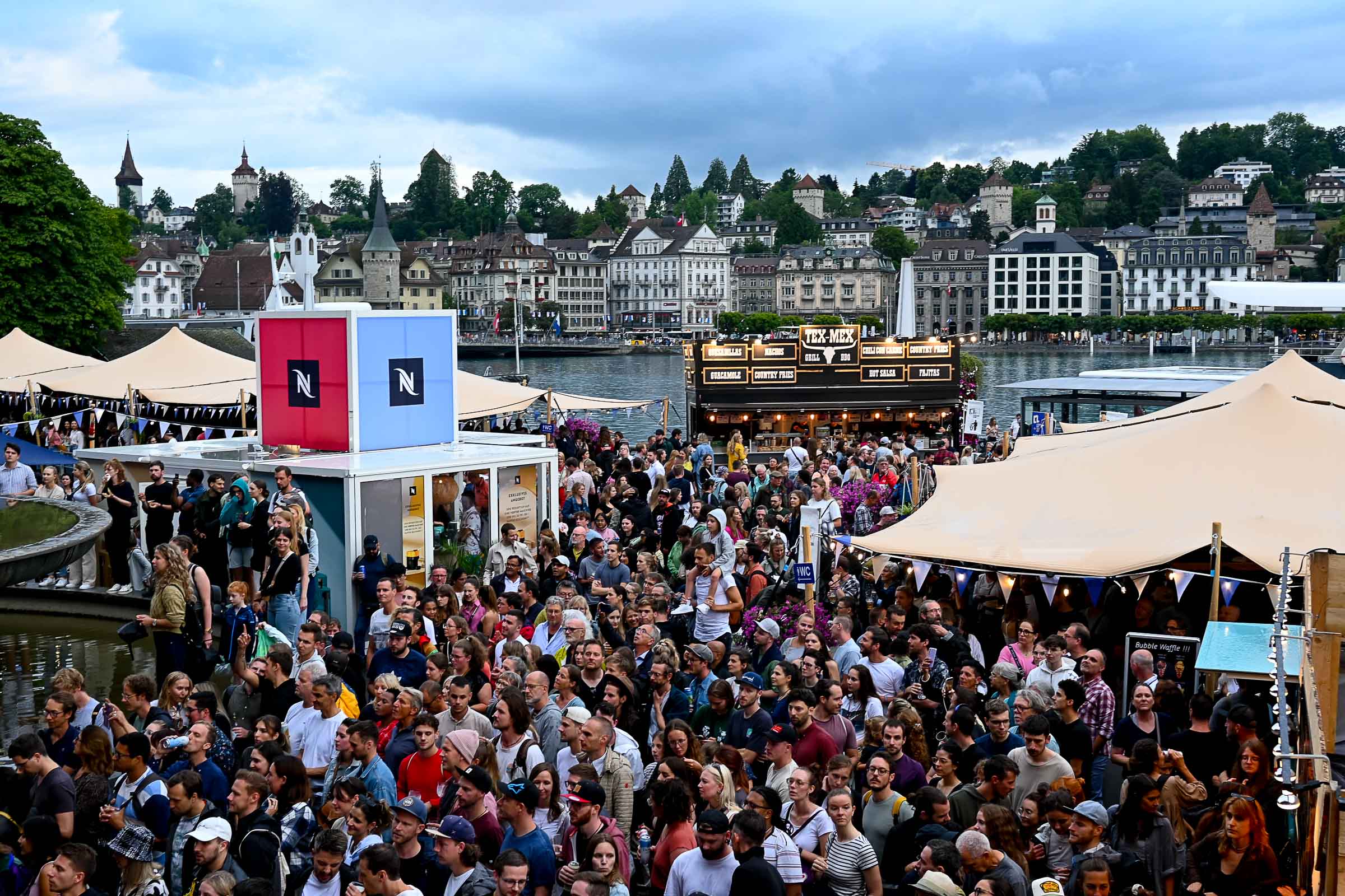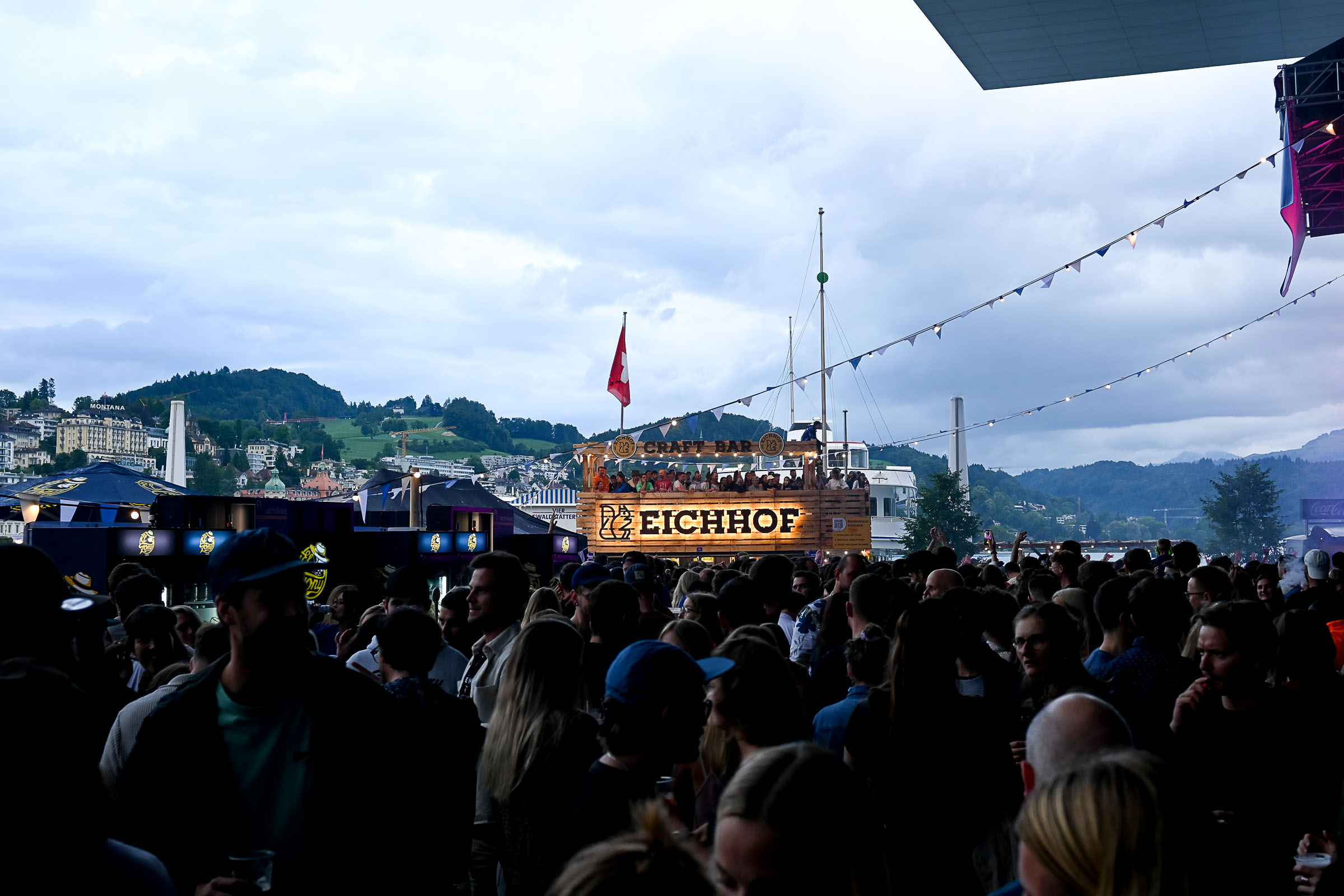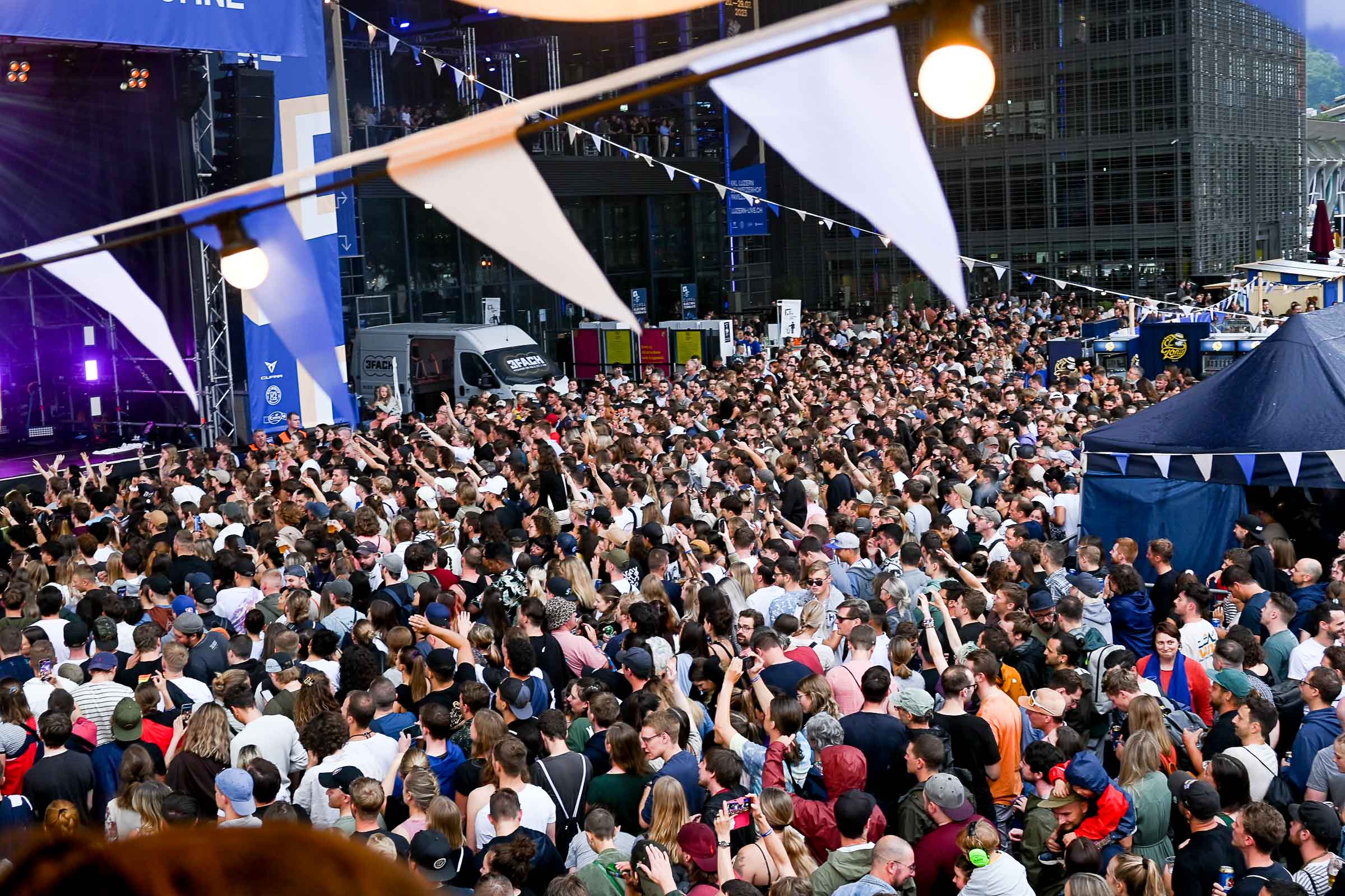 «Die Stadt vibriert!» meinten 4 Besucher:innen am Eröffnungsabend am Donnerstag auf der KKL Terrasse. Nach einer Pause von zwei Jahren ist das Nachfolge Festival in voller Pracht am See angekommen. Ob Getränke mit moderaten Preisen (ohne Preiserhöhungen beim Bier), Essen oder Musik geniessen. Und wie sagte der Raiffeisen-Sponsor des Shuttle Schiffs, das zwischen KKL und Quai im Einsatz ist.