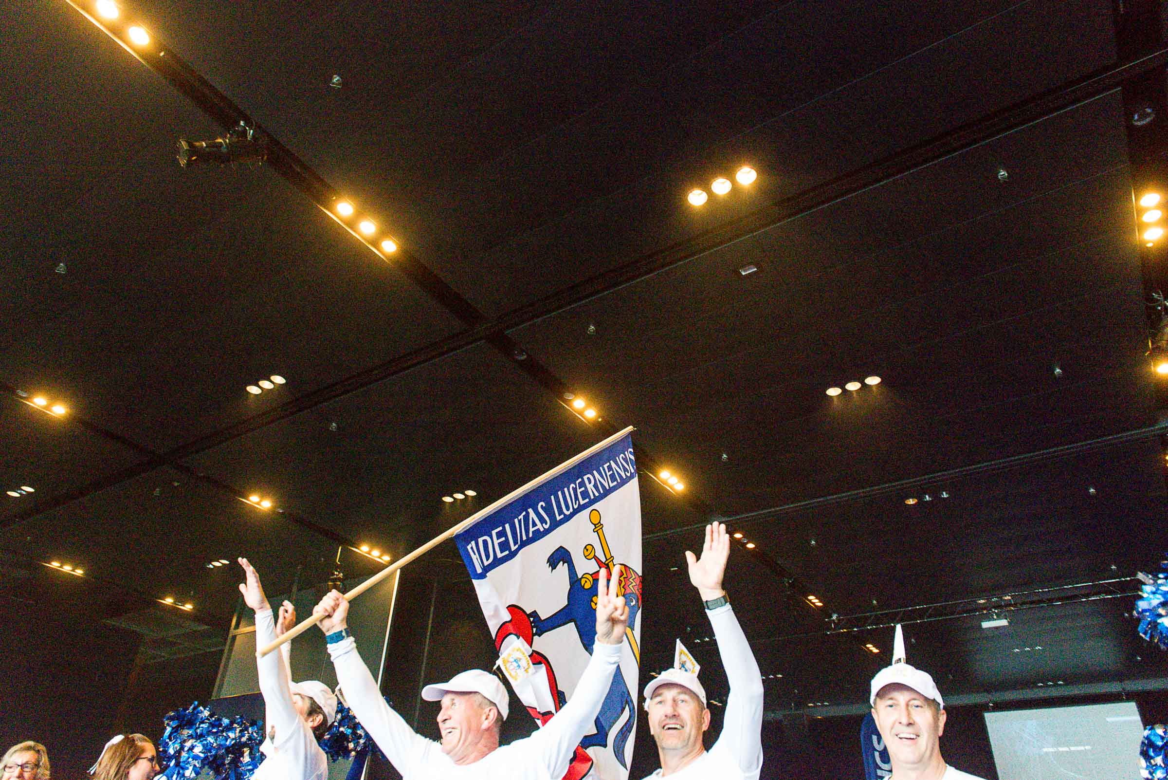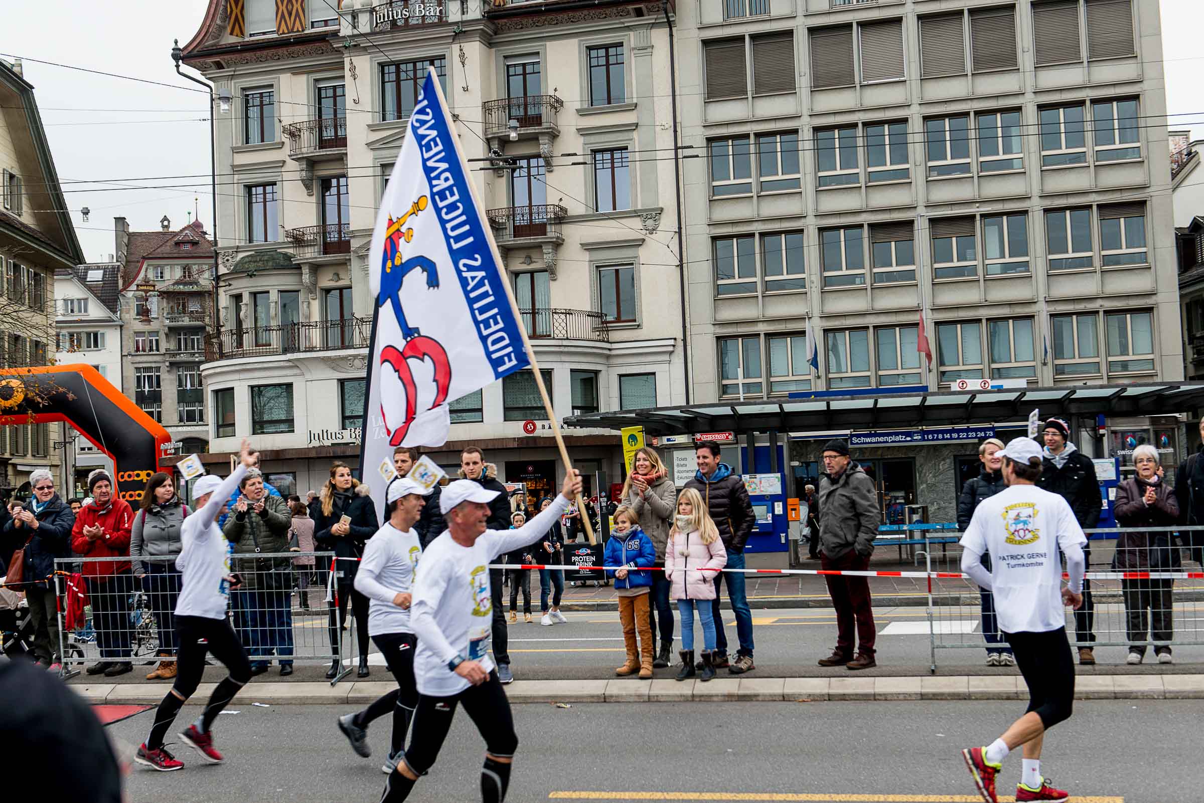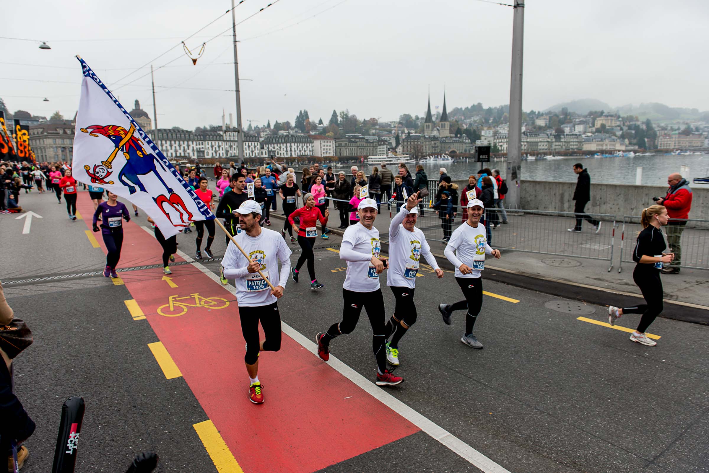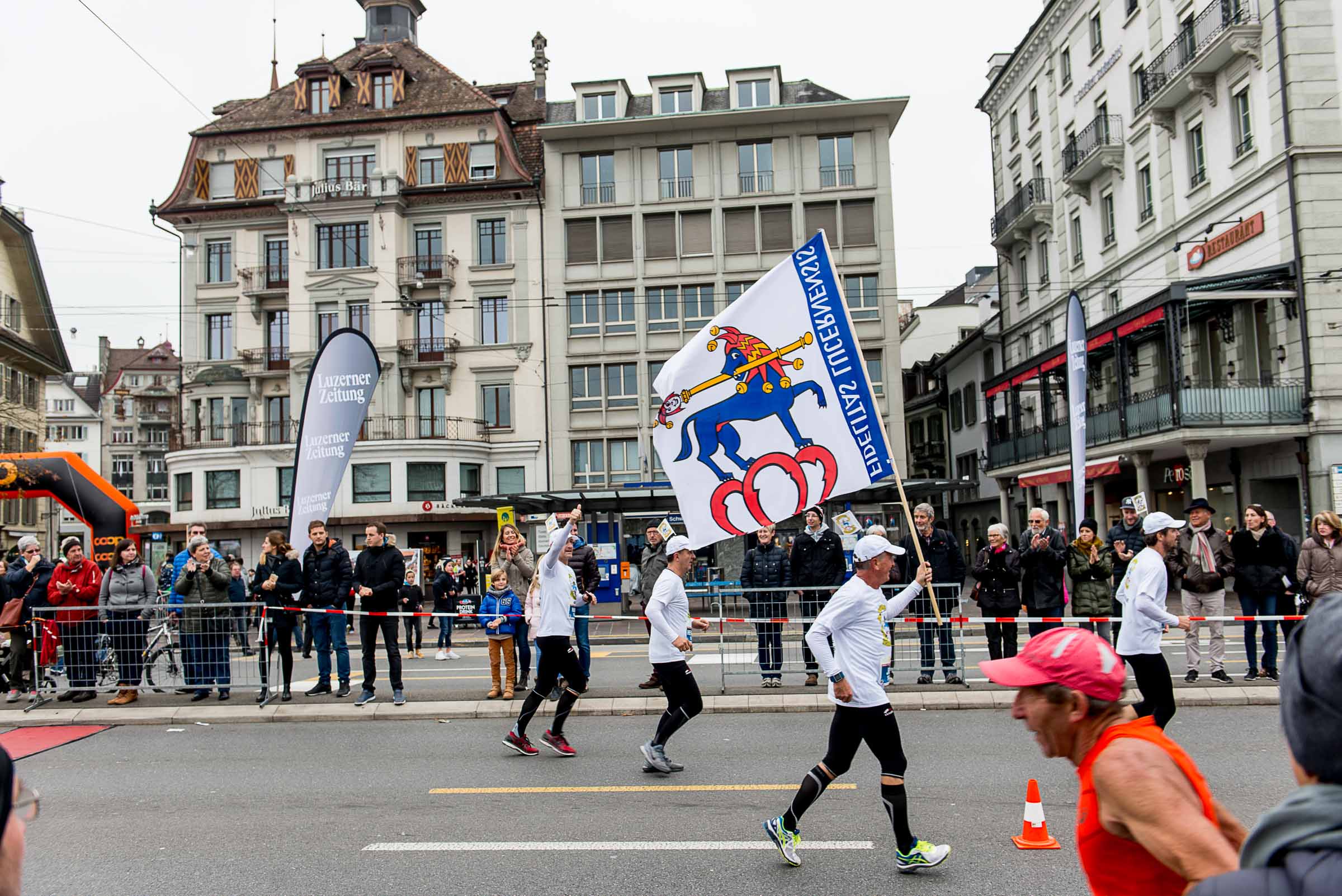 Jürg, Herbert, Patrick und Harry rennen unter der Flagge der Fidelitas Lucernensis durch die Luzerner Strassen. Mit mehrfacher Marathon- Erfahrung sind sie dieses Jahr auch wieder mit dabei, natürlich mit der Fahne der Fidelitas. Für Photographen im grossen Menschengewühl ein fixer Punkt, der unübersehbar aus der Menge ragt.