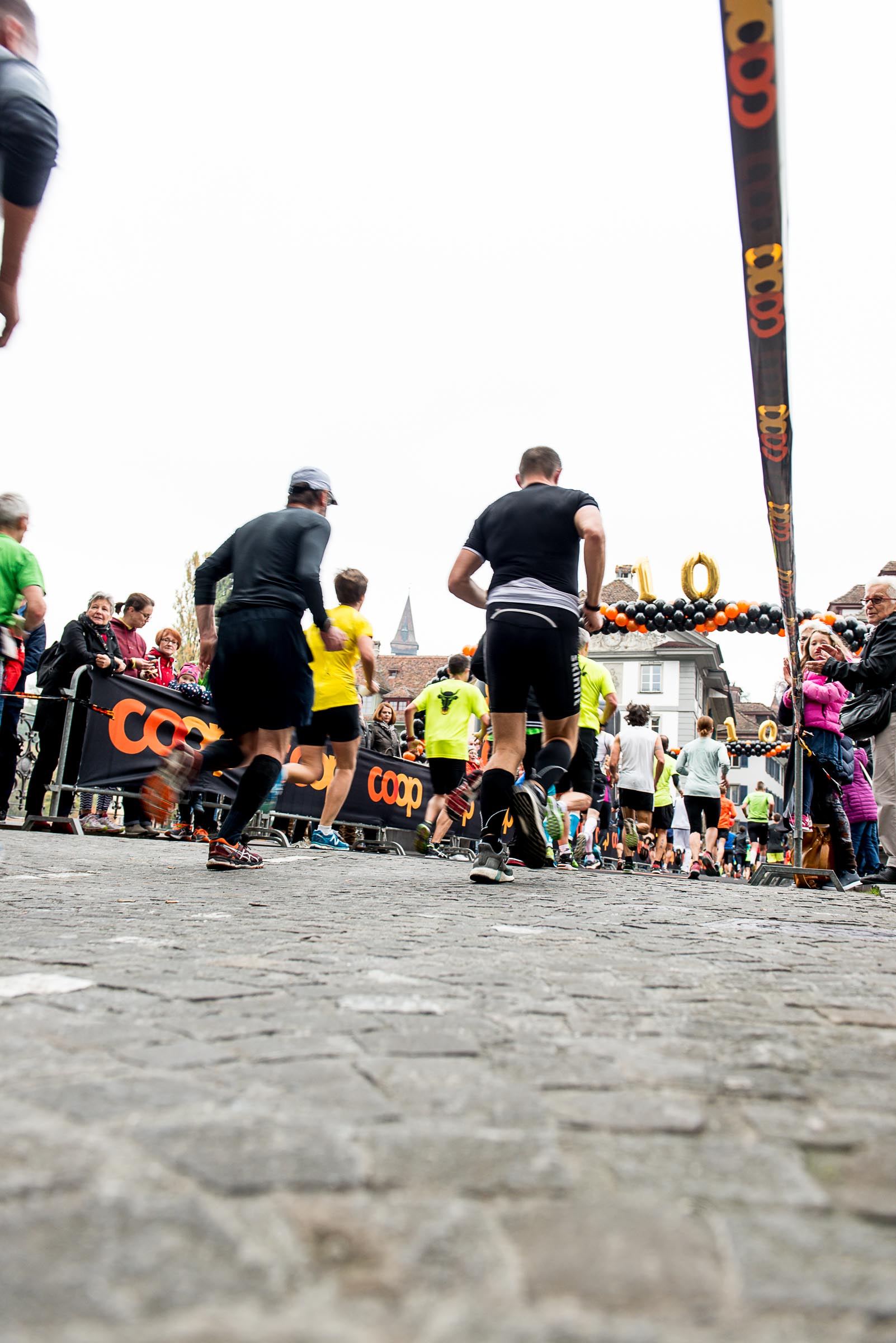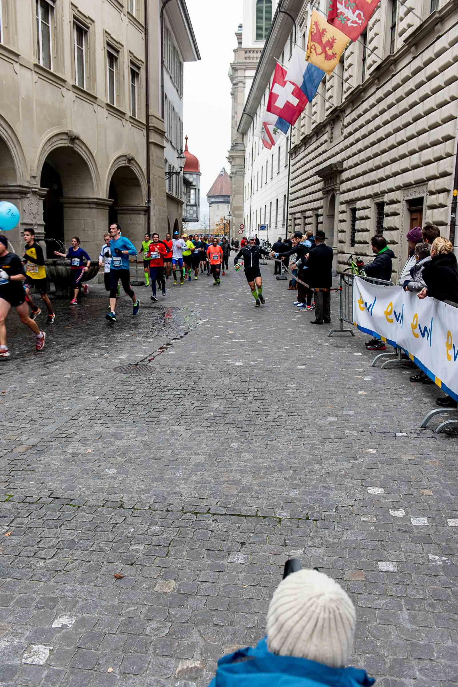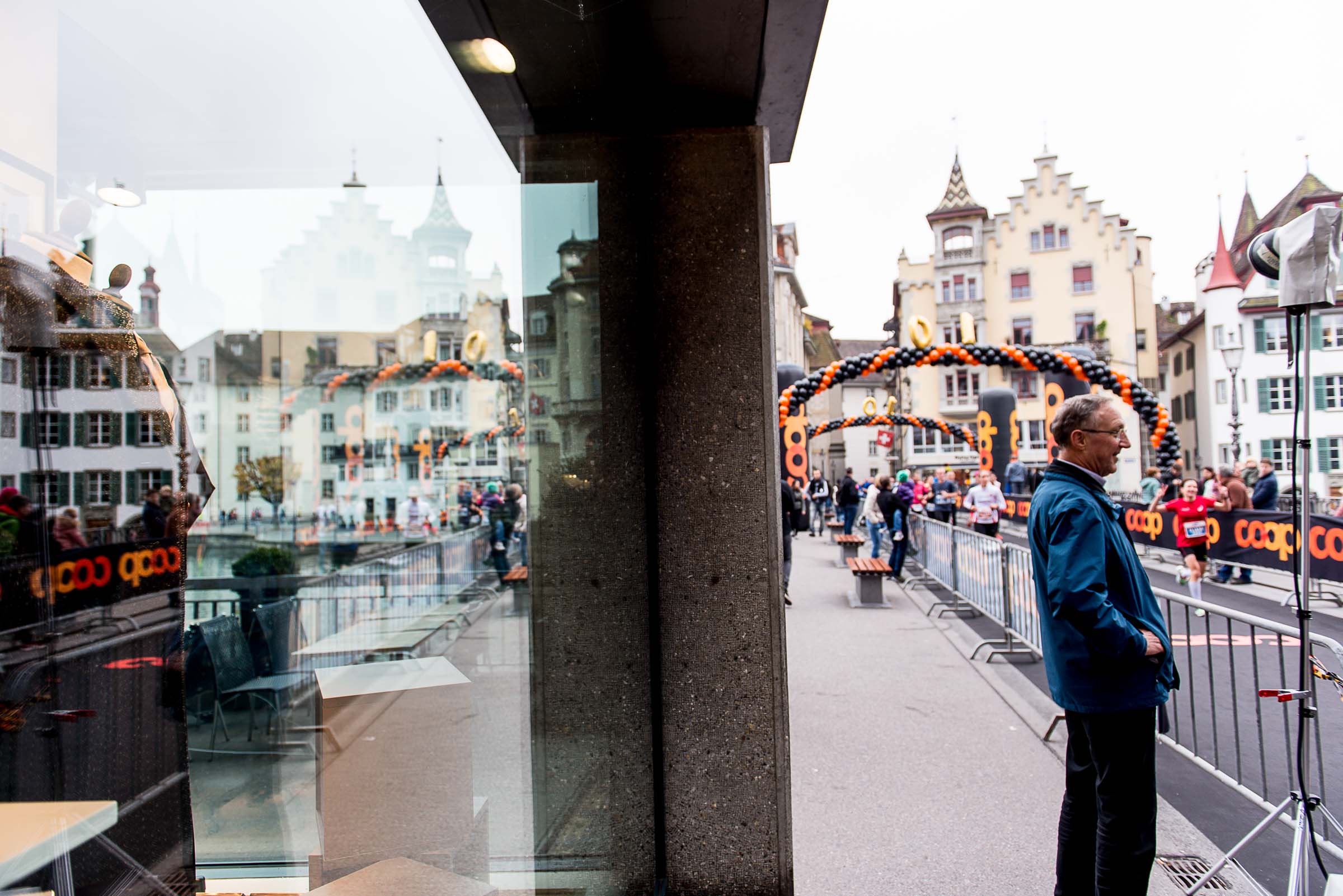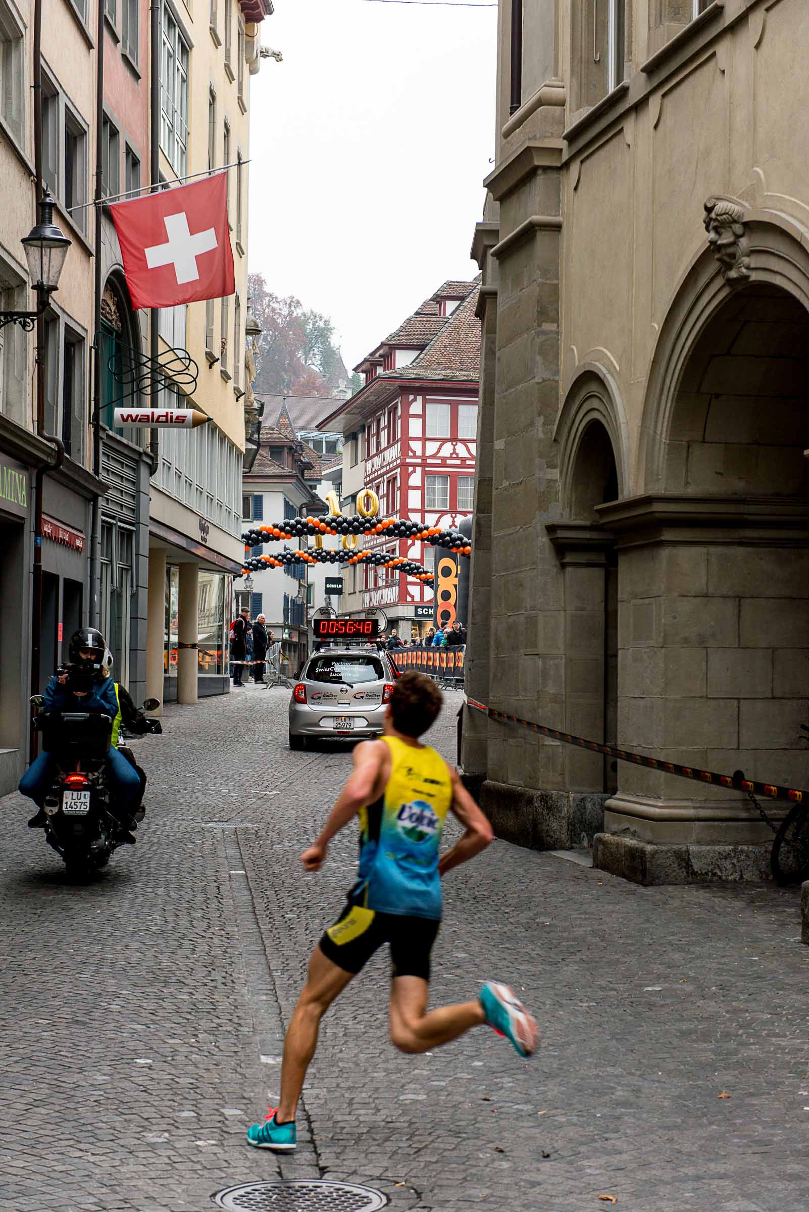 Für den Spitzenläufer ist die Sicht auf die aktuelle Zwischenzeit immer frei. Ob er die goldigen 10 Jahres Jubi Zahlen über der Reussbrücke gesehen hat oder nur seine Zeit?