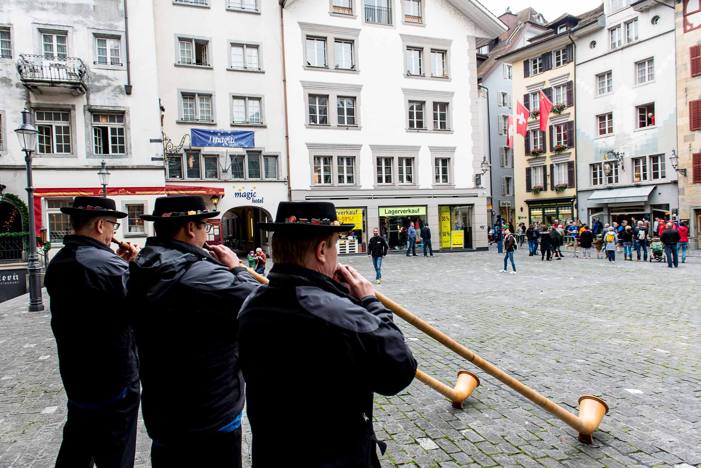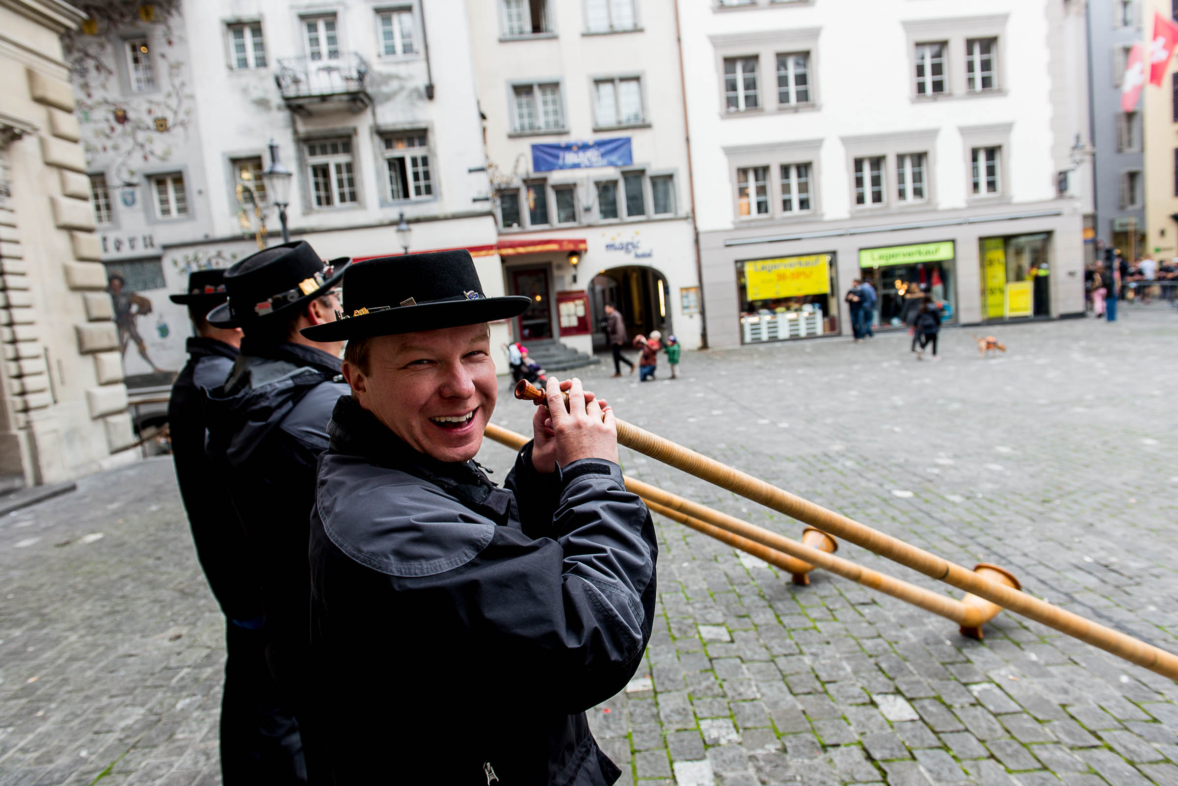 In der Altstadt Luzern ist es gemütlich. Man sitzt, schaut den Vorbeieilenden zu, hört Alphornklänge auf verschiedenen Plätzen oder wartet auf den nächsten musikalischen Einsatz.