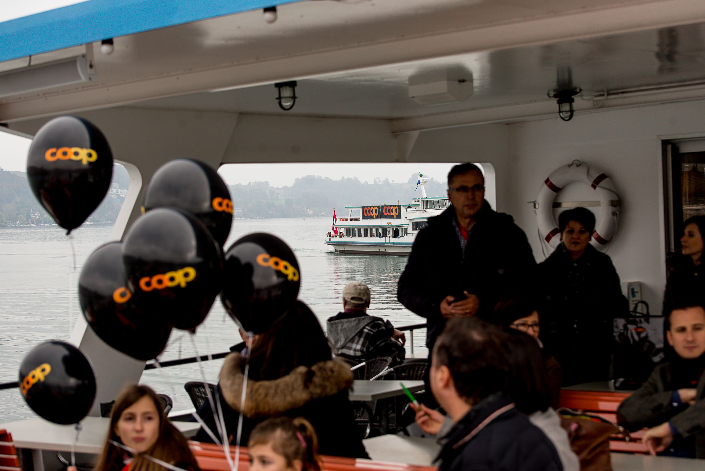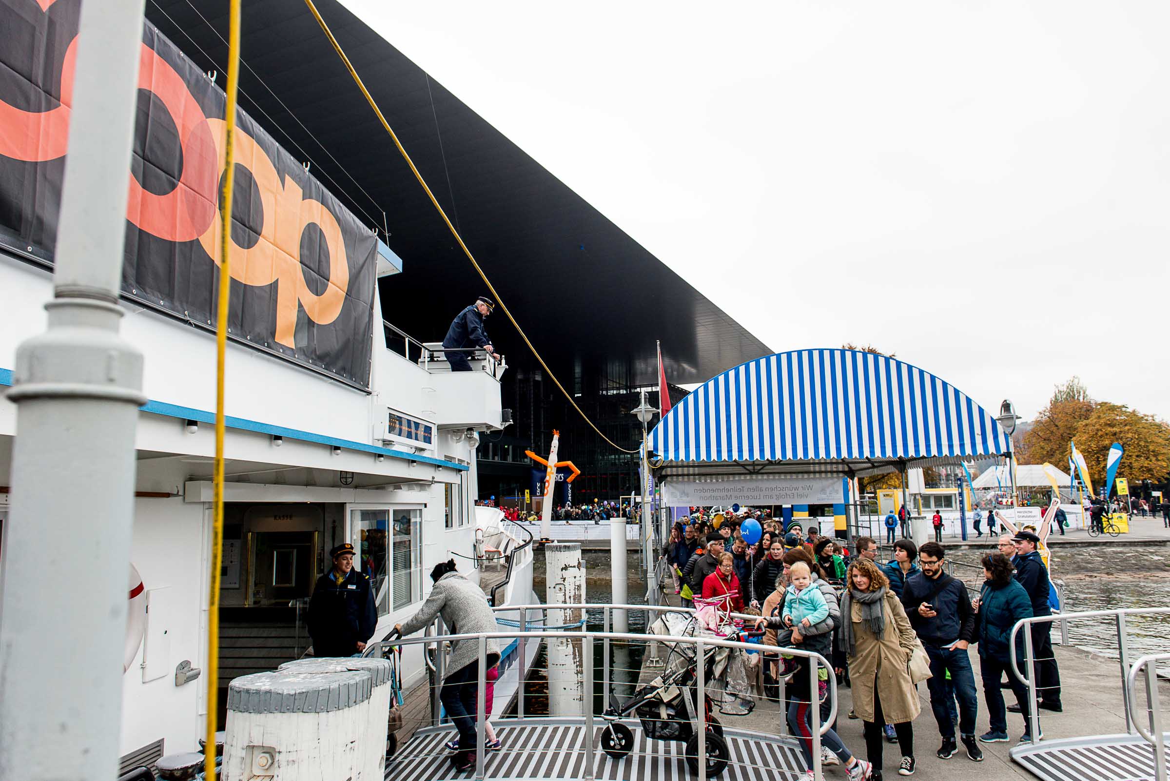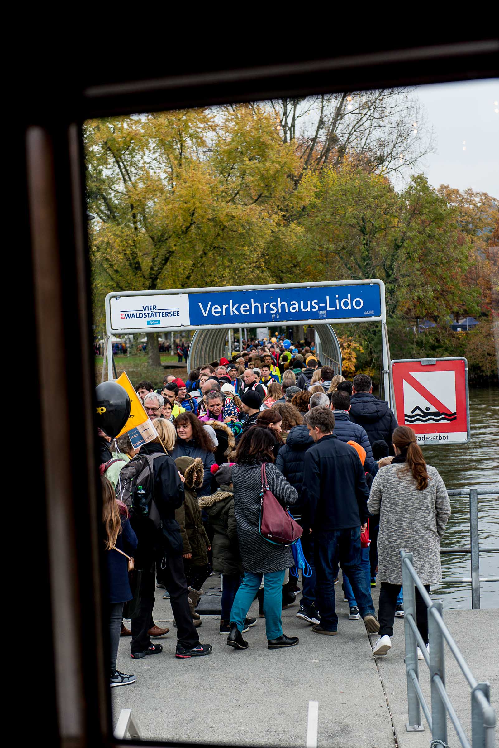 Die Leute stehen Schlange vom Verkehrshaus-Eingang bis zum SGV Steg. Alle fahren heute mit dem Schiff. Es ist SwissCityMarathon #scml16.