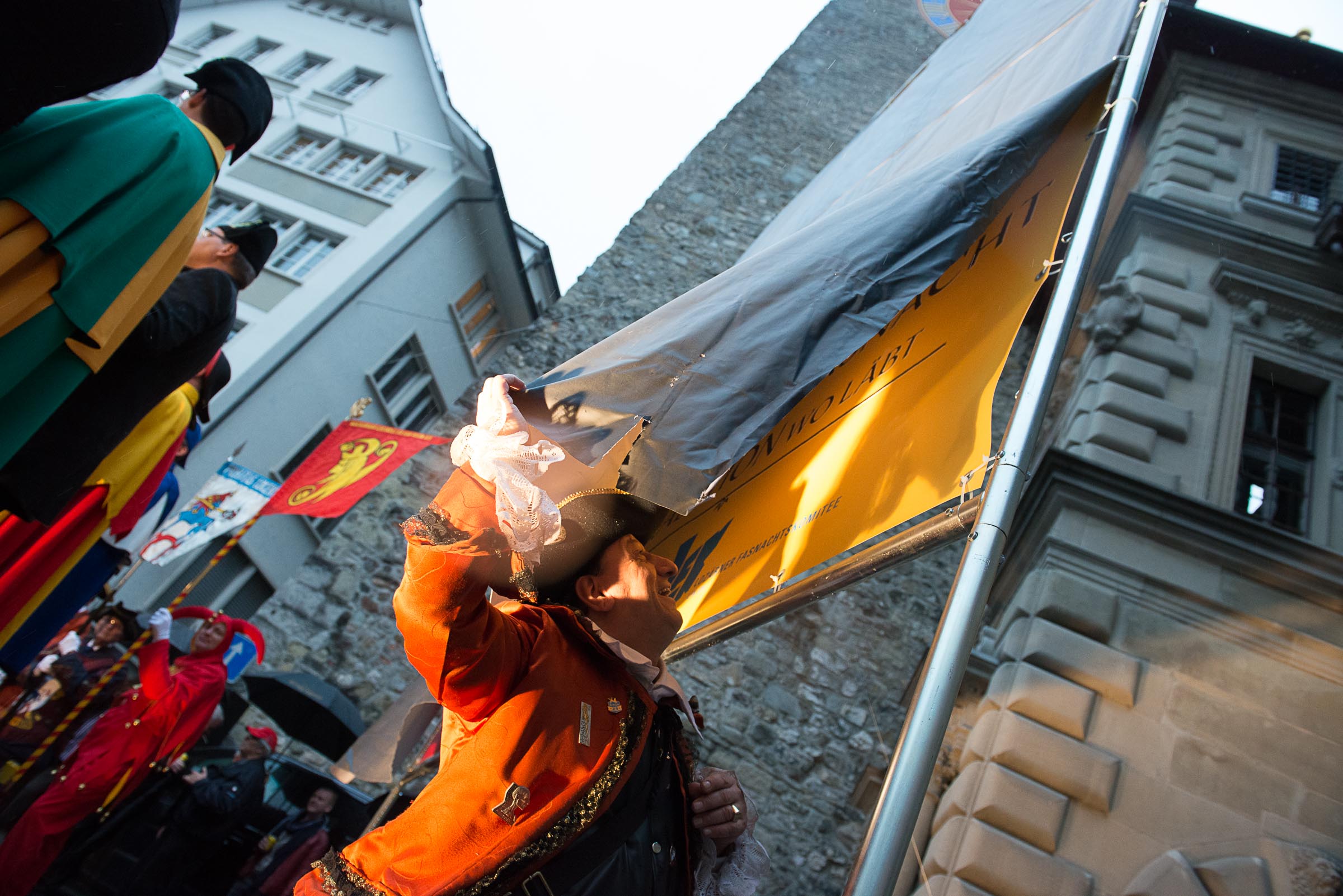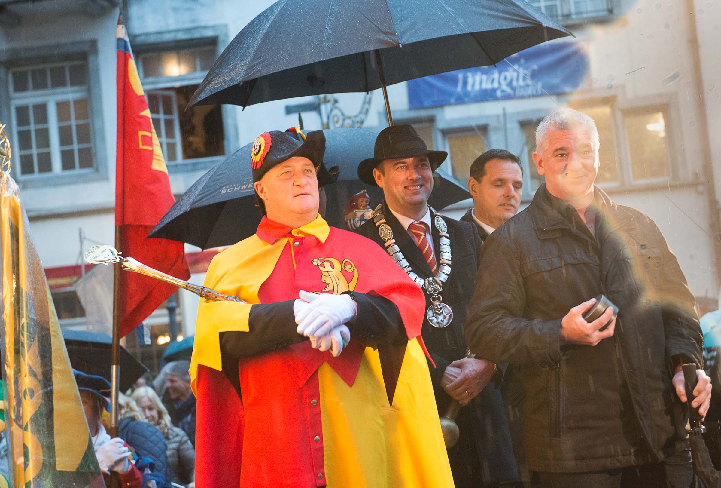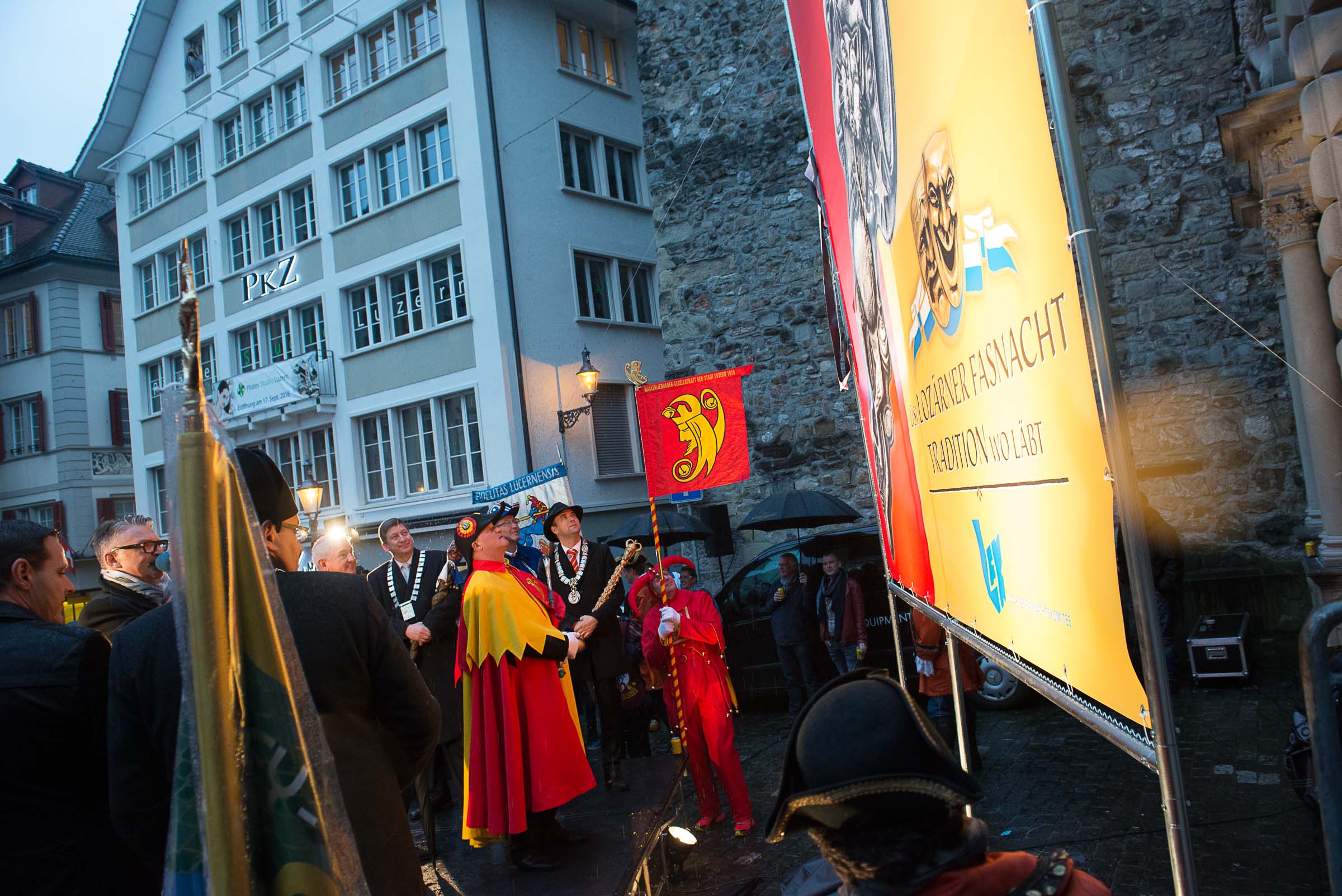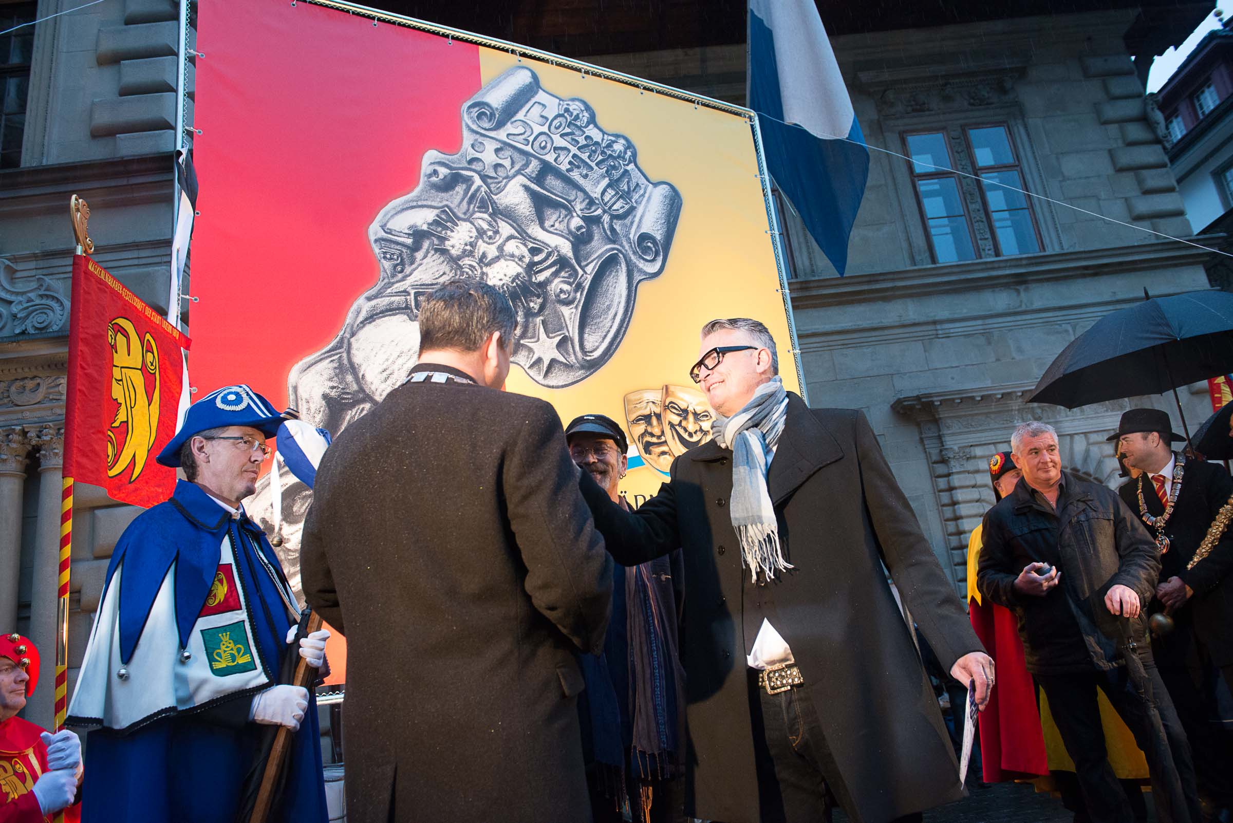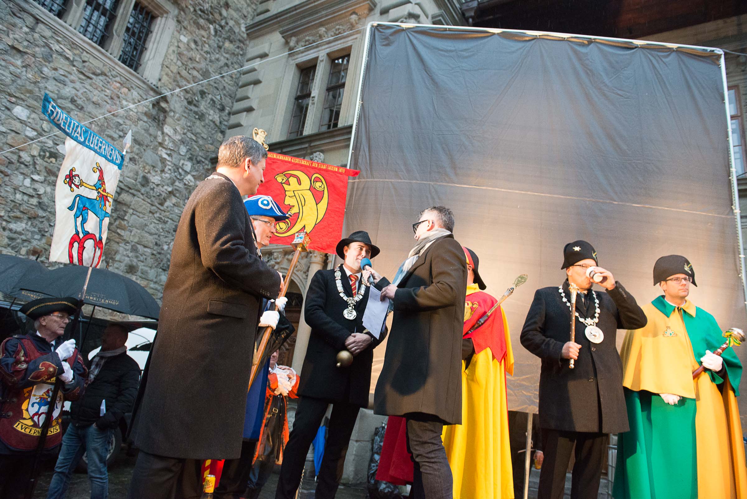 Ja, geregnet hat's an der diesjährigen Luzerner Fasnachtsplaketten Präsentation. Speziell die Enthüllung auf dem Kornmarkt war Schwerarbeit.