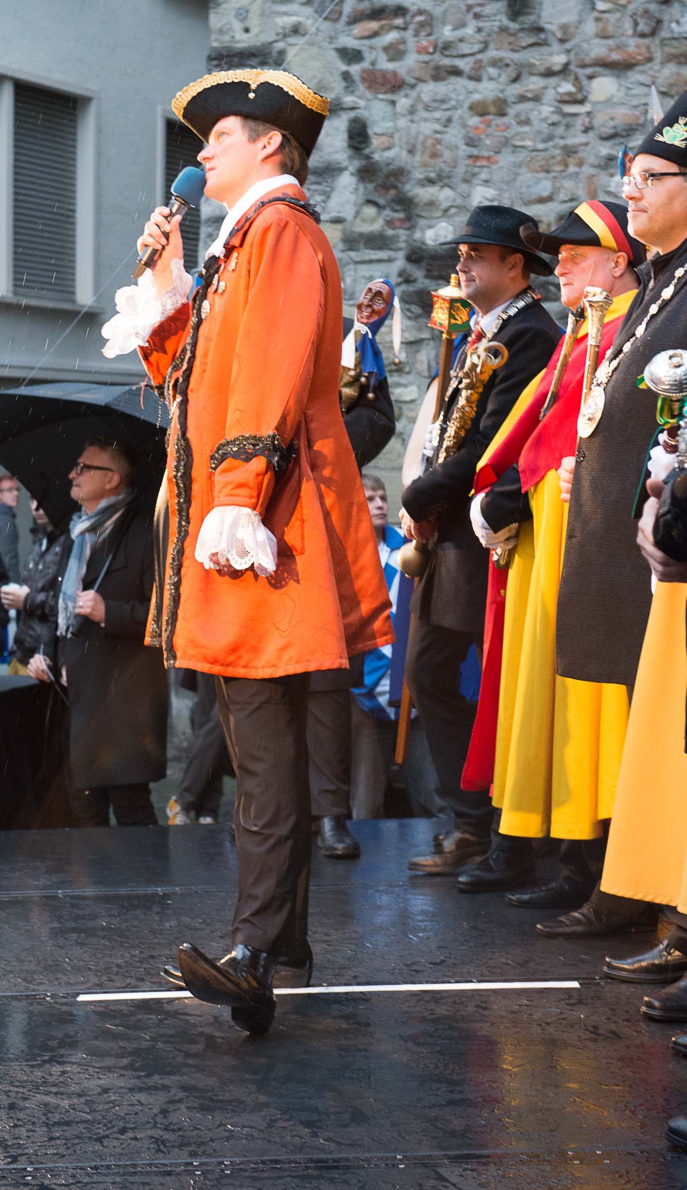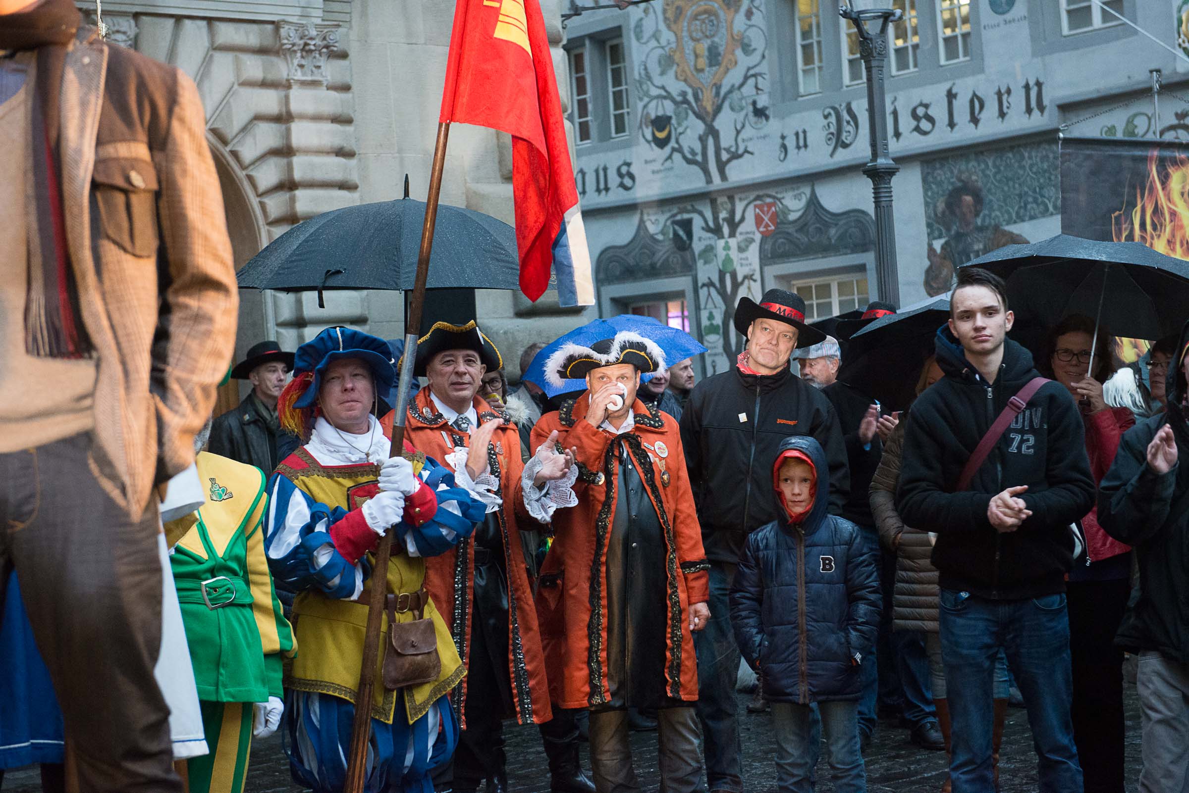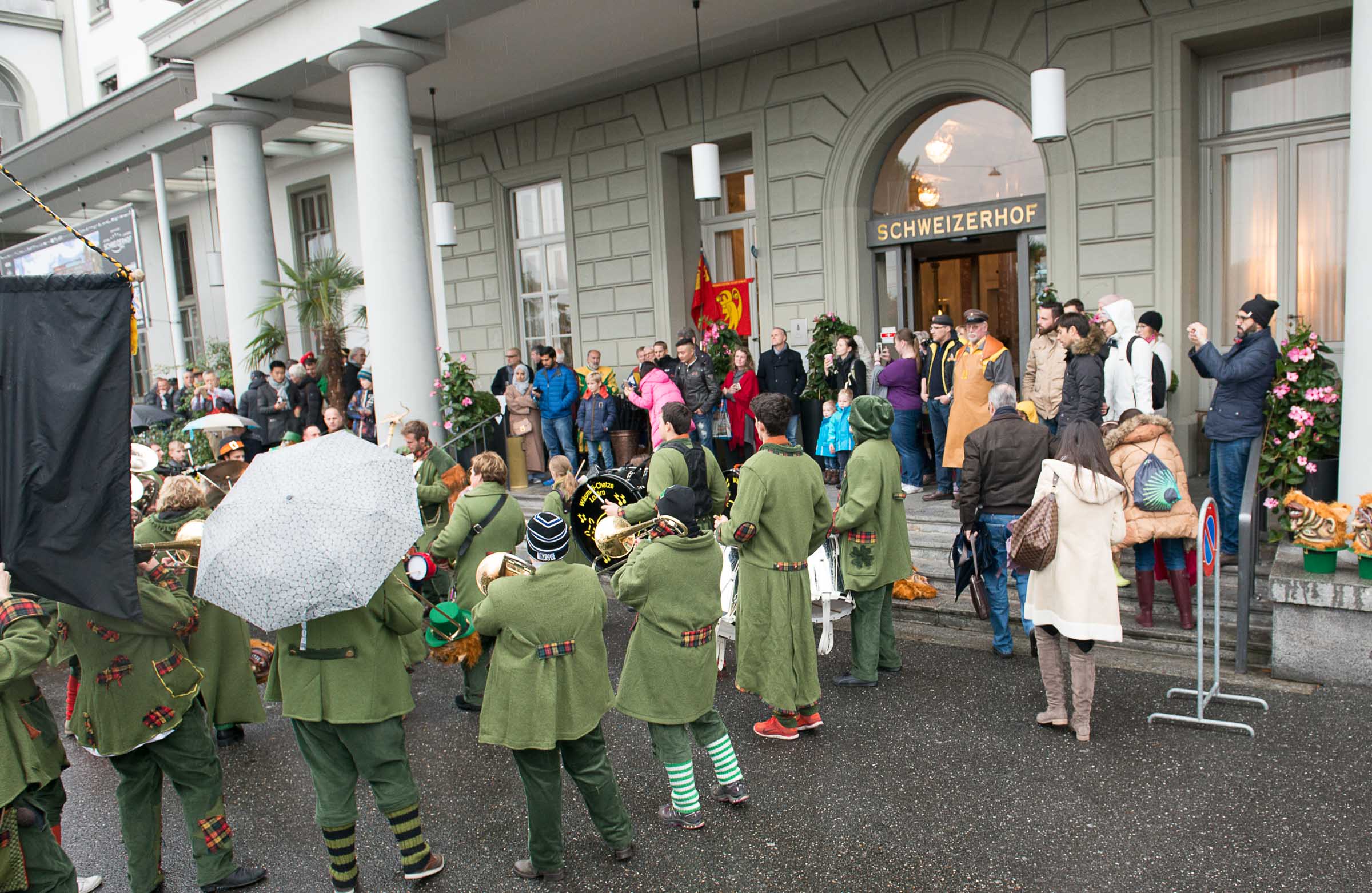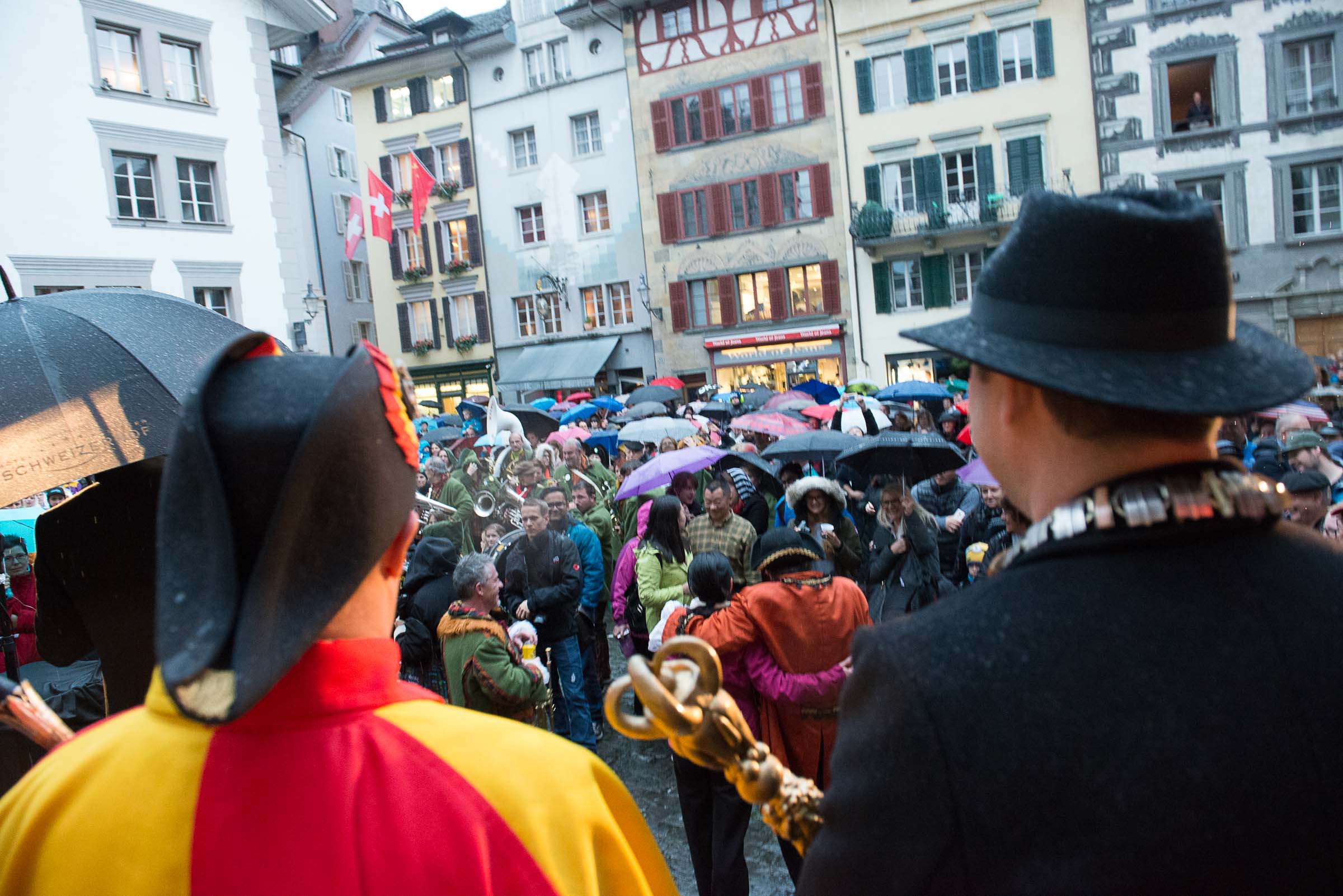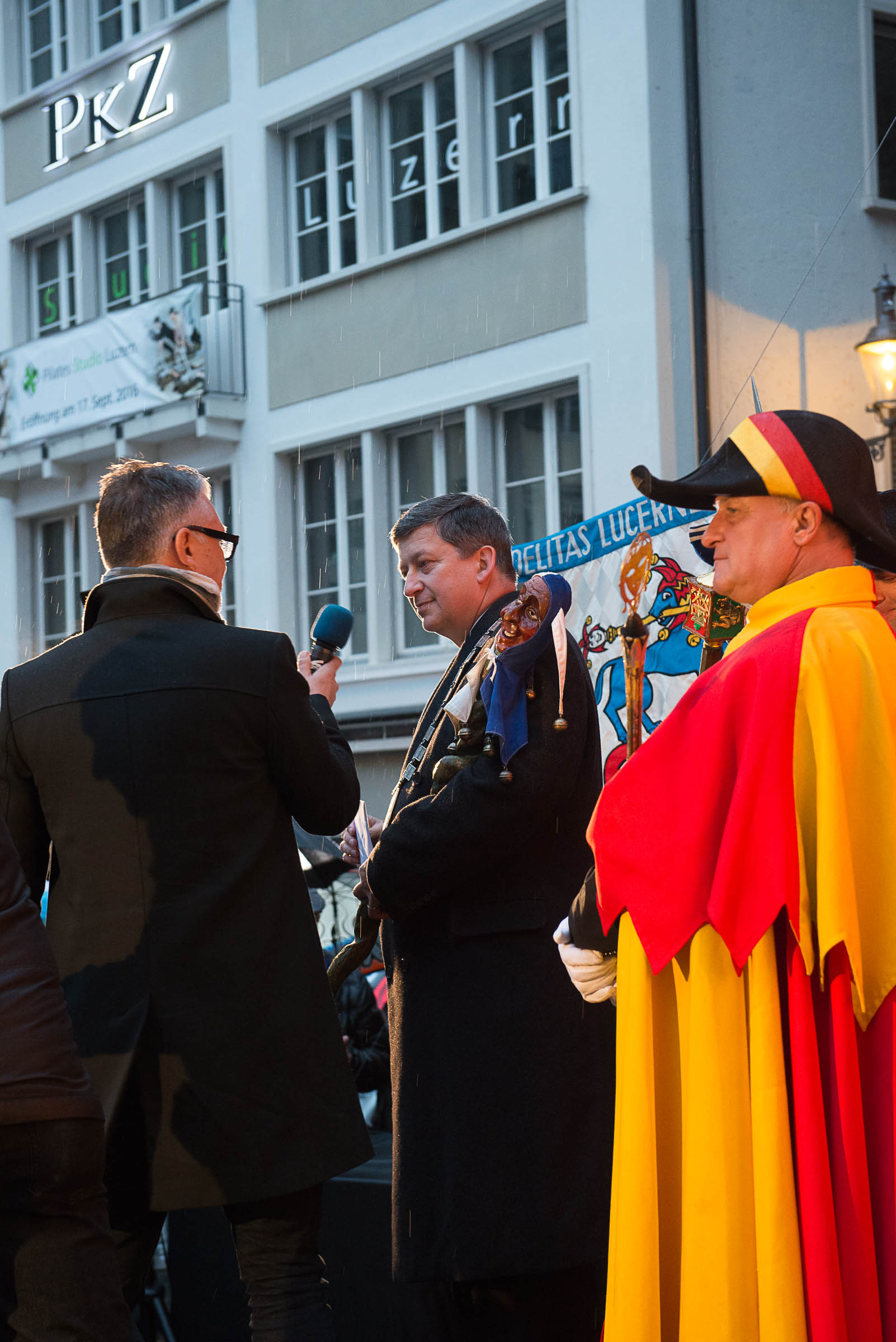 Ja, geregnet hat's an der diesjährigen Luzerner Fasnachtsplaketten Präsentation. Speziell die Enthüllung auf dem Kornmarkt war Schwerarbeit.
