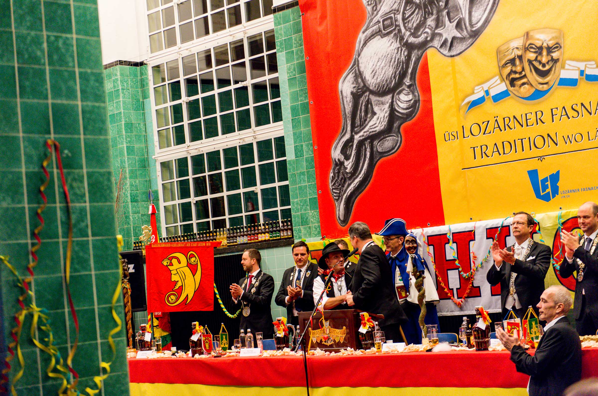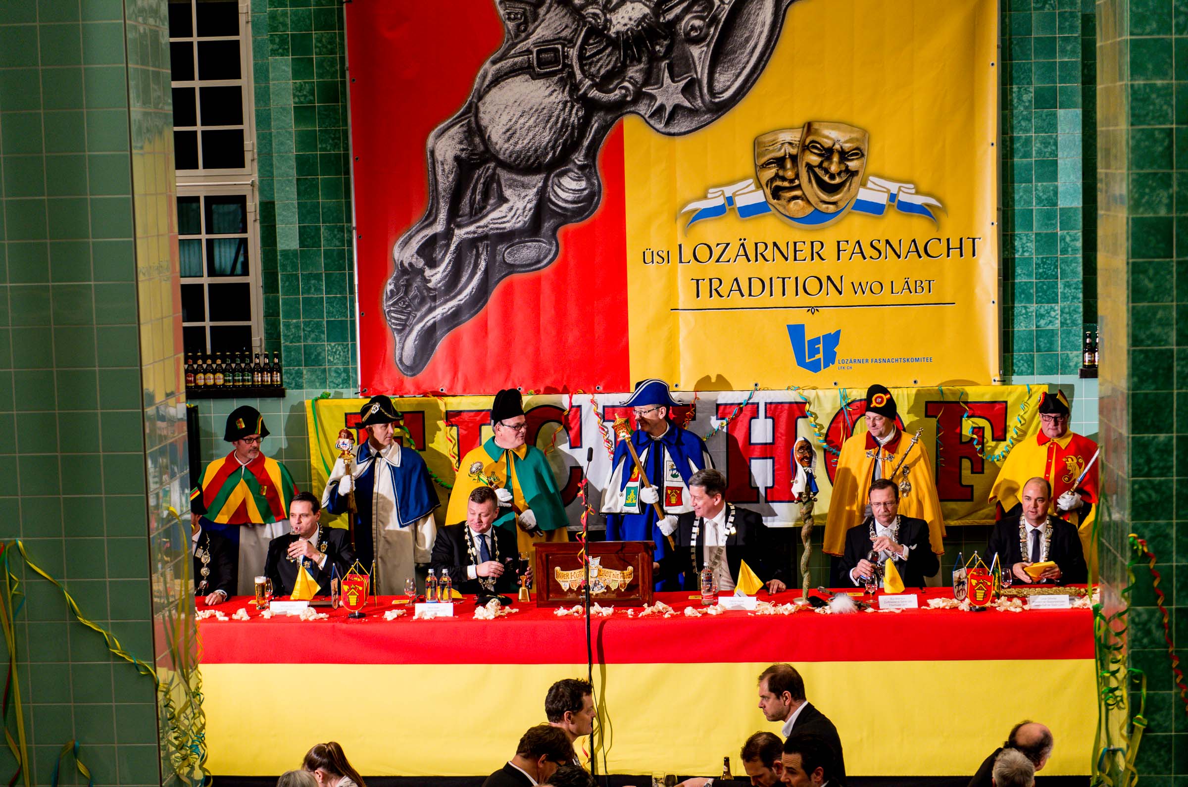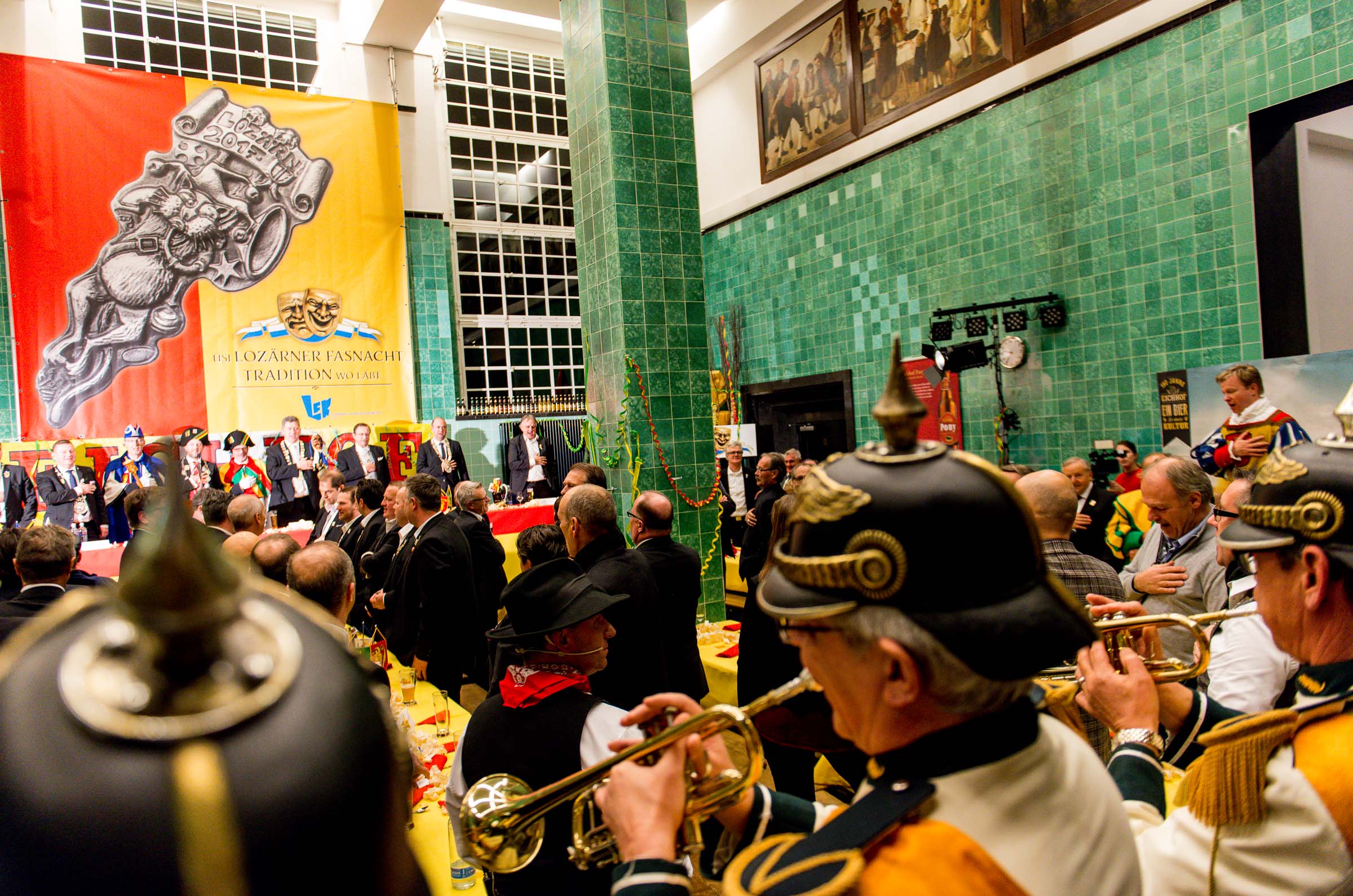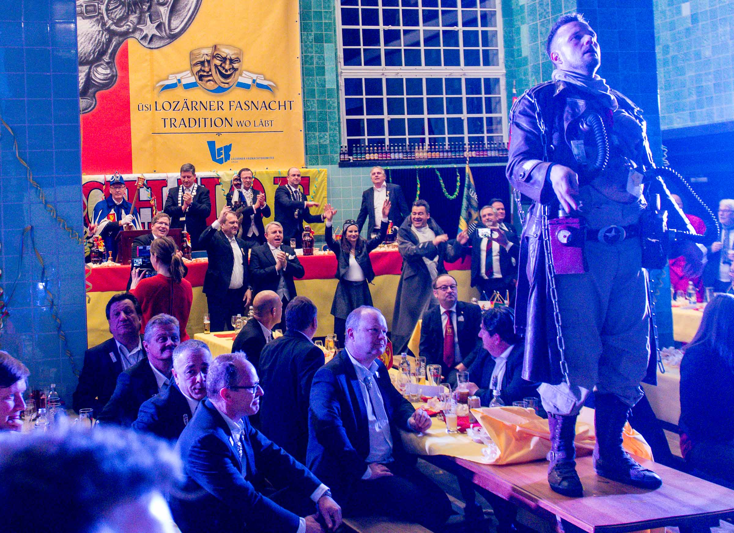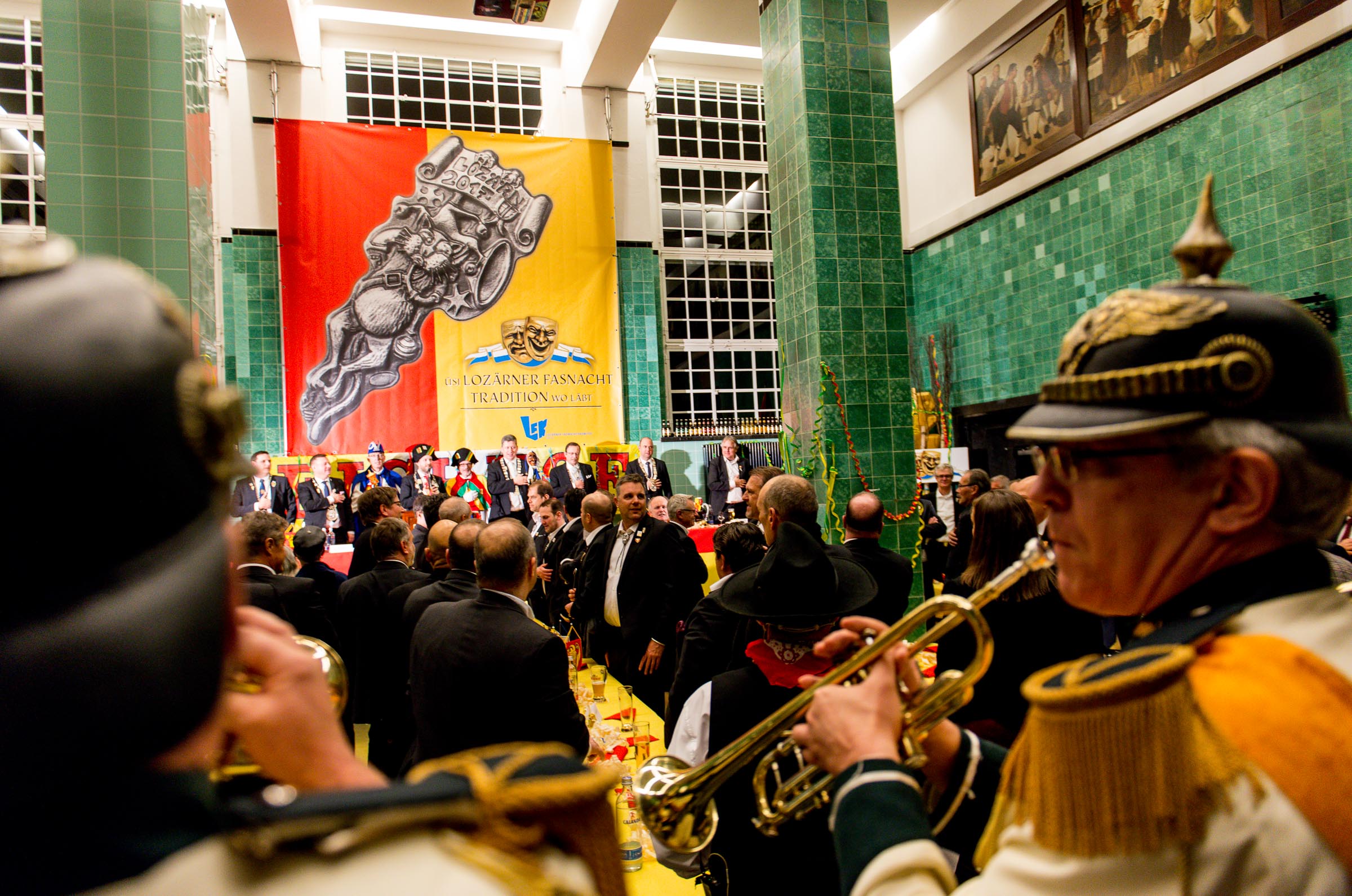 Vor dem grossen Einmarsch werden alle Details geprüft. Der Weibel hilft natürlich. Die Gäste sitzen, noch fehlen die Fasnachtsgewaltigen. Einmarsch mit Weibel und Bannerherr und Musik. Falls kein Fähndrich da ist, dann schreitet der Chef (LFK-Präsideten) gleich mit vier Bannerträgern in den Schalander ein. Man gönnt sich etwas.