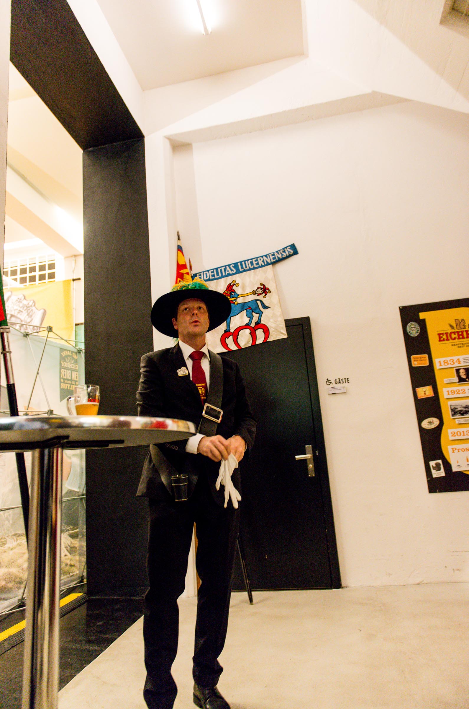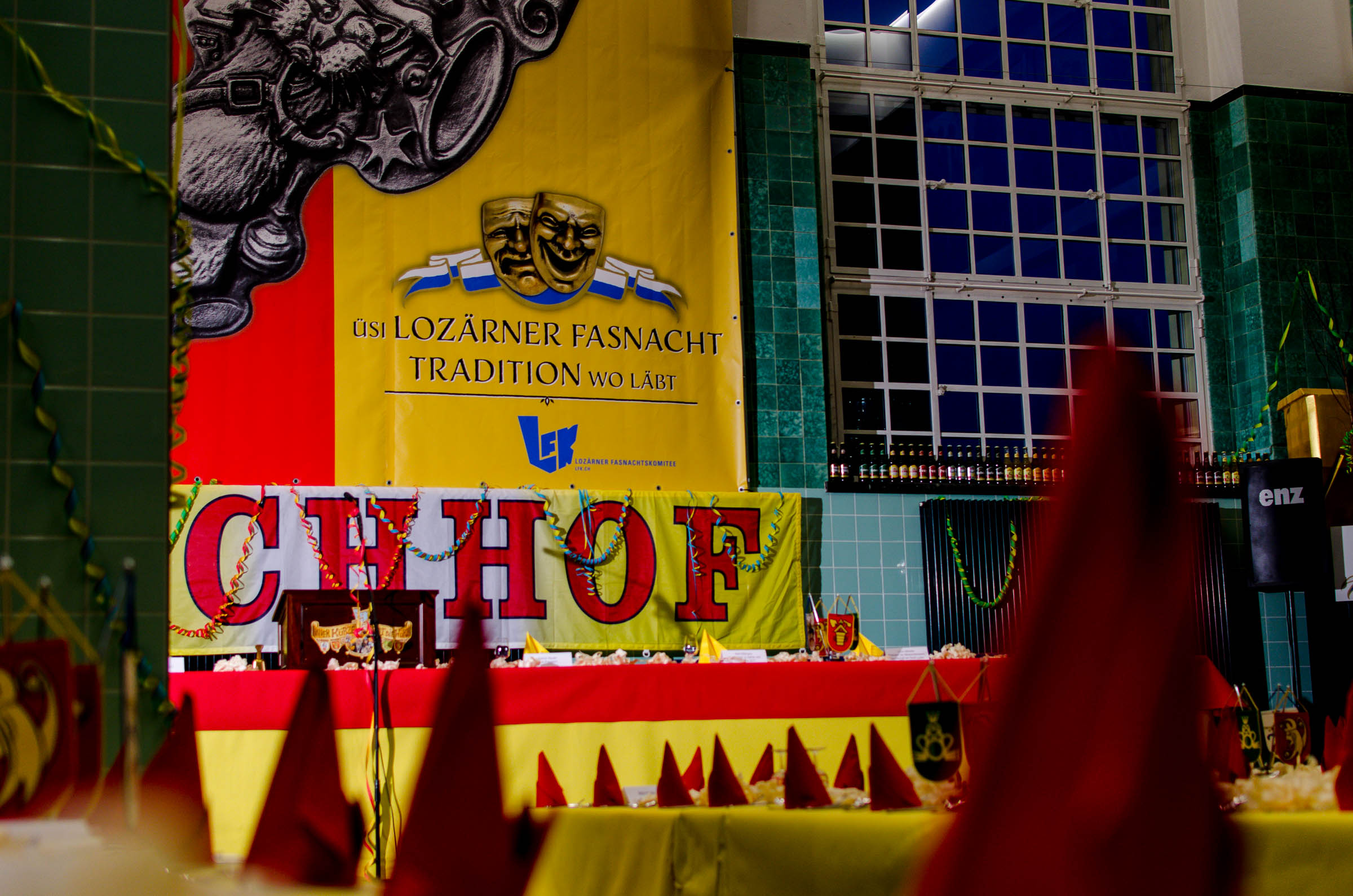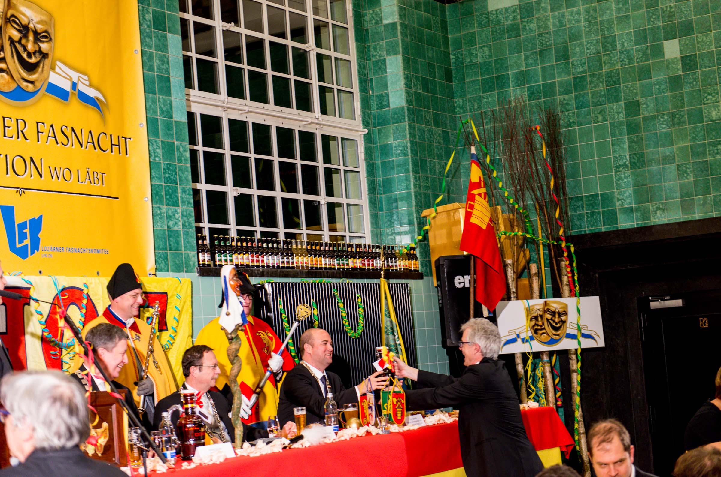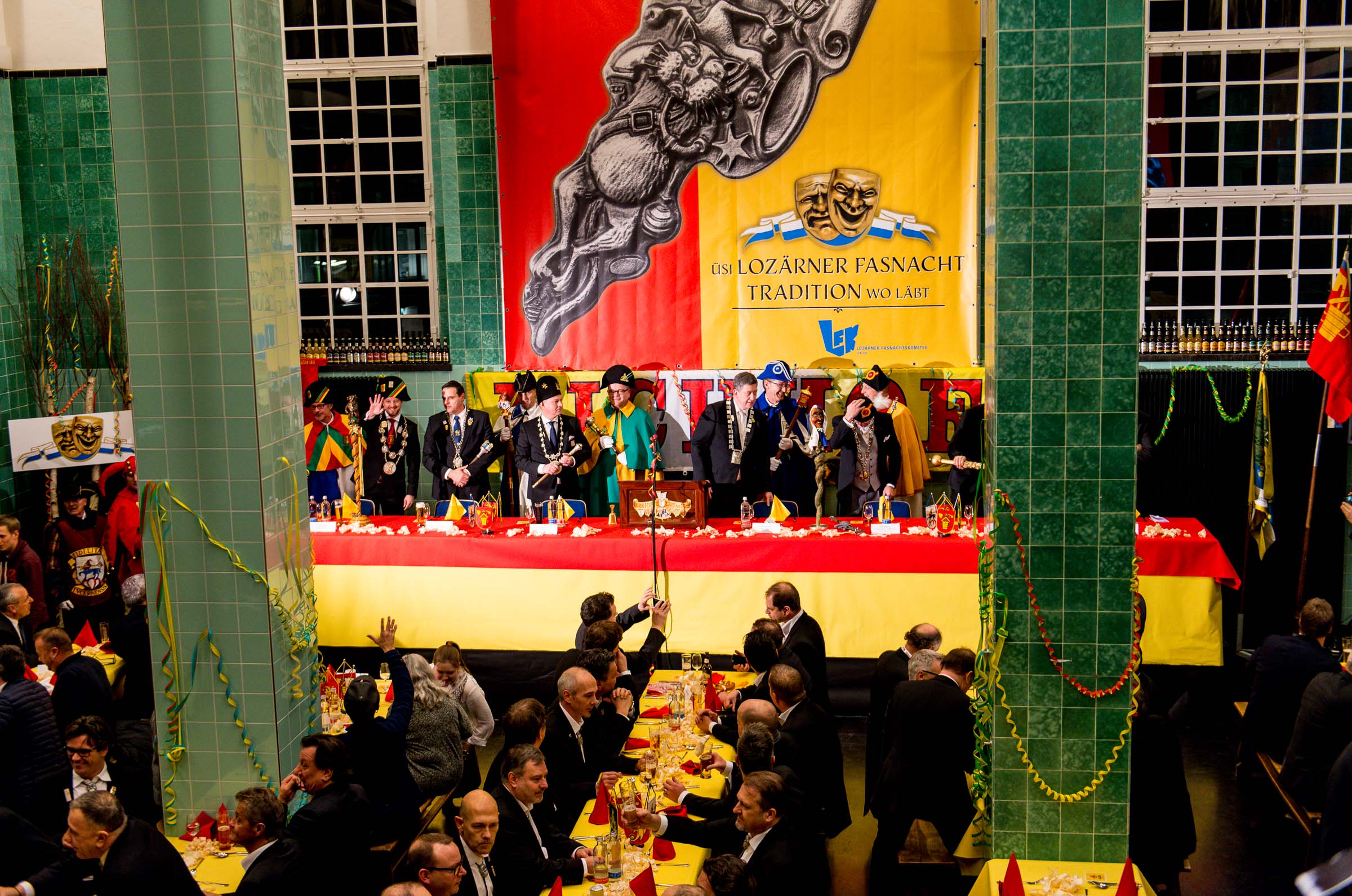 Vor dem grossen Einmarsch werden alle Details geprüft. Der Weibel hilft natürlich. Die Gäste sitzen, noch fehlen die Fasnachtsgewaltigen. Einmarsch mit Weibel und Bannerherr und Musik. Falls kein Fähndrich da ist, dann schreitet der Chef (LFK-Präsideten) gleich mit vier Bannerträgern in den Schalander ein. Man gönnt sich etwas.