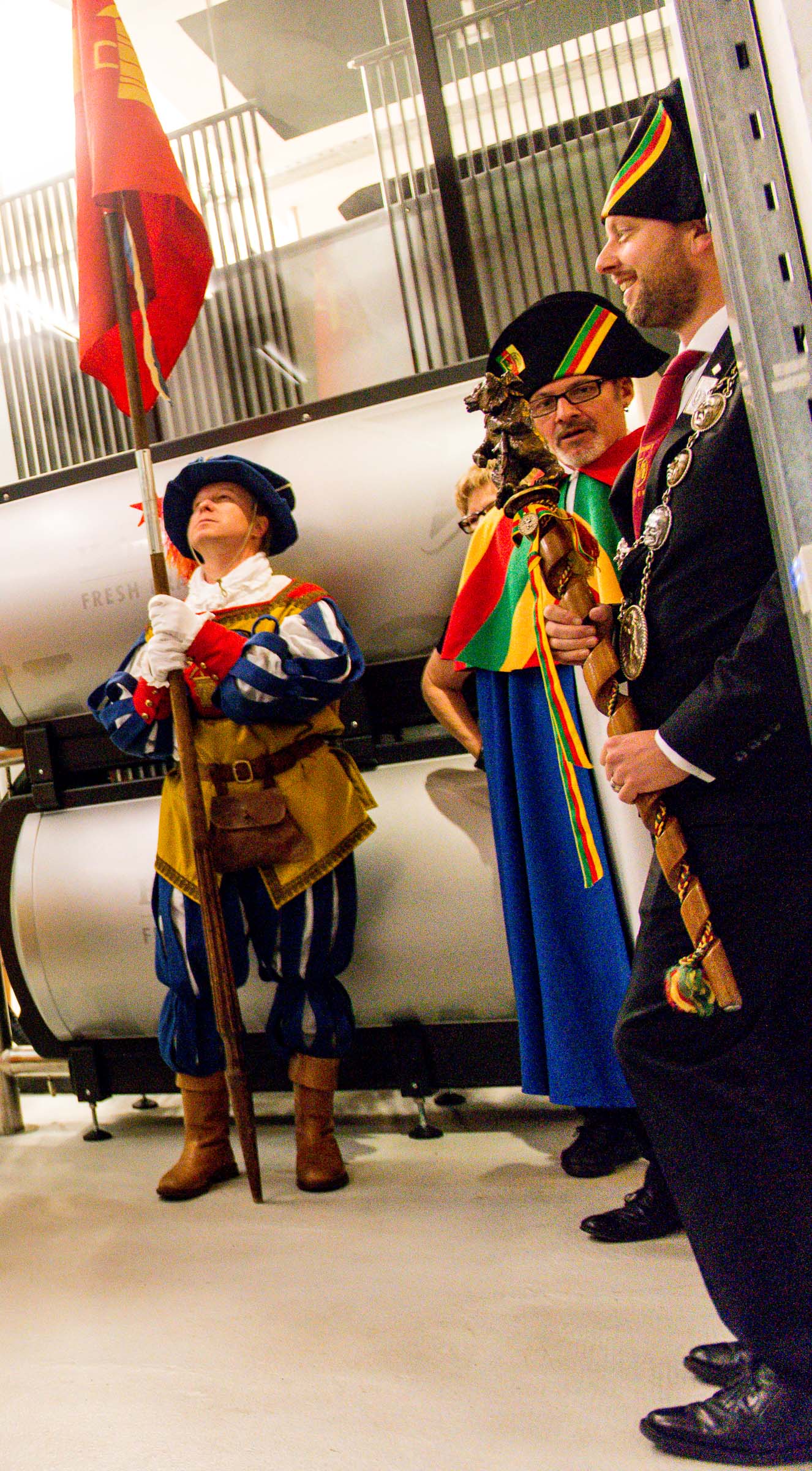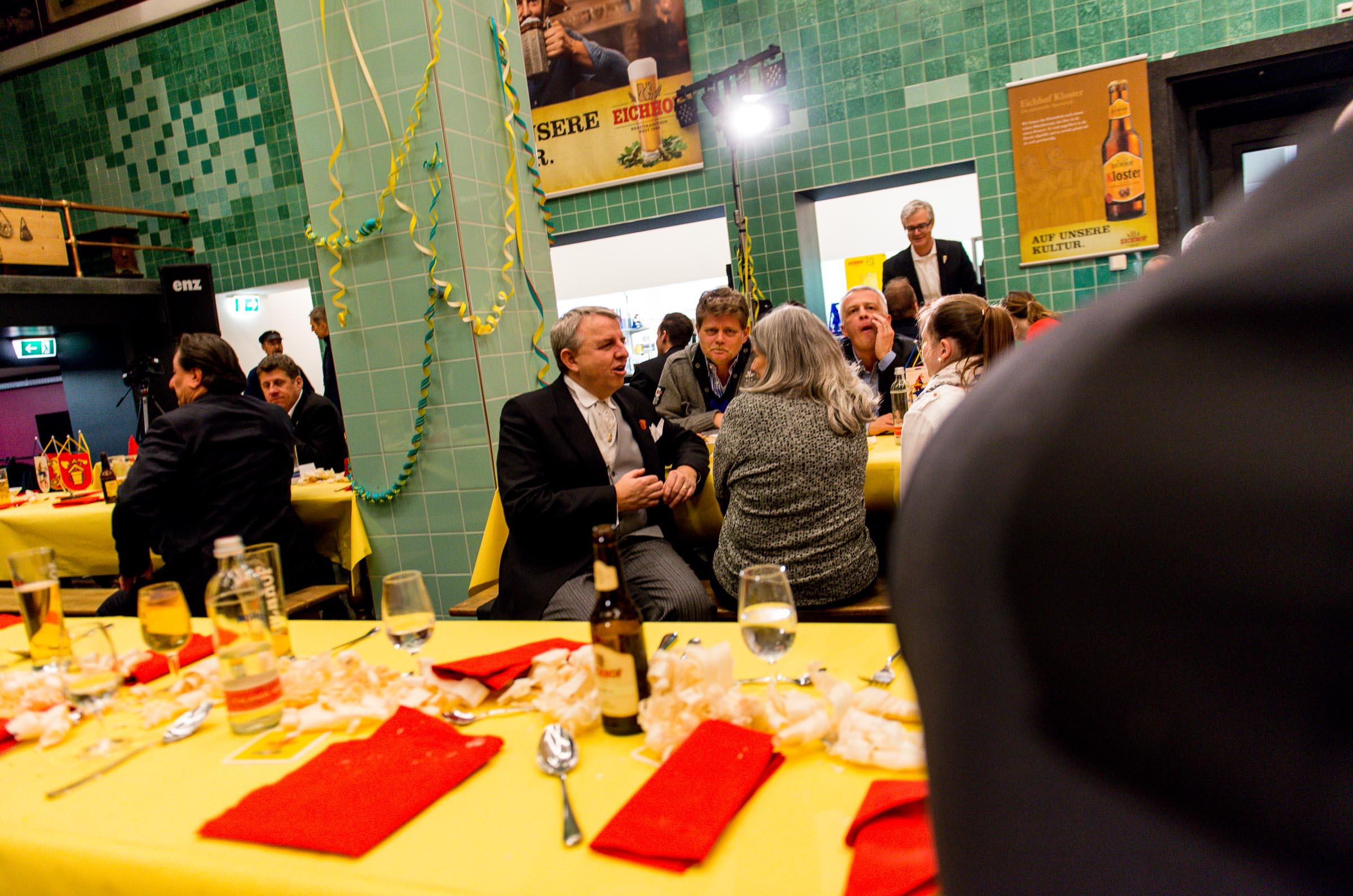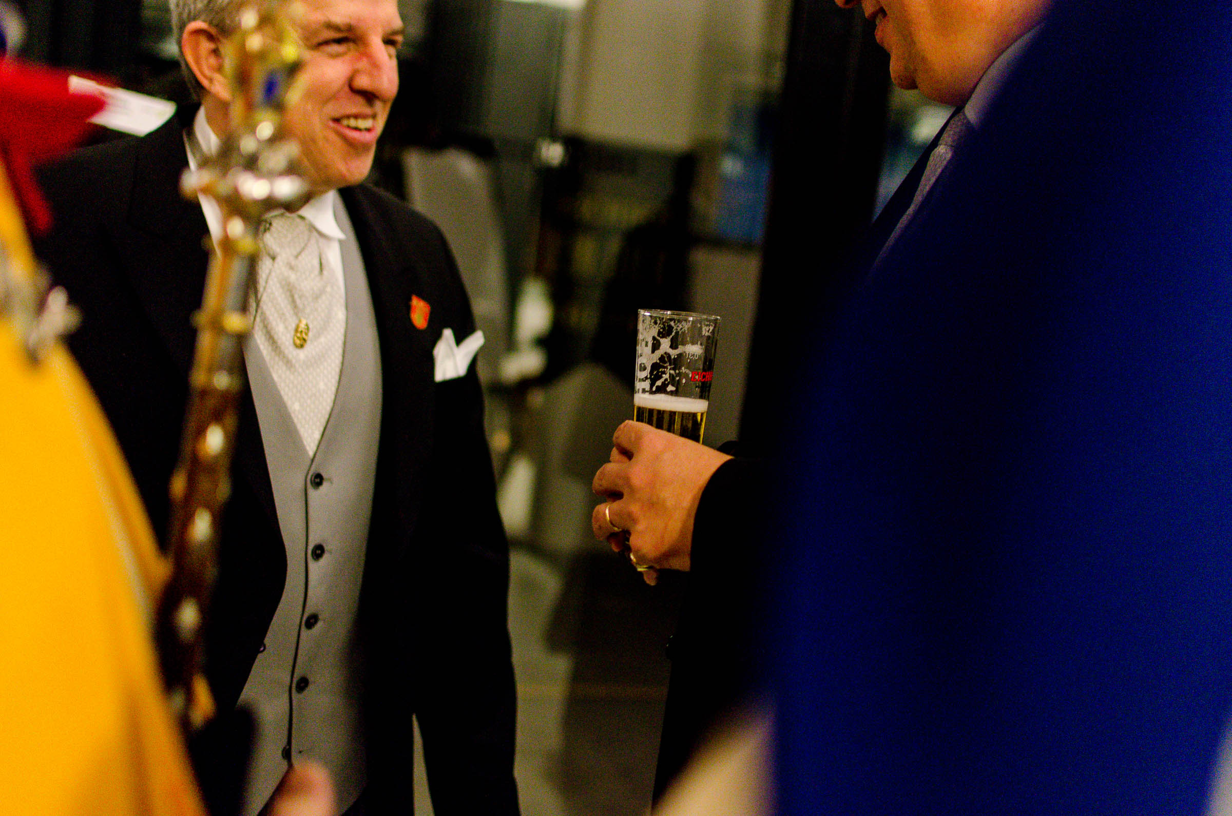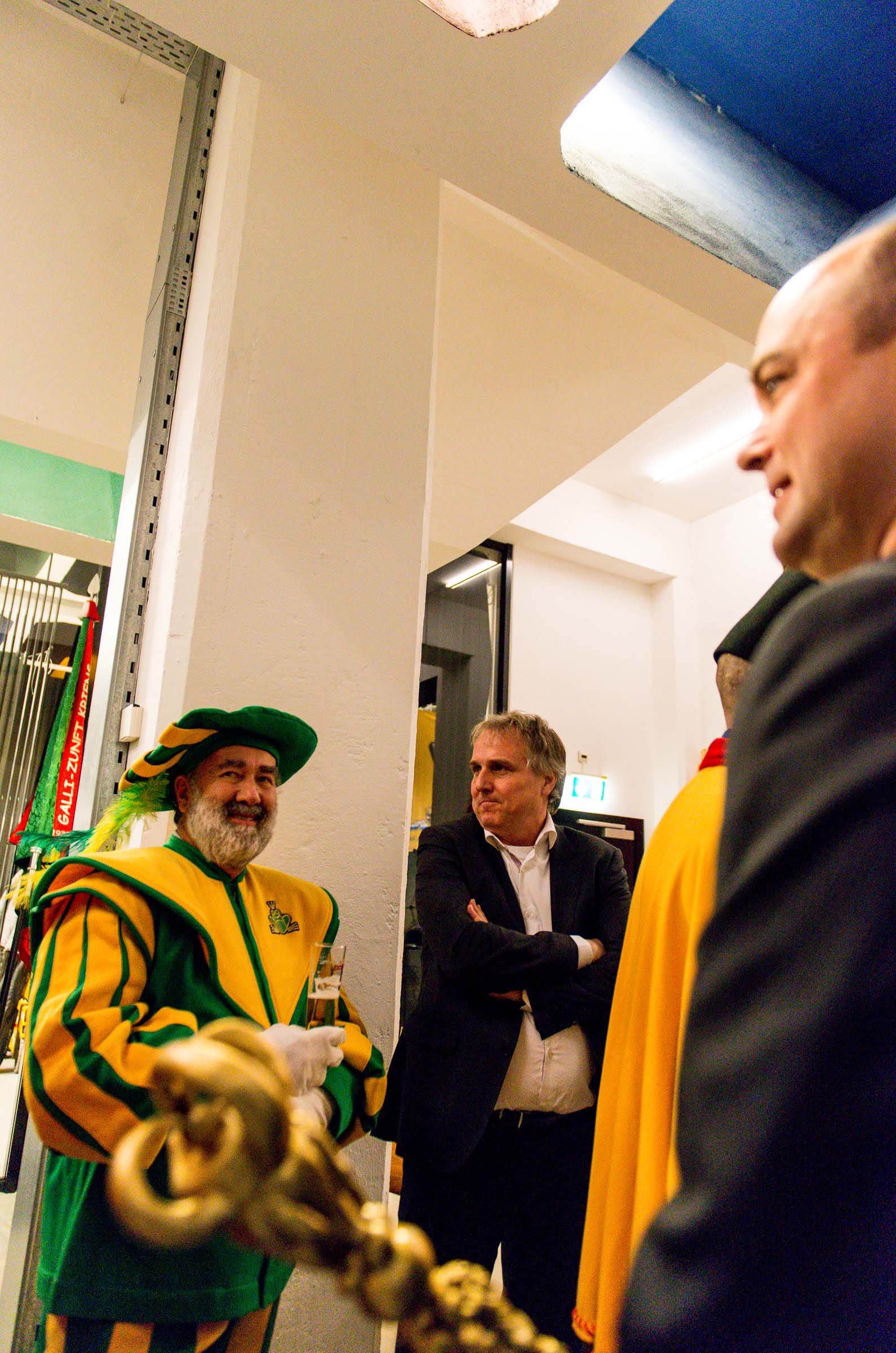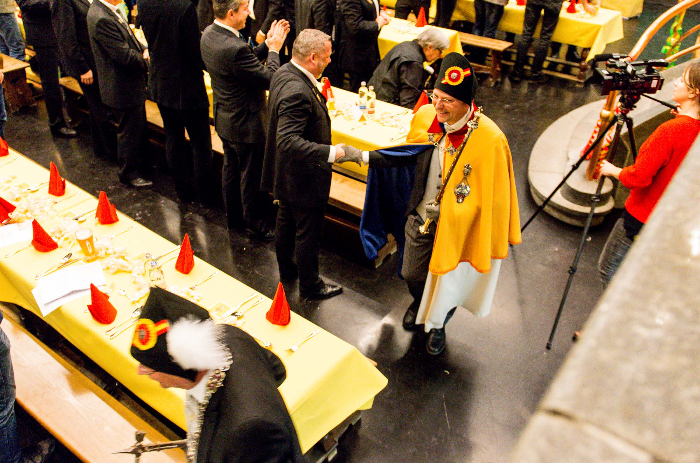 Vor dem grossen Einmarsch werden alle Details geprüft. Der Weibel hilft natürlich. Die Gäste sitzen, noch fehlen die Fasnachtsgewaltigen. Einmarsch mit Weibel und Bannerherr und Musik. Falls kein Fähndrich da ist, dann schreitet der Chef (LFK-Präsideten) gleich mit vier Bannerträgern in den Schalander ein. Man gönnt sich etwas.