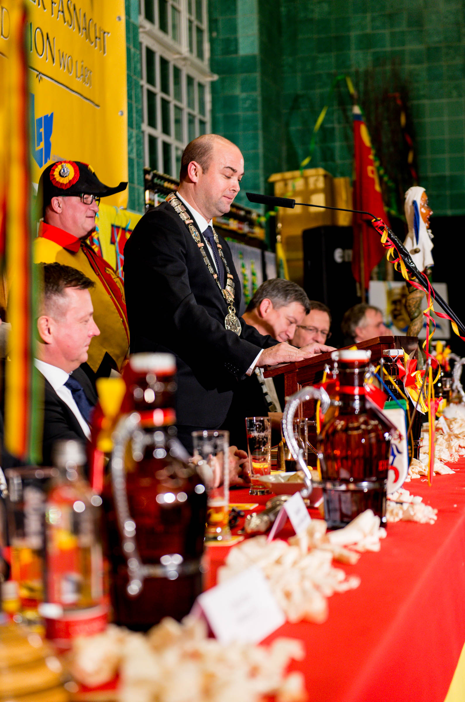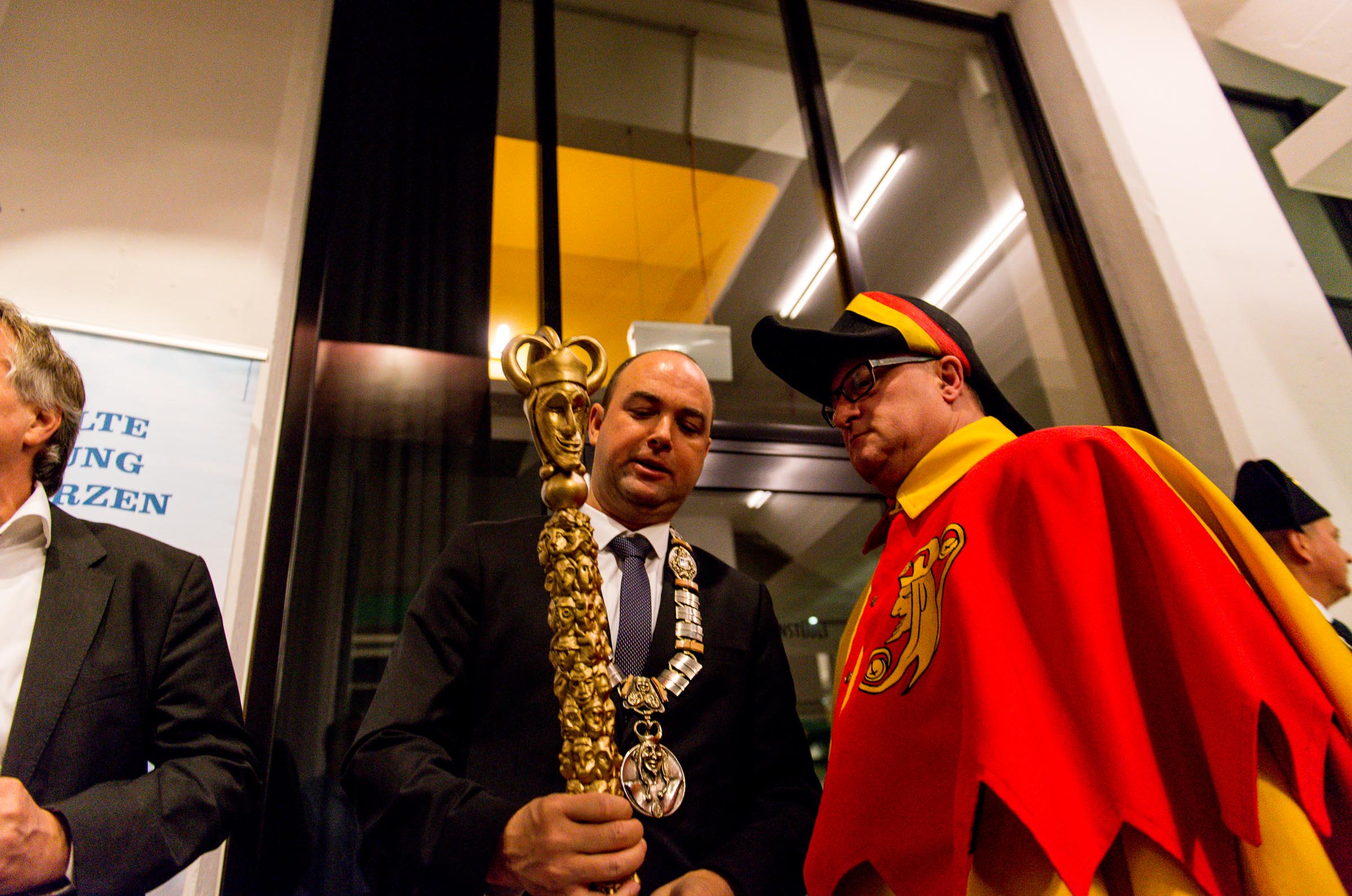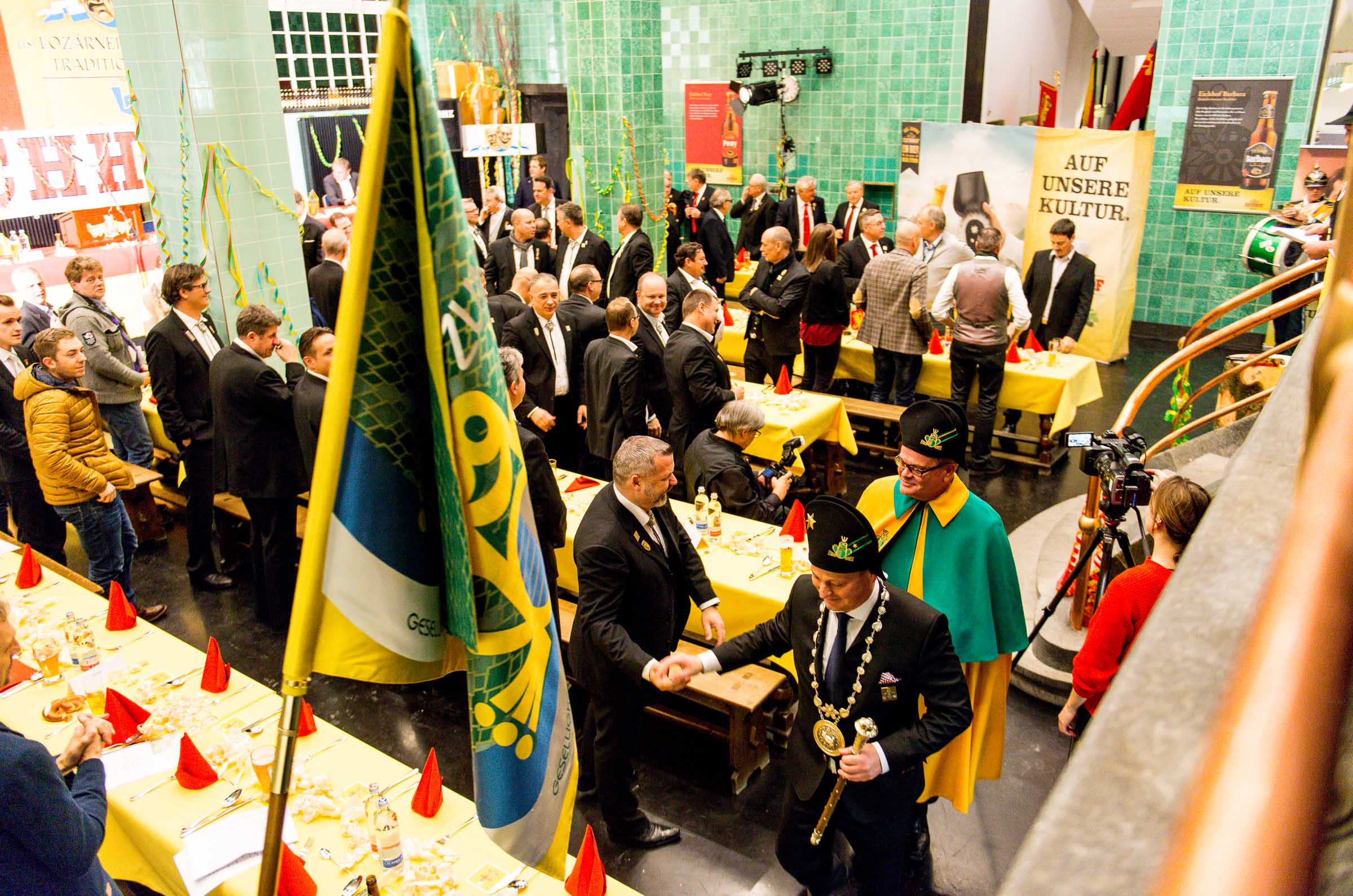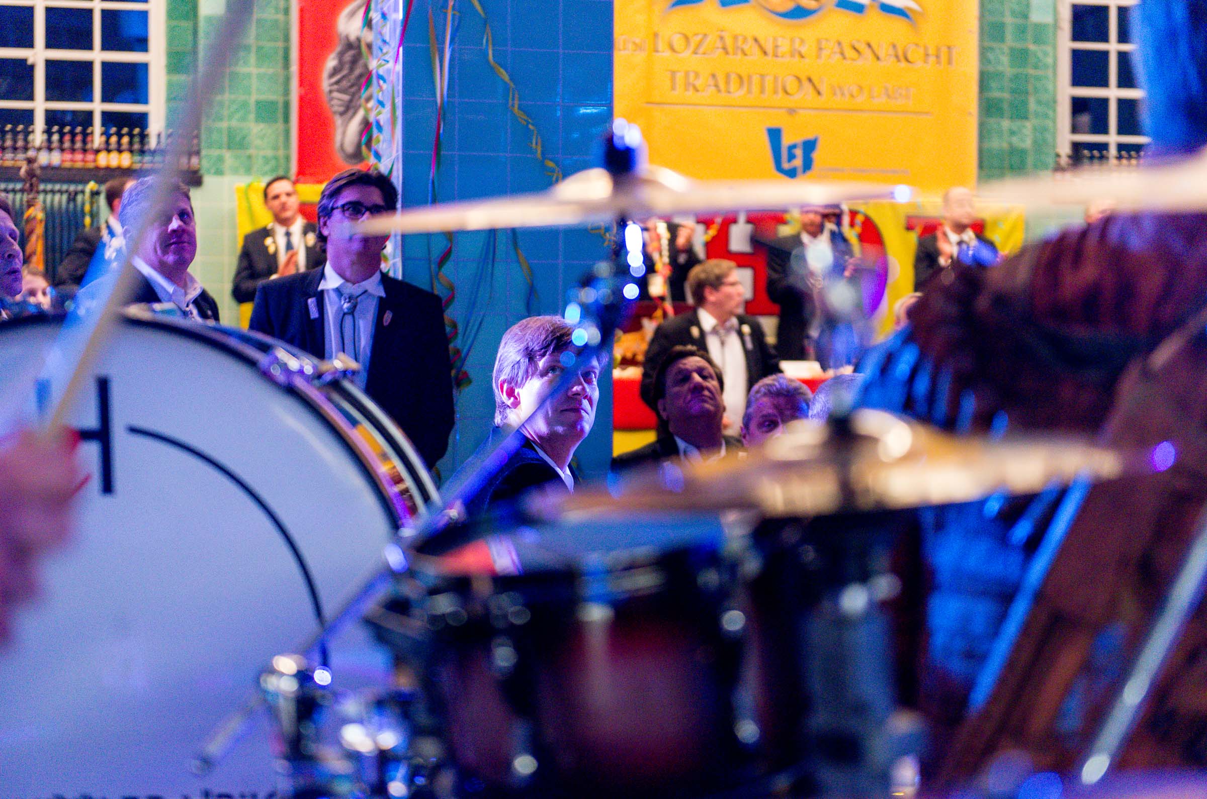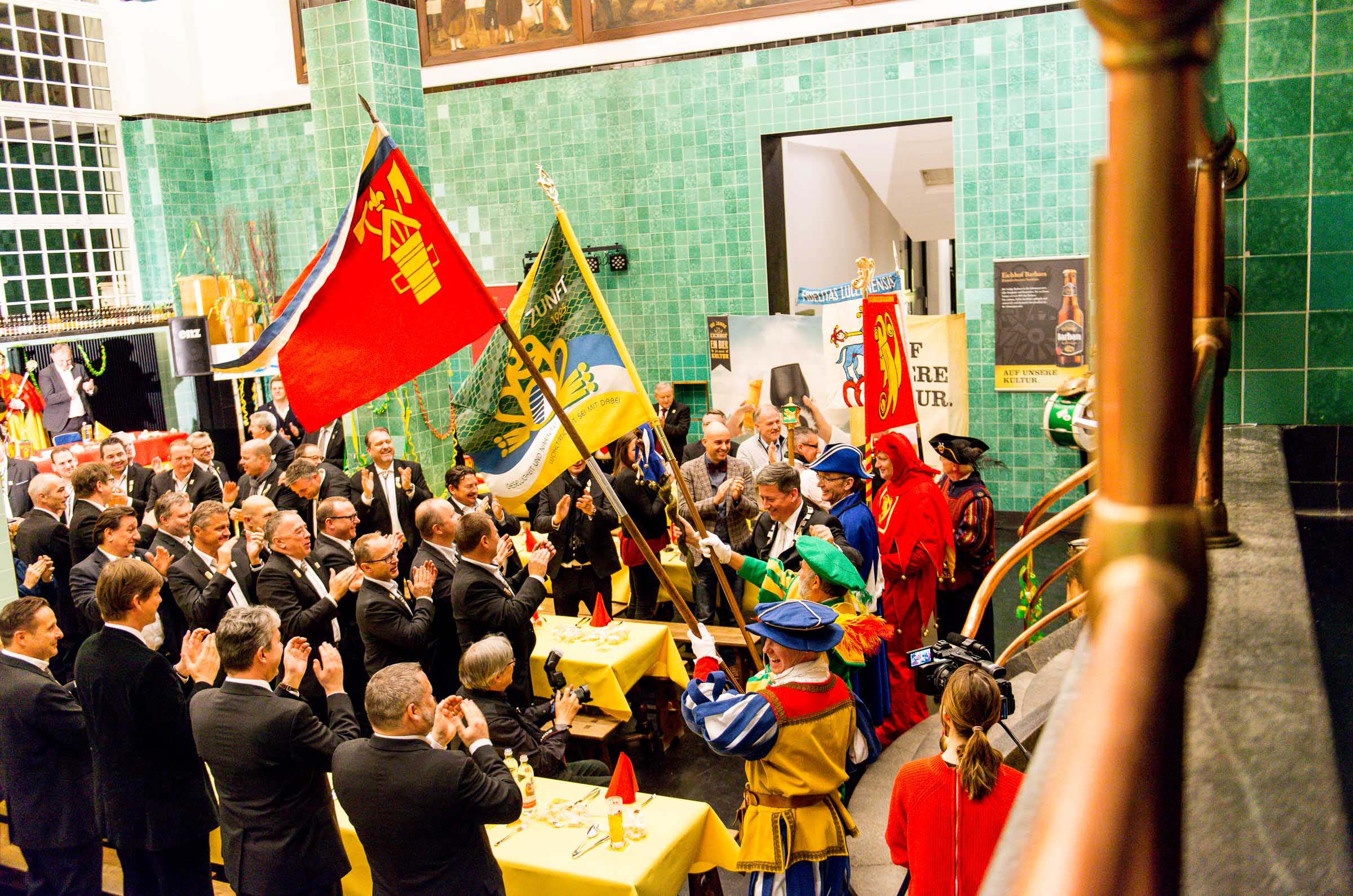 Vor dem grossen Einmarsch werden alle Details geprüft. Der Weibel hilft natürlich. Die Gäste sitzen, noch fehlen die Fasnachtsgewaltigen. Einmarsch mit Weibel und Bannerherr und Musik. Falls kein Fähndrich da ist, dann schreitet der Chef (LFK-Präsideten) gleich mit vier Bannerträgern in den Schalander ein. Man gönnt sich etwas.