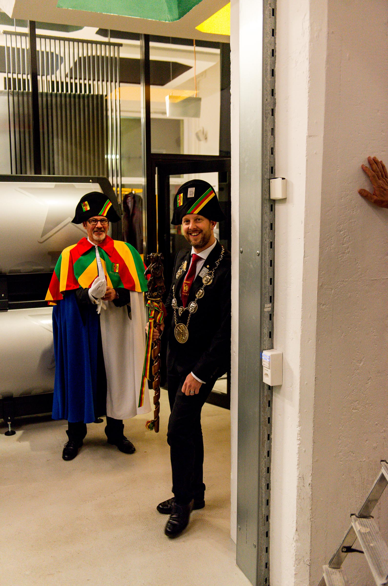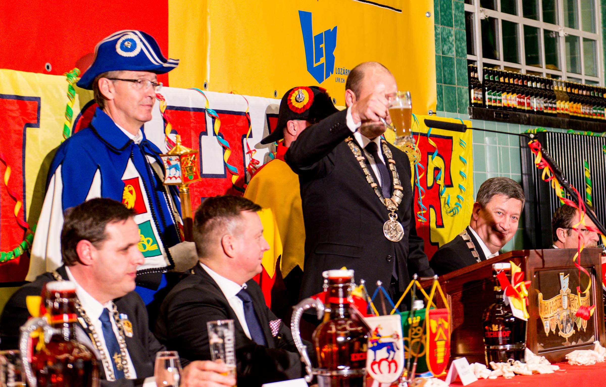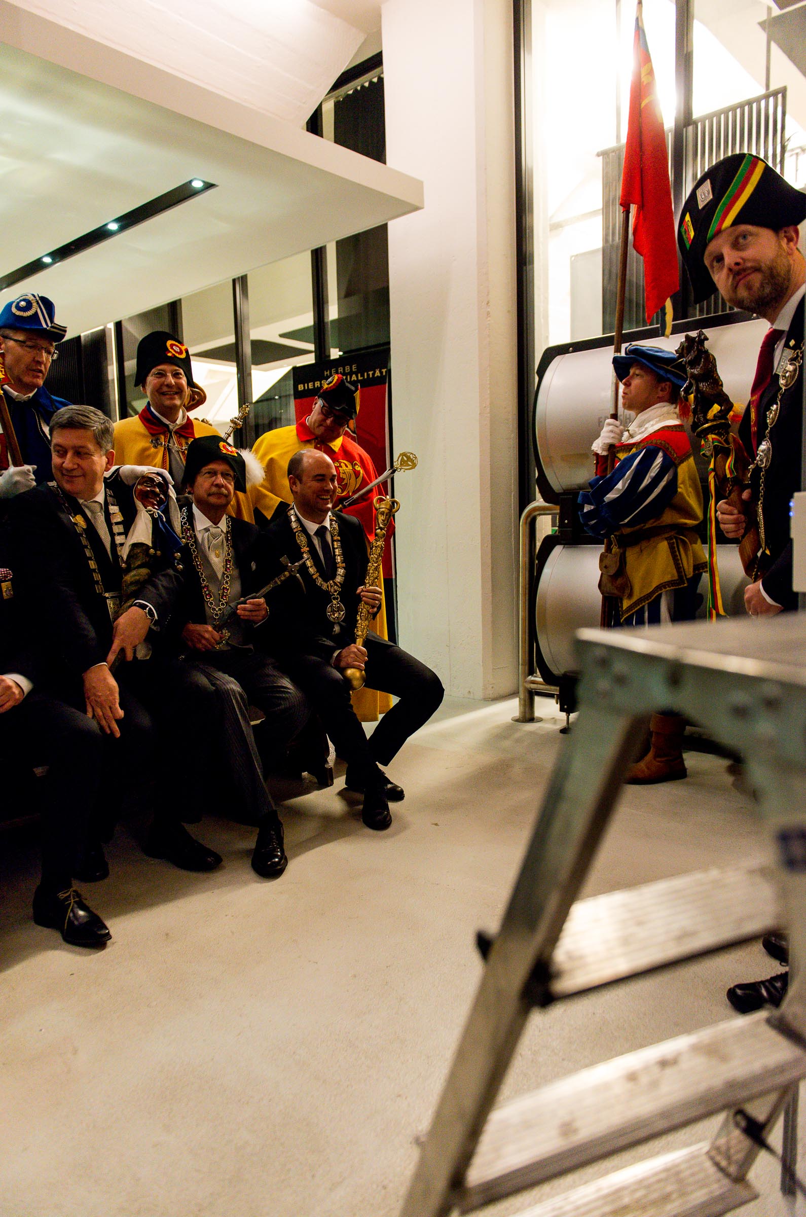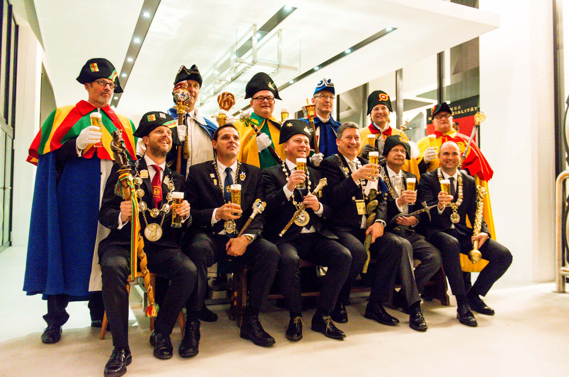 Vor dem grossen Einmarsch werden alle Details geprüft. Der Weibel hilft natürlich. Die Gäste sitzen, noch fehlen die Fasnachtsgewaltigen. Einmarsch mit Weibel und Bannerherr und Musik. Falls kein Fähndrich da ist, dann schreitet der Chef (LFK-Präsideten) gleich mit vier Bannerträgern in den Schalander ein. Man gönnt sich etwas.