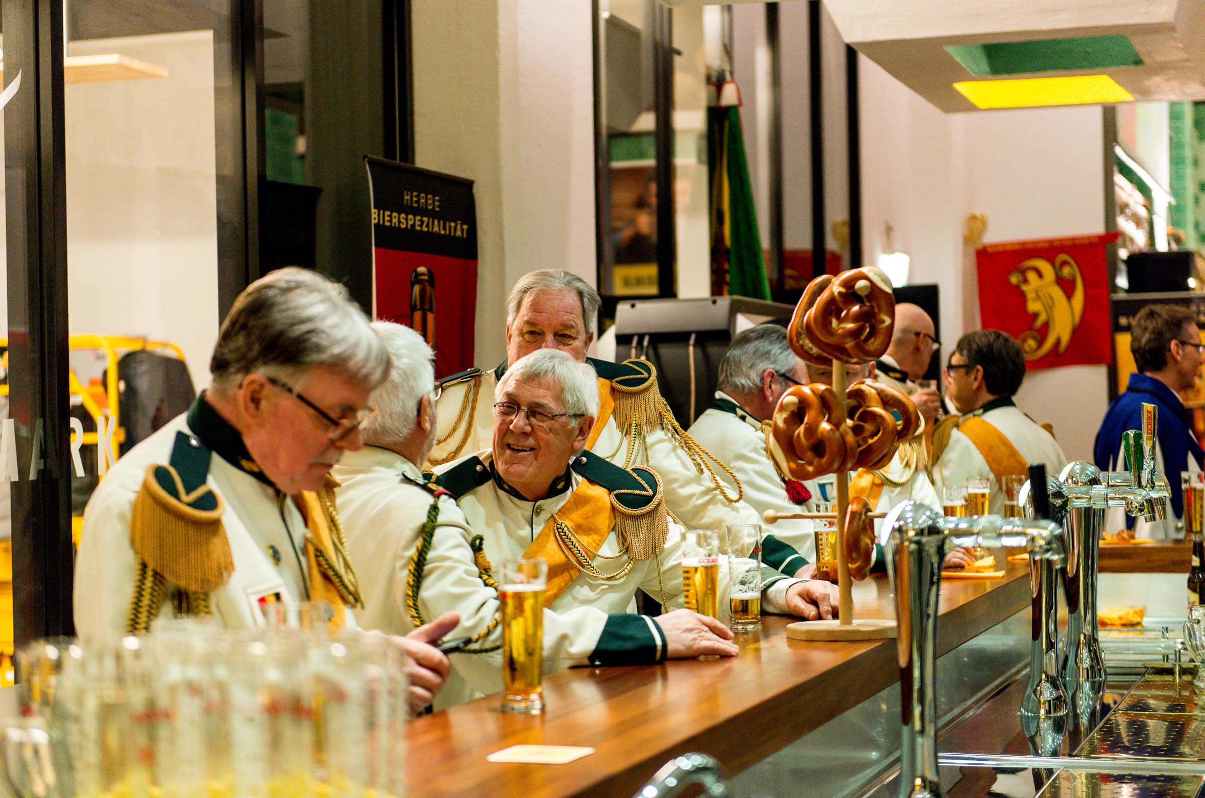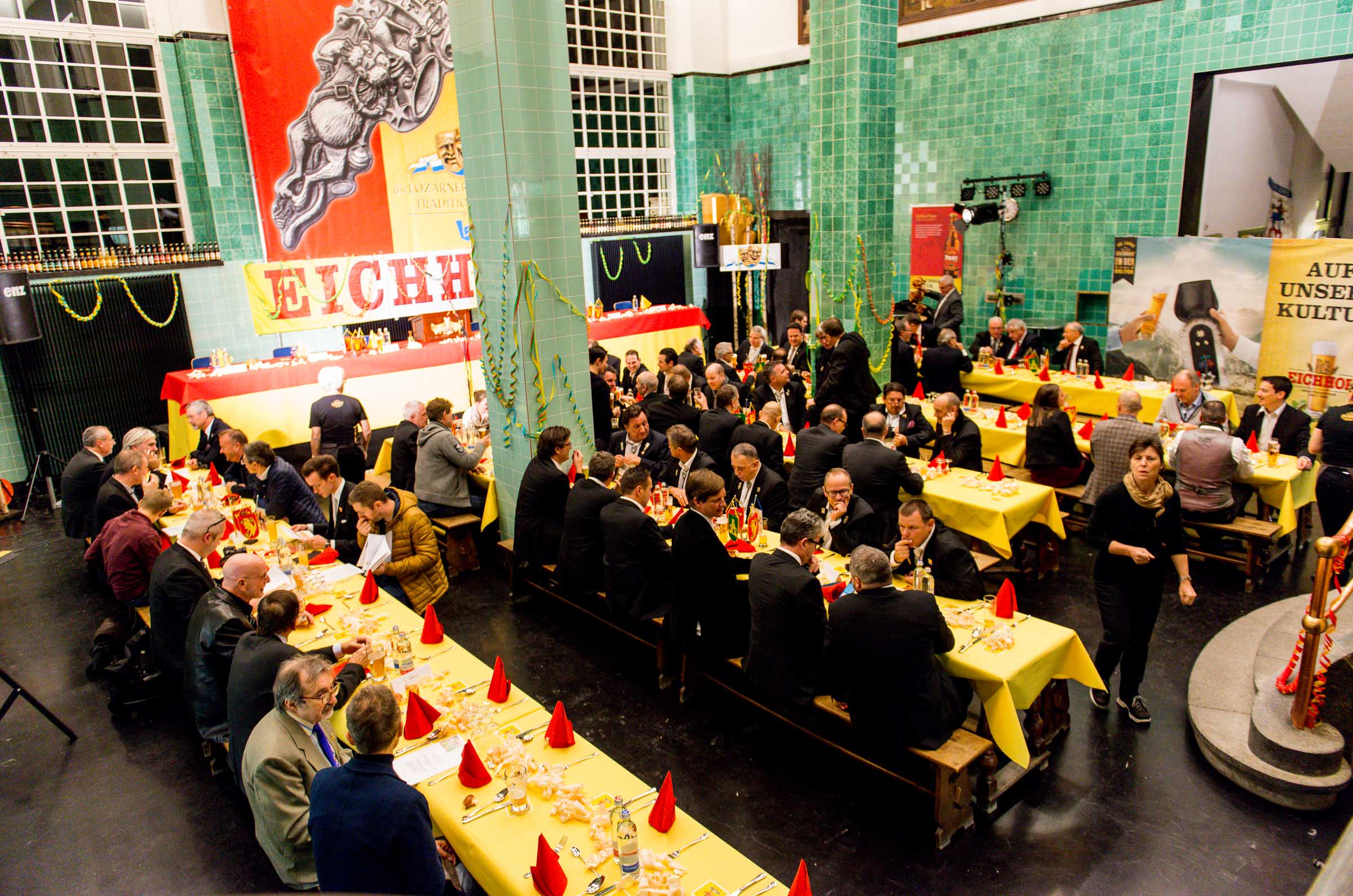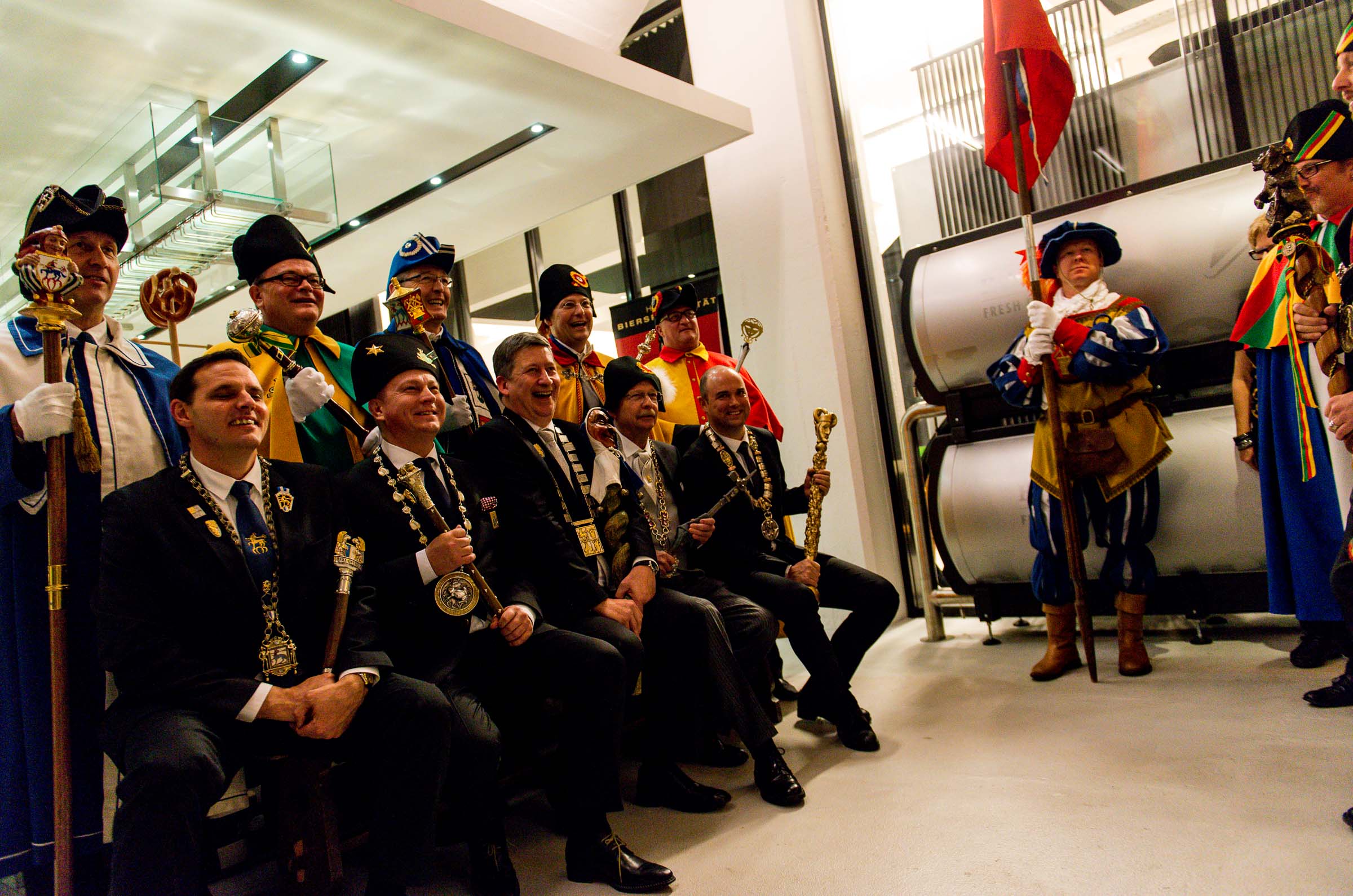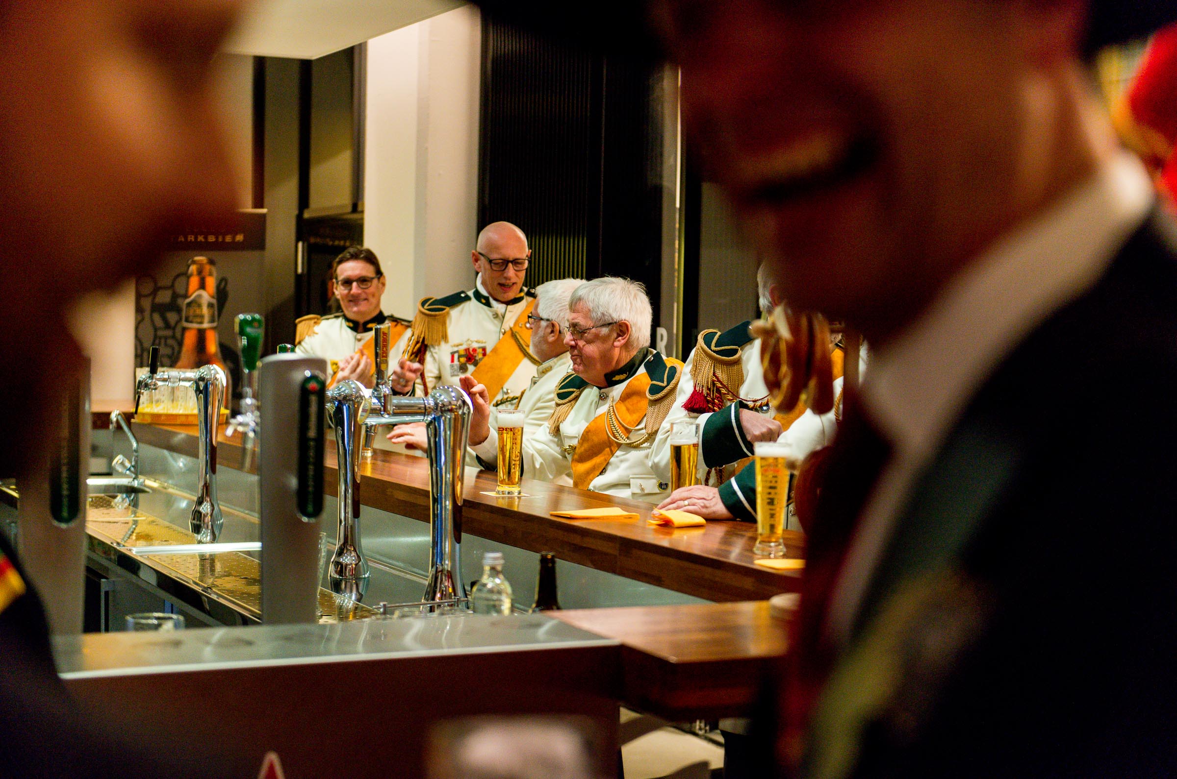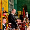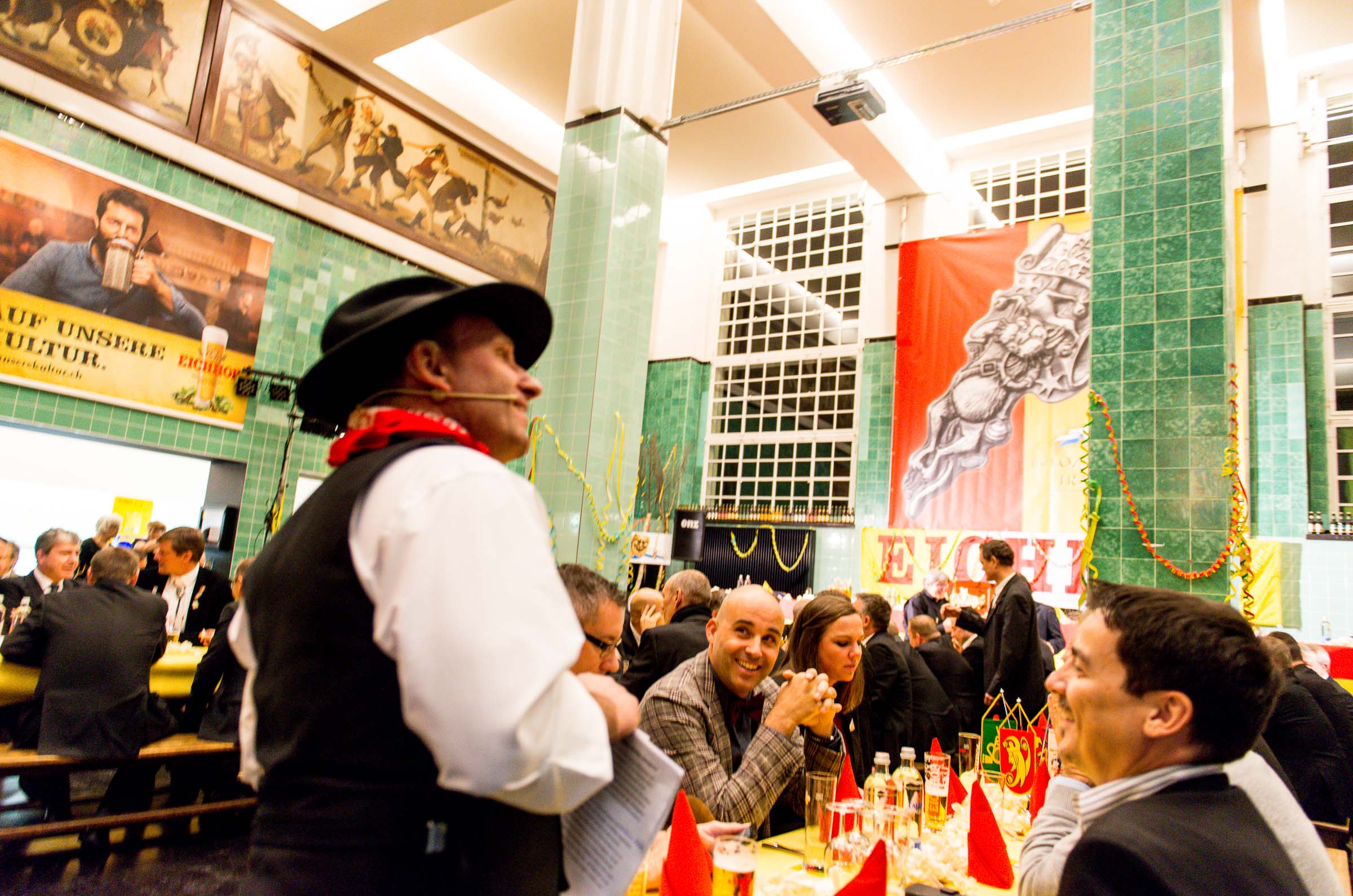 Vor dem grossen Einmarsch werden alle Details geprüft. Der Weibel hilft natürlich. Die Gäste sitzen, noch fehlen die Fasnachtsgewaltigen. Einmarsch mit Weibel und Bannerherr und Musik. Falls kein Fähndrich da ist, dann schreitet der Chef (LFK-Präsideten) gleich mit vier Bannerträgern in den Schalander ein. Man gönnt sich etwas.